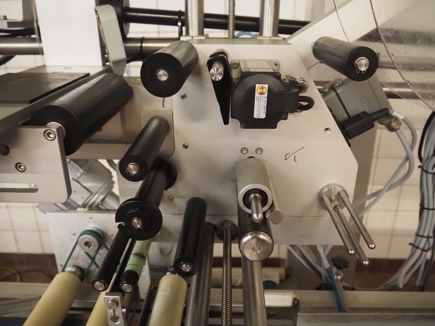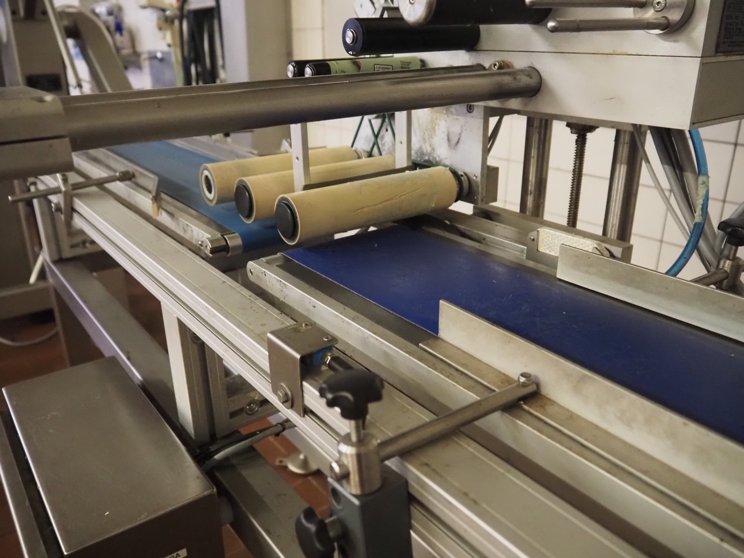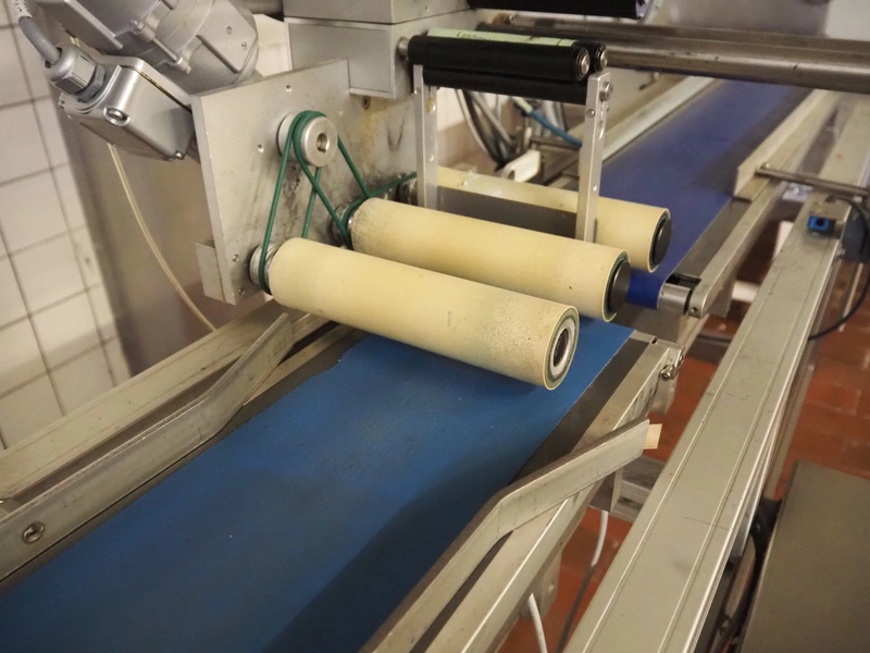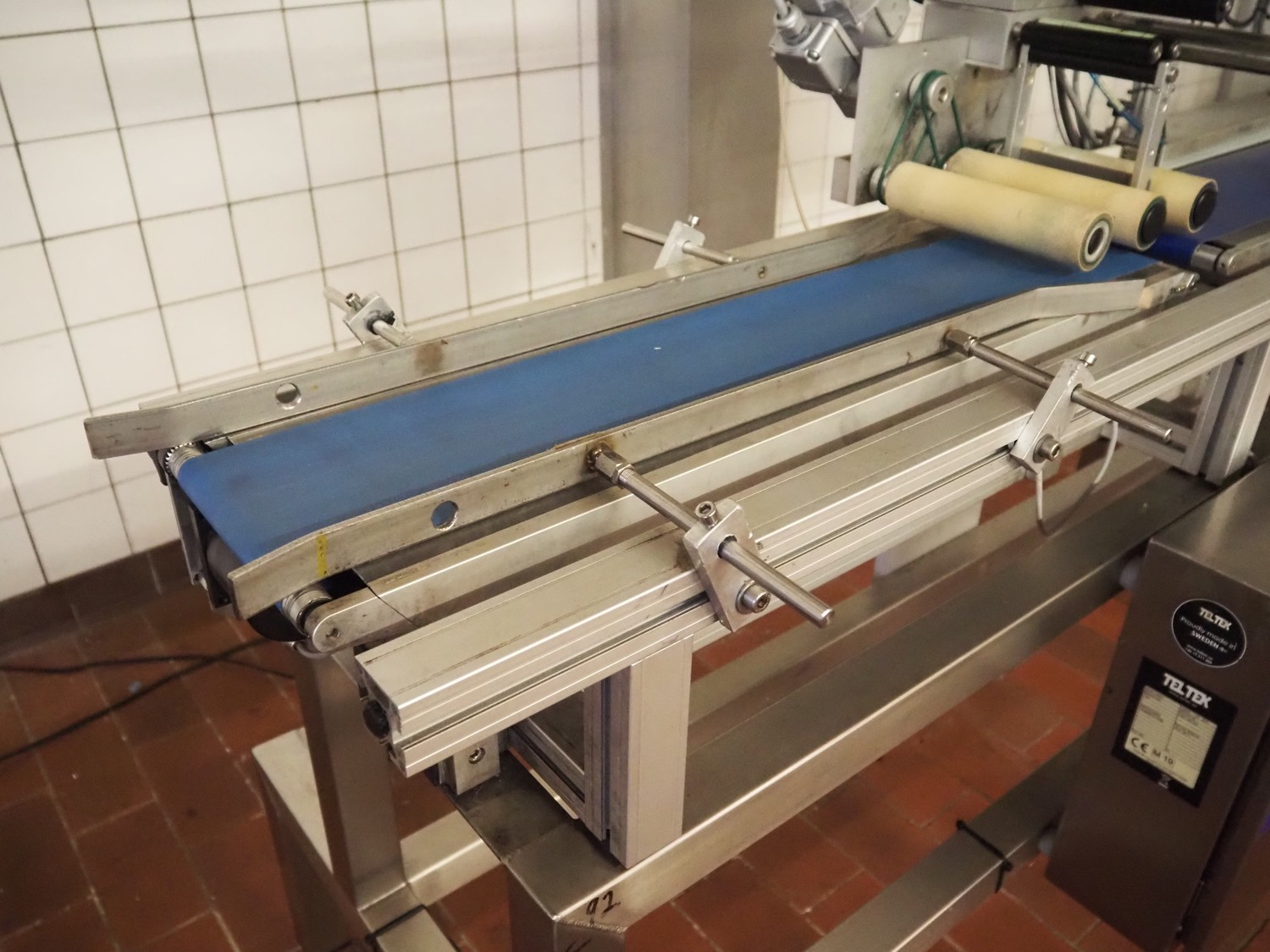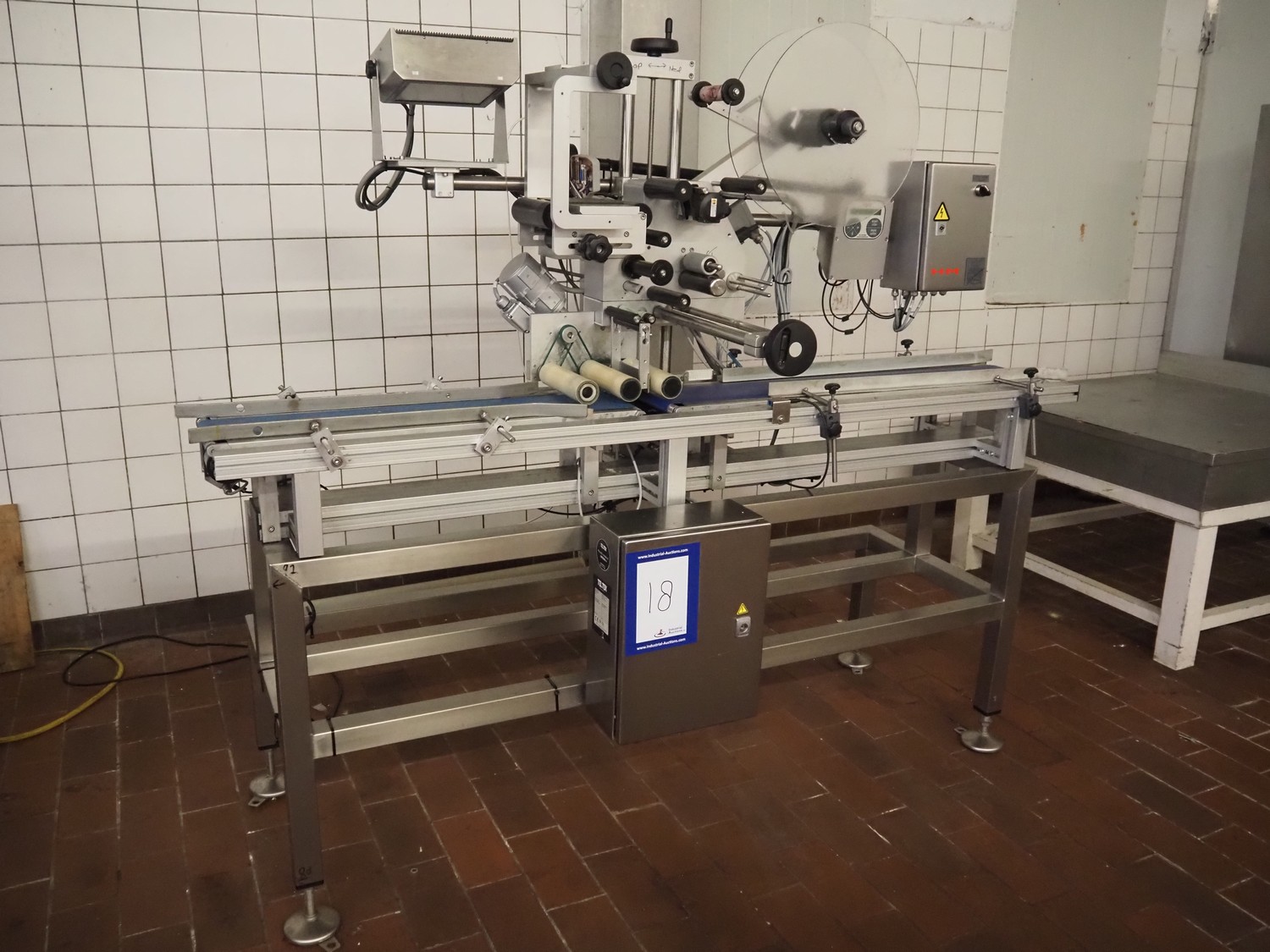 Teltek / HM Systems labelling machine, type: top bund etikettering, serial number: 44553-35-01, year of construction: 2019, 230 V, 50 Hz, 300 W, plastic belt, belt width: 145 mm, total dimensions: 1900 mm x 750 mm x 1750 mm.