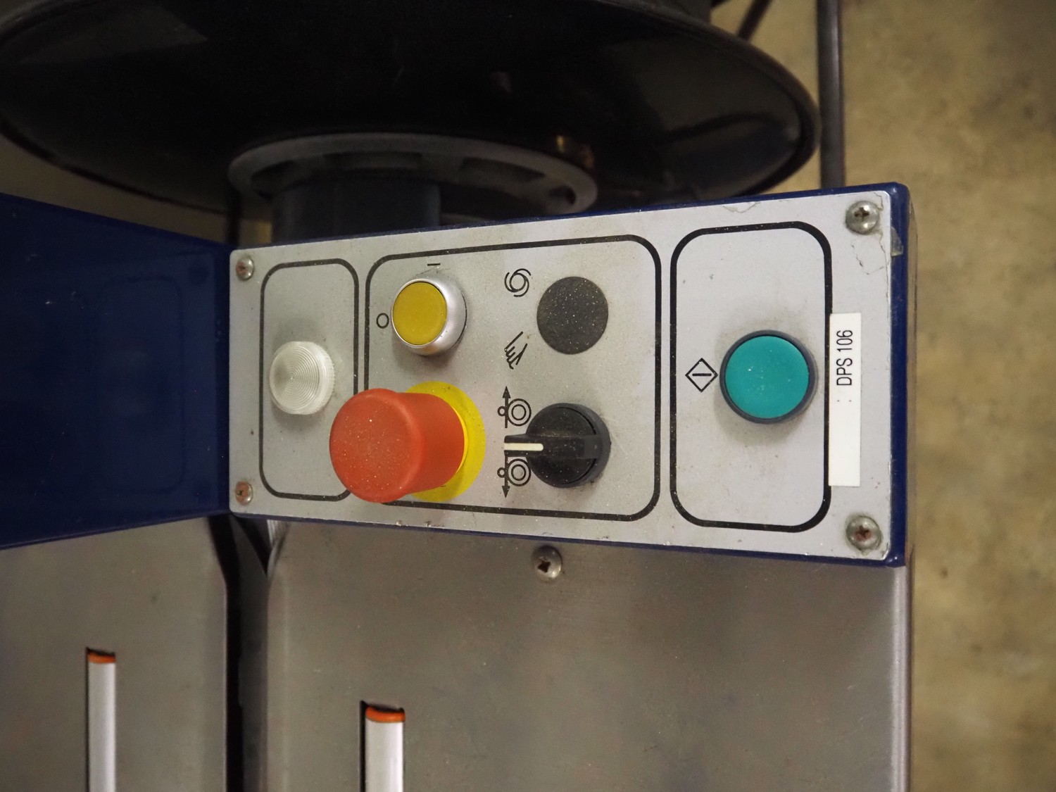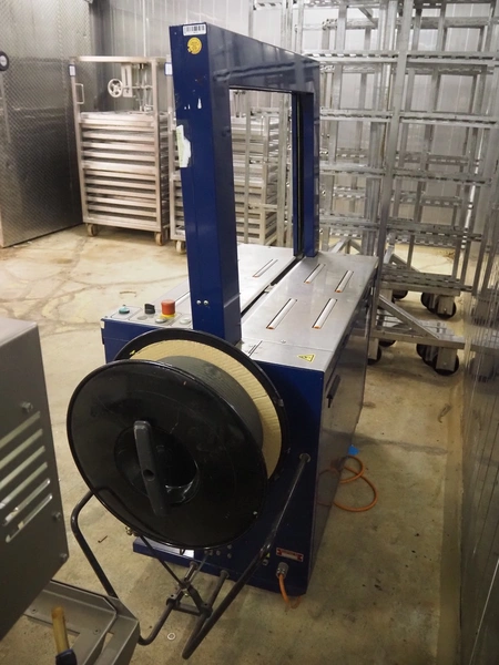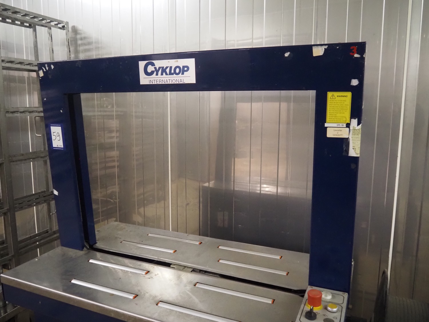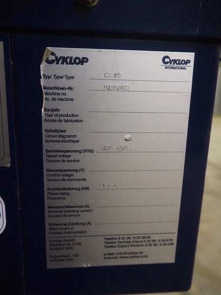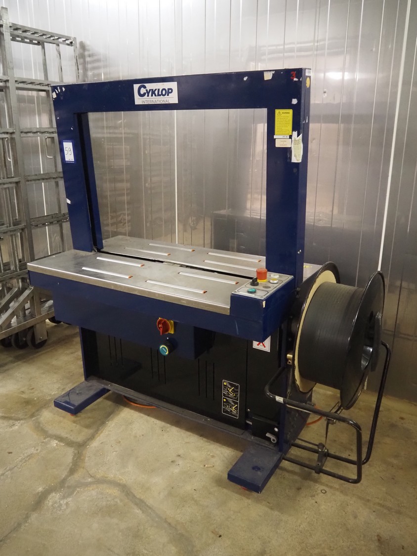 Cyklop mobile strapping machine, type: CD80, machine number: 02302077, 230 V, 50 Hz, 1 KVA, clearance: 870 mm x 605 mm, total dimensions: 1430 mm x 600 mm x 1550 mm.