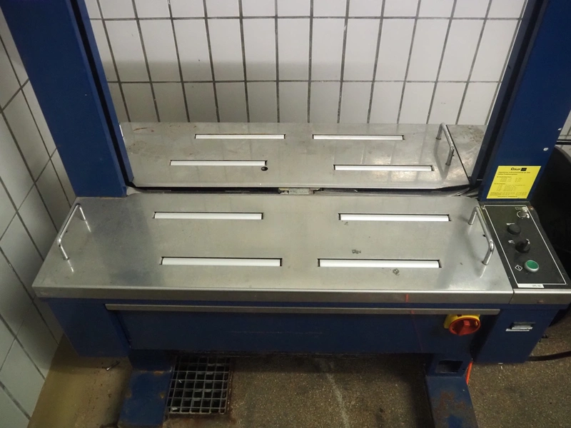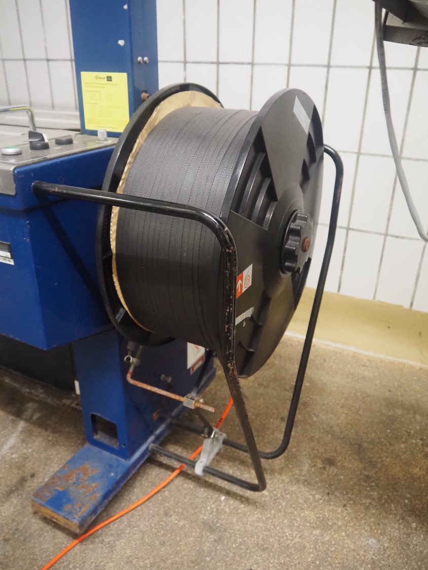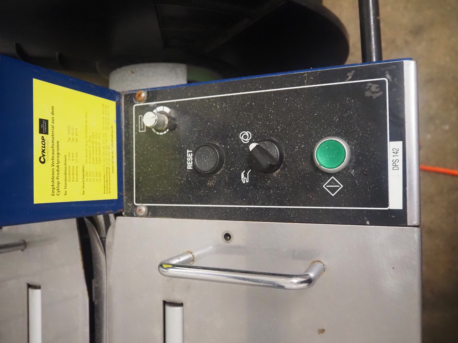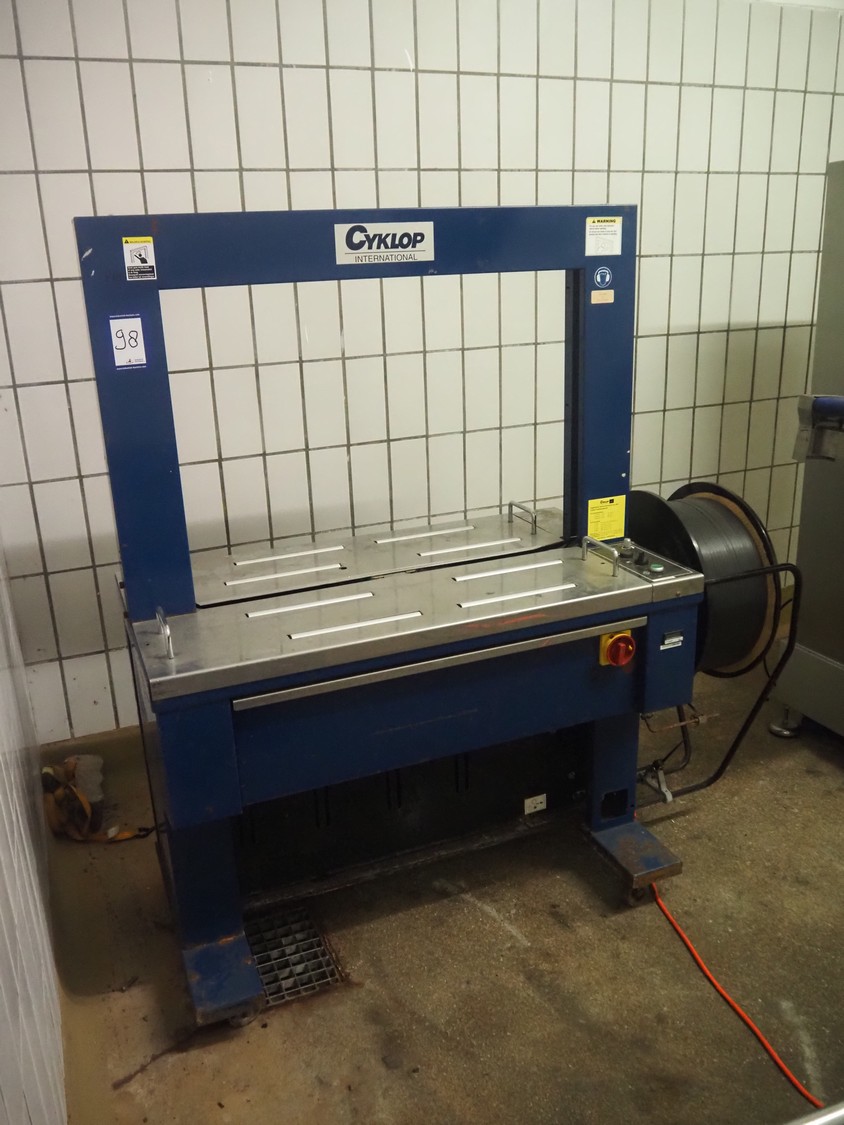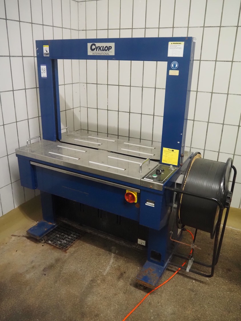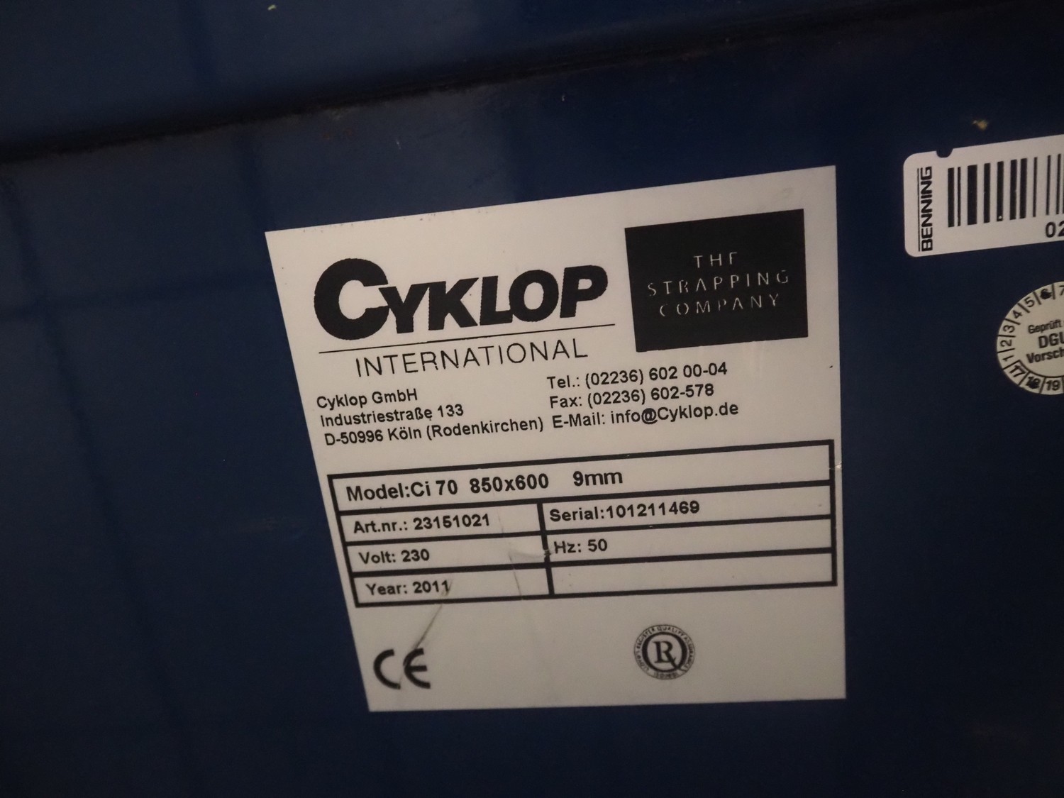 Cyklop mobile strapping machine, model: Ci 70, serial number: 101211469, year of construction: 2011, 230 V, 50 Hz, working width: 870 mm x 605 mm, total dimensions: 1430 mm x 600 mm x 1550 mm.