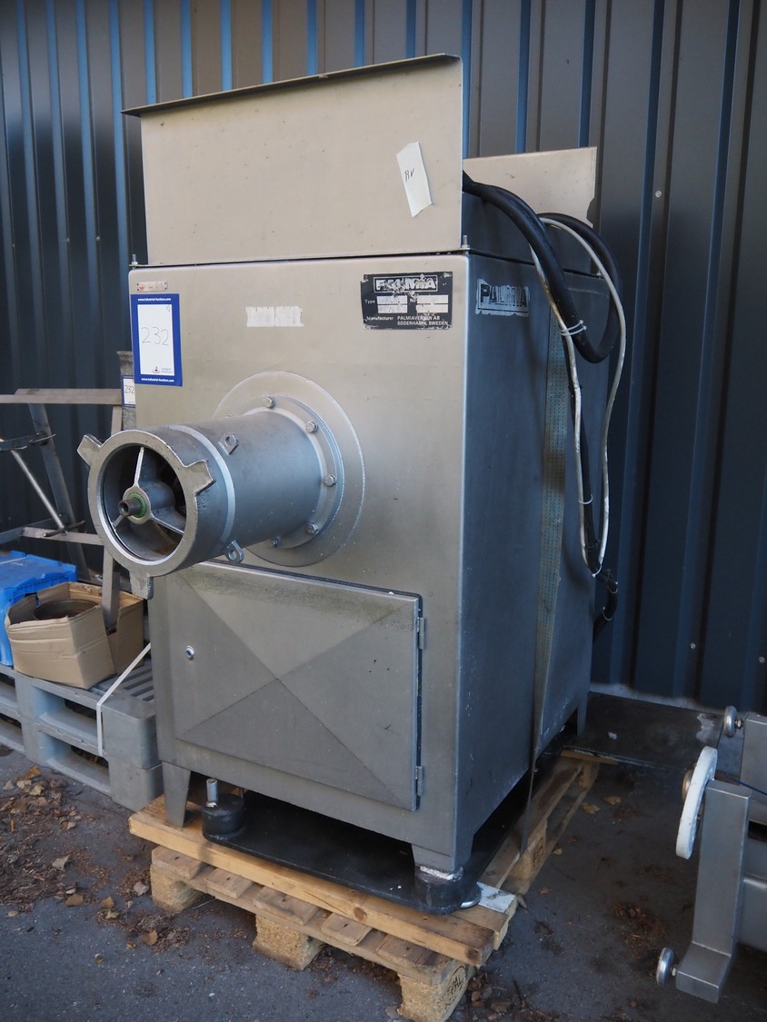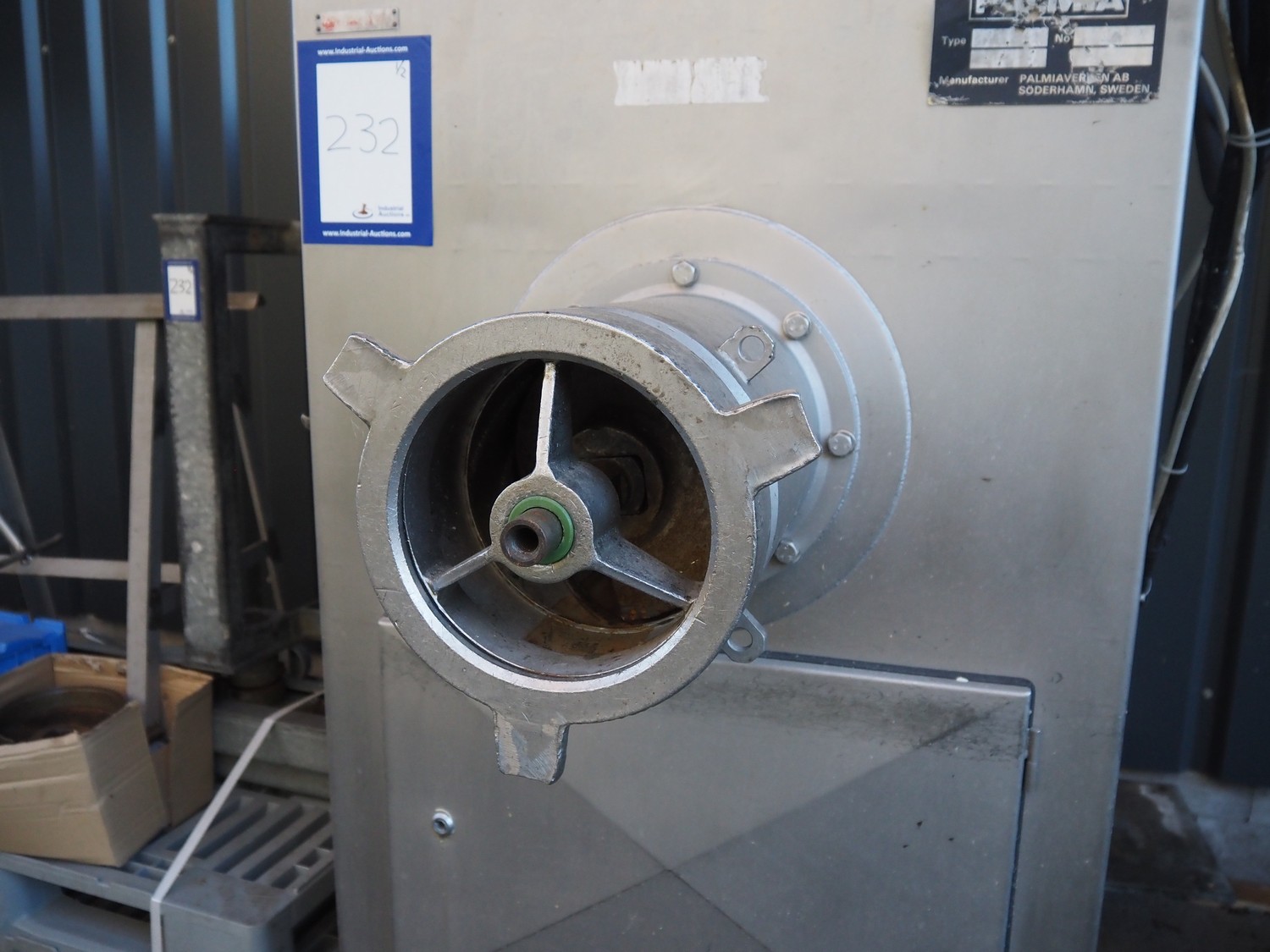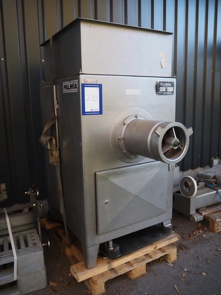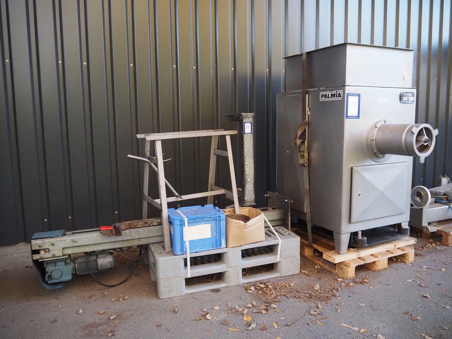 Palmia grinder, type: P207520, number: 4421, diameter plate: 210 mm, total dimensions: 1450 mm x 830 mm x 1680 mm. Including lifter for 200 liter meat bins, elevating height: 1550 mm, total dimensions 2050 mm x 1200 mm x 1400 mm and box with plates. Lot located in Winsen (DE), viewing and pick up in consultation with Industrial Auctions B.V.