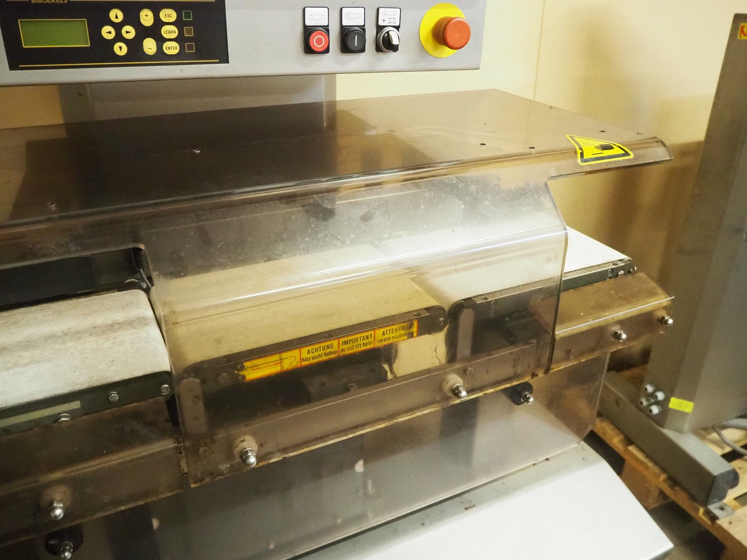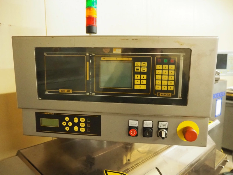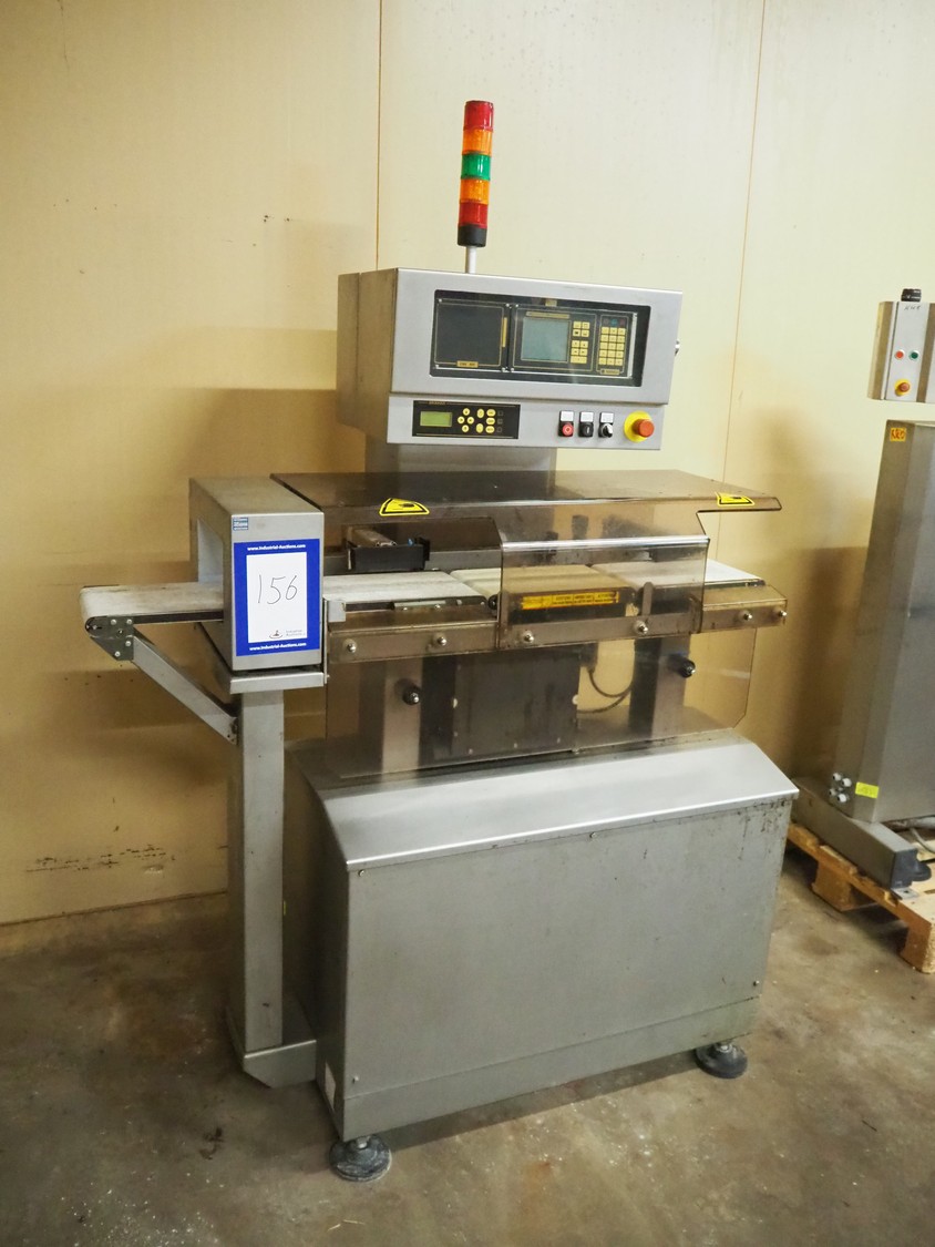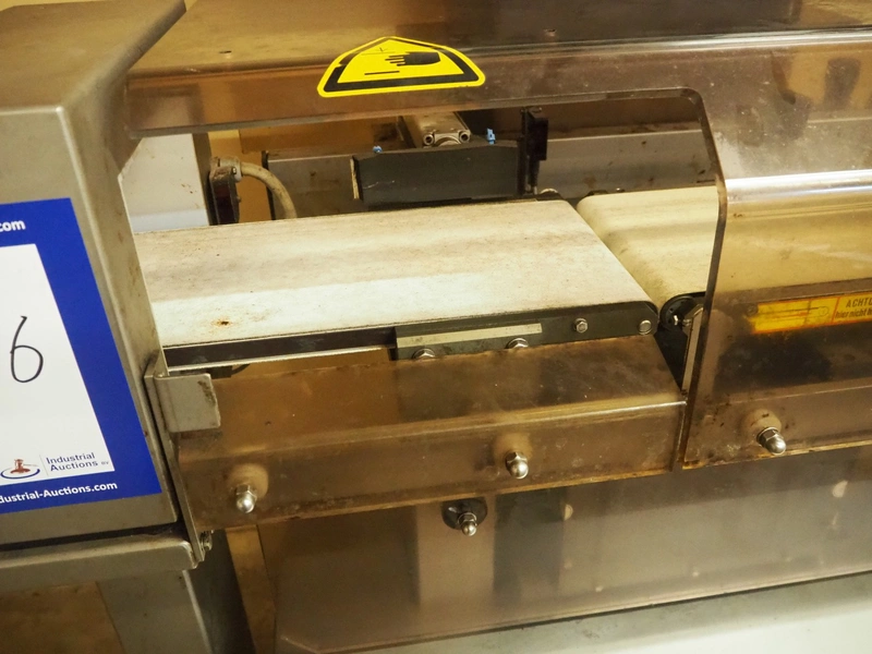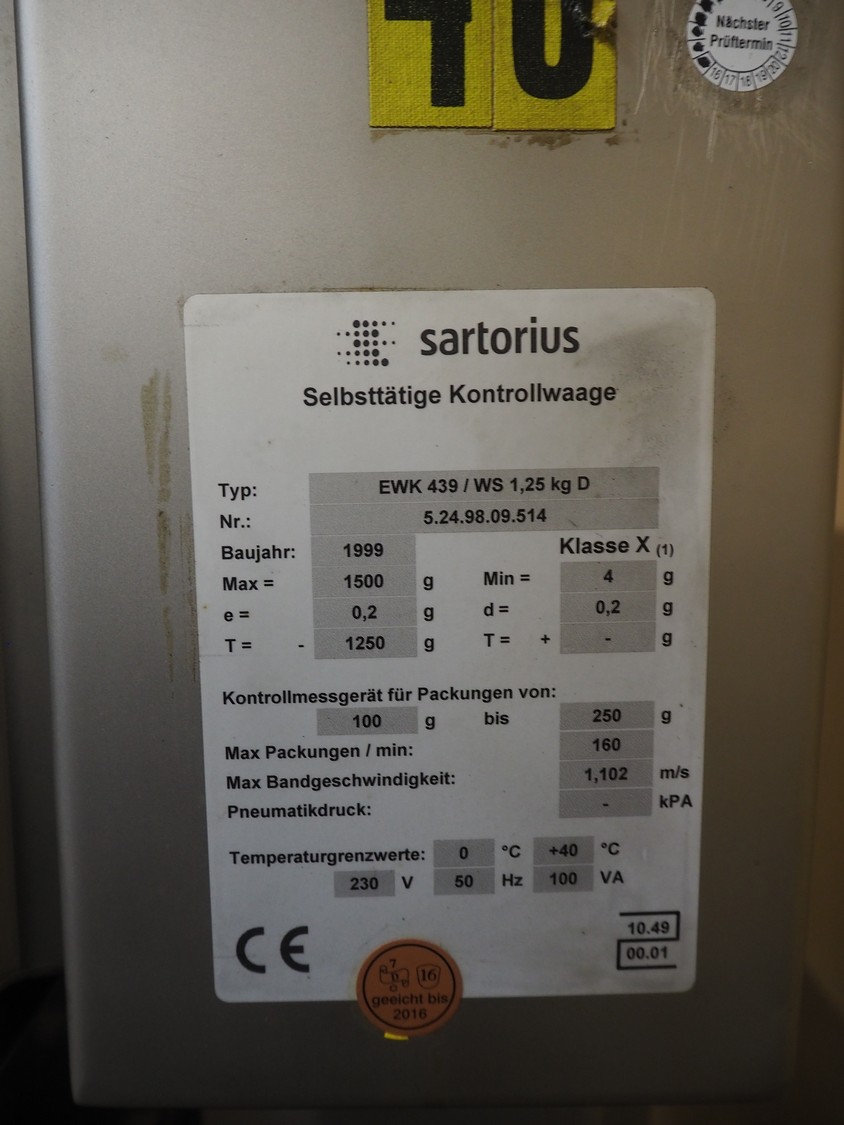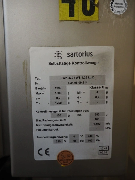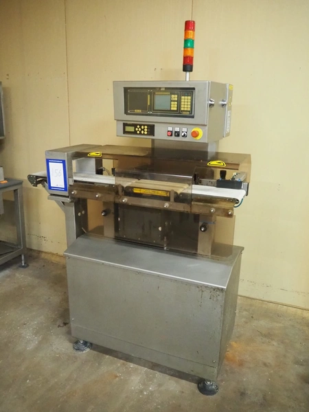 Mesutronic mobile metal detector with Satorius checkweigher and rejector, type metal detector: Matron 2.20 500x100, plastic belt, belt width: 400 mm, clearance: 410 mm x 70 mm, type checkweigher: EWK 439 / WS 1.25 kg D, number: 5.24.98.09.514, year of construction: 1999, maximum capacity: 1500 g, minimum capacity: 4 g, e=d= 0.2 g, T= 1250 g, total dimensions: 1500 mm x 930 mm x 1020 mm.