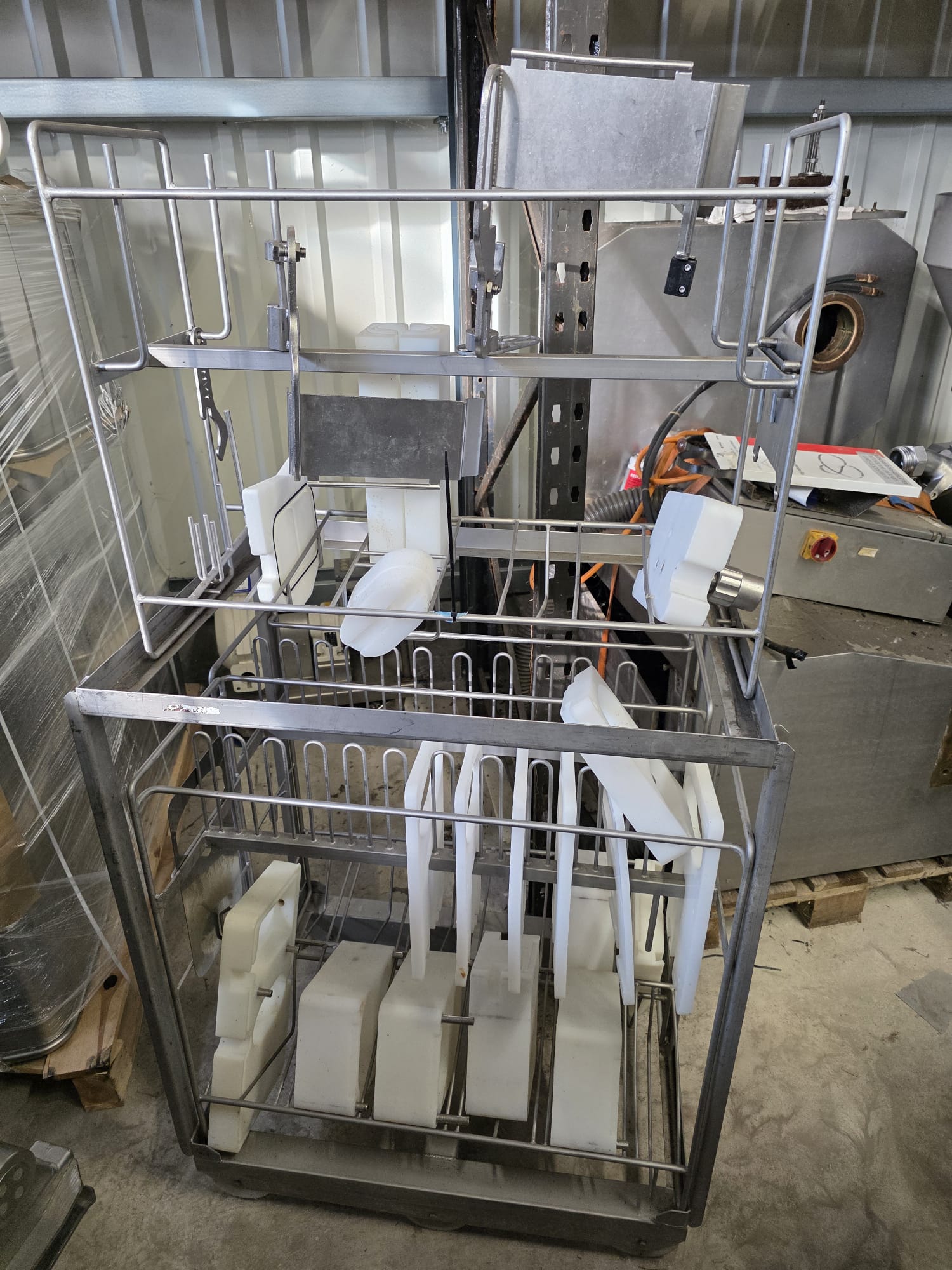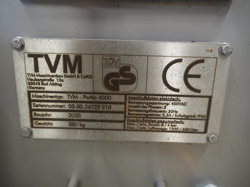 TVM Maschinenbau GmbH & Co KG mobile portioning machine, type: TVM-Portio 4000, serial number: 05-00.26725218, year of construction: 2000, 400 V, 3 Ph, 50 Hz, 2.5 A, weight: 380 kg, plastic belt, belt width: 205 mm, total dimensions: 1800 mm x 1040 mm x 2320 mm. Including trolley with extra parts. Lot located in Winsen (DE), viewing and pick up in consultation with Industrial Auctions B.V.