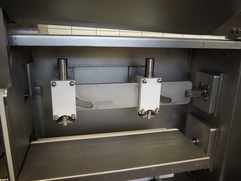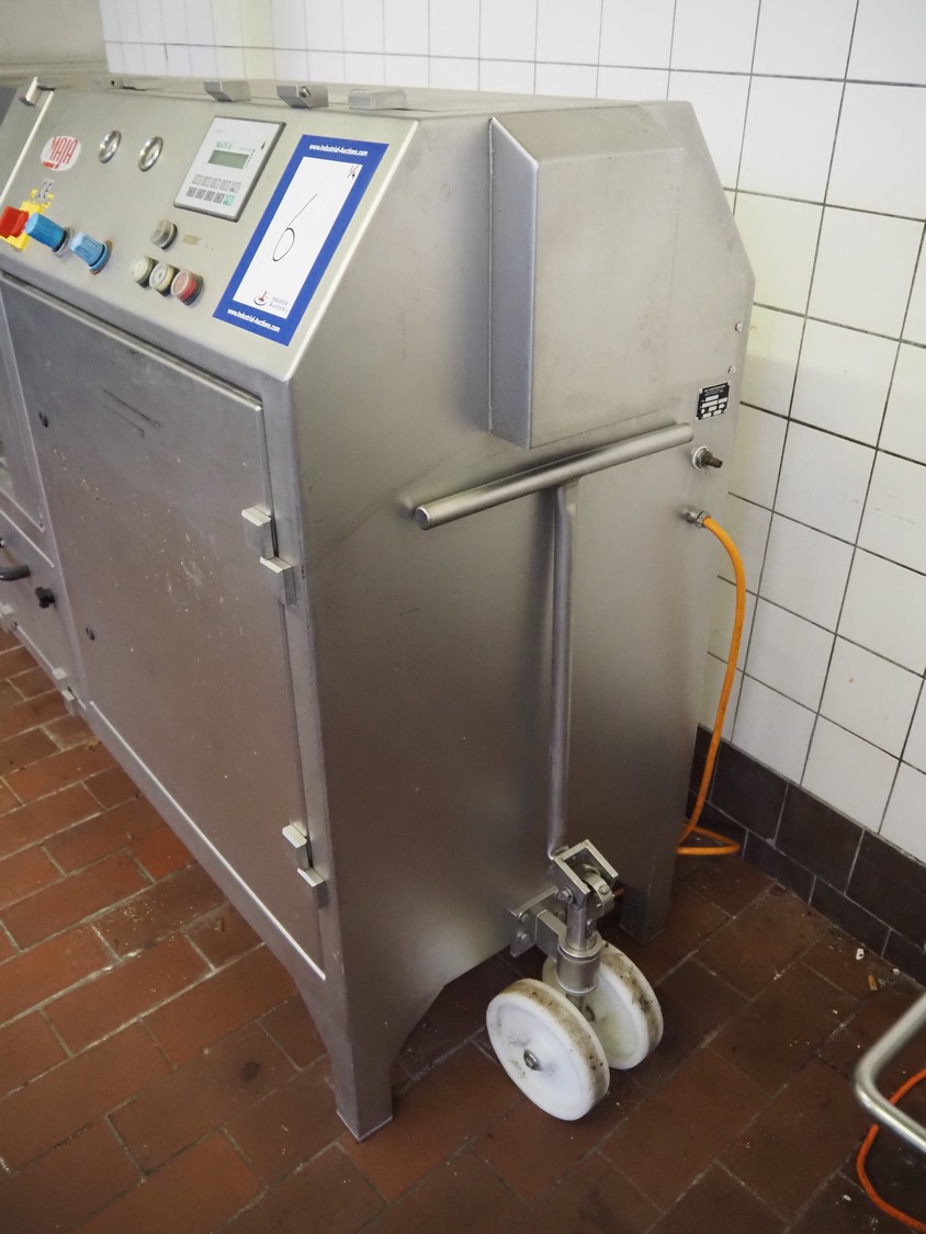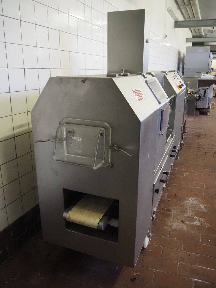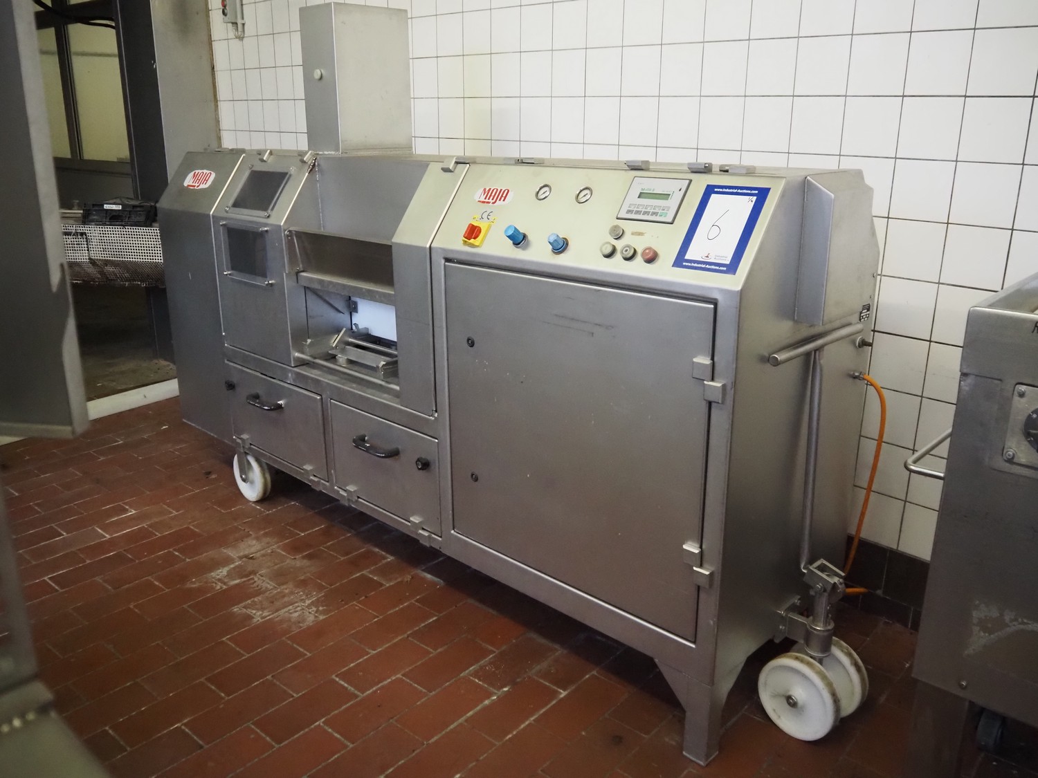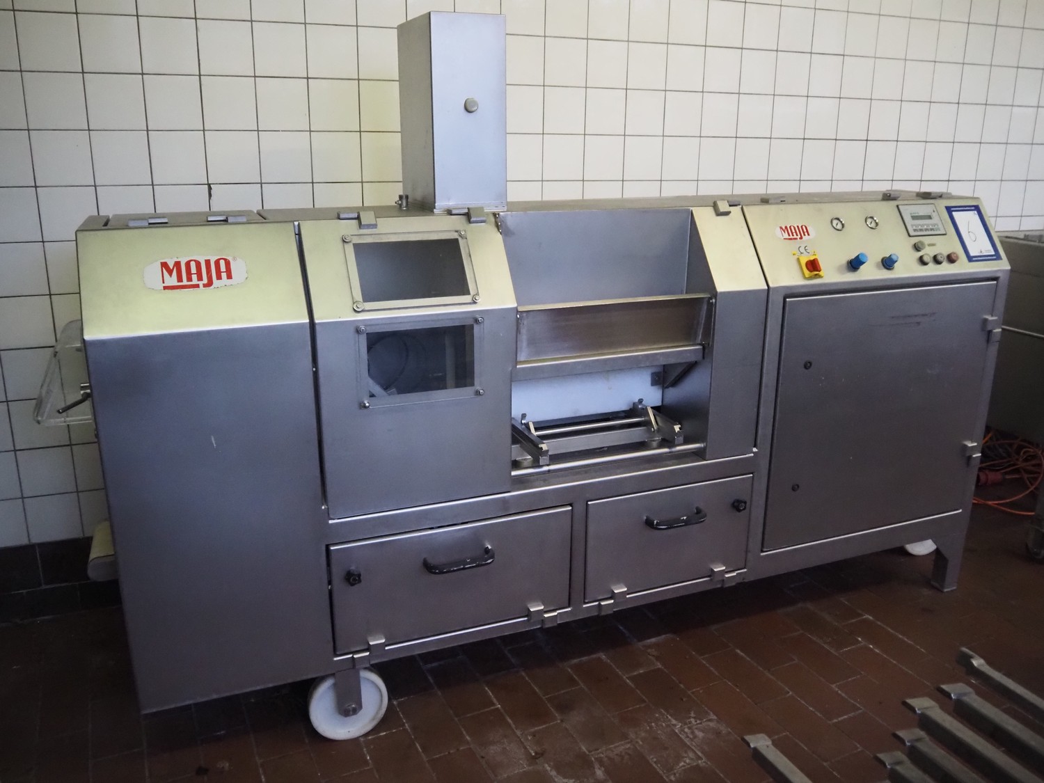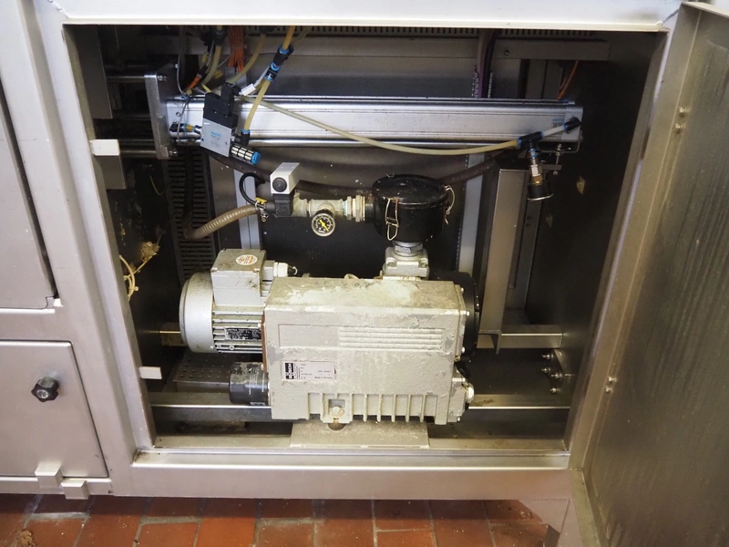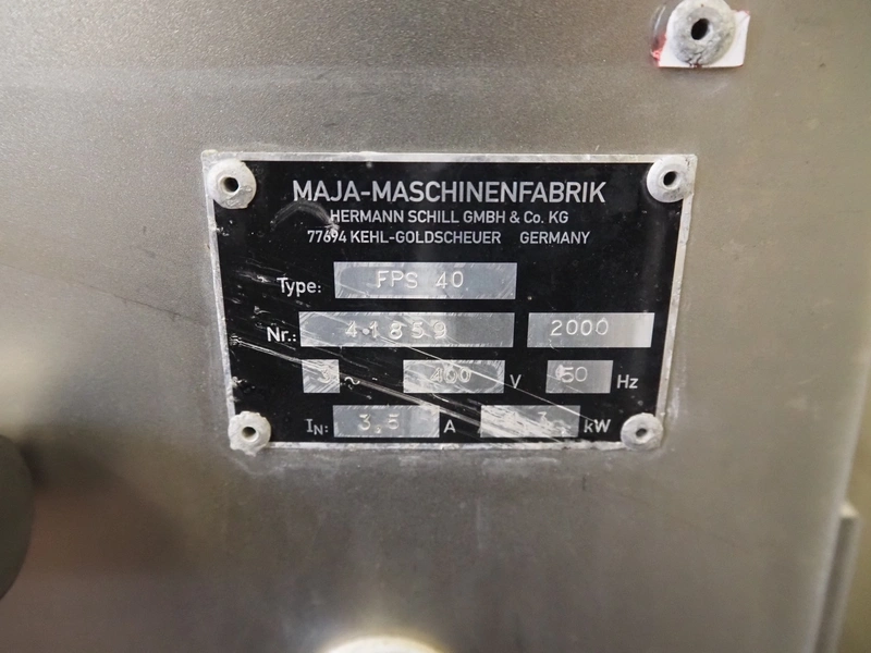 Maja-Maschinenfabrik mobile portion cutter, type: FPS 40, serial number: 41859, year of construction: 2000, 400 V, 3 Ph, 50 Hz, 3.5 A, 1.3 kW, Busch vacuum pump, type: RC 0025 E 501, number: 00031553, capacity: 25 m³ per hour, belt width: 200 mm, total dimensions: 2700 mm x 750 mm x 1700 mm. Including 2 crates with moulds and spare parts.