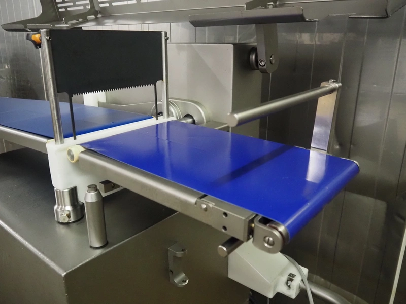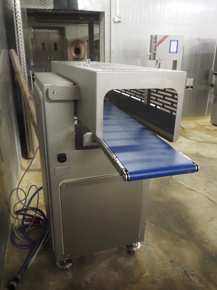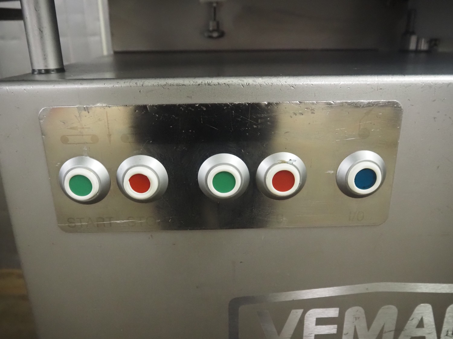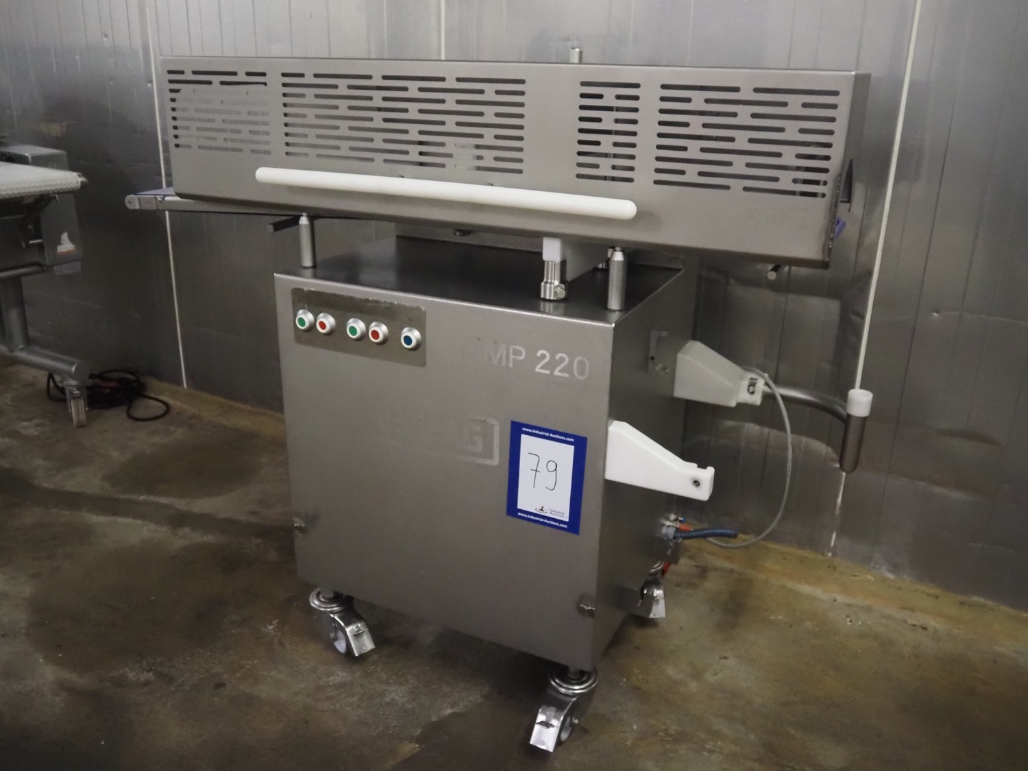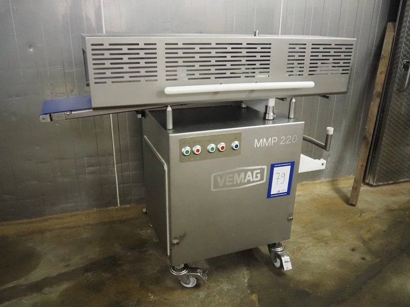Vemag mobile portioning machine, model: MMP 220, number: 2200474, year of construction: 2013, 400/460 V, 3 Ph, 60/60 Hz, 3.5 A, 1.5 kW, weight: 335 kg, plastic belt, belt width: 250 mm, working width: 210 mm, total dimensions: 1600 mm x 600 mm x 1270 mm.