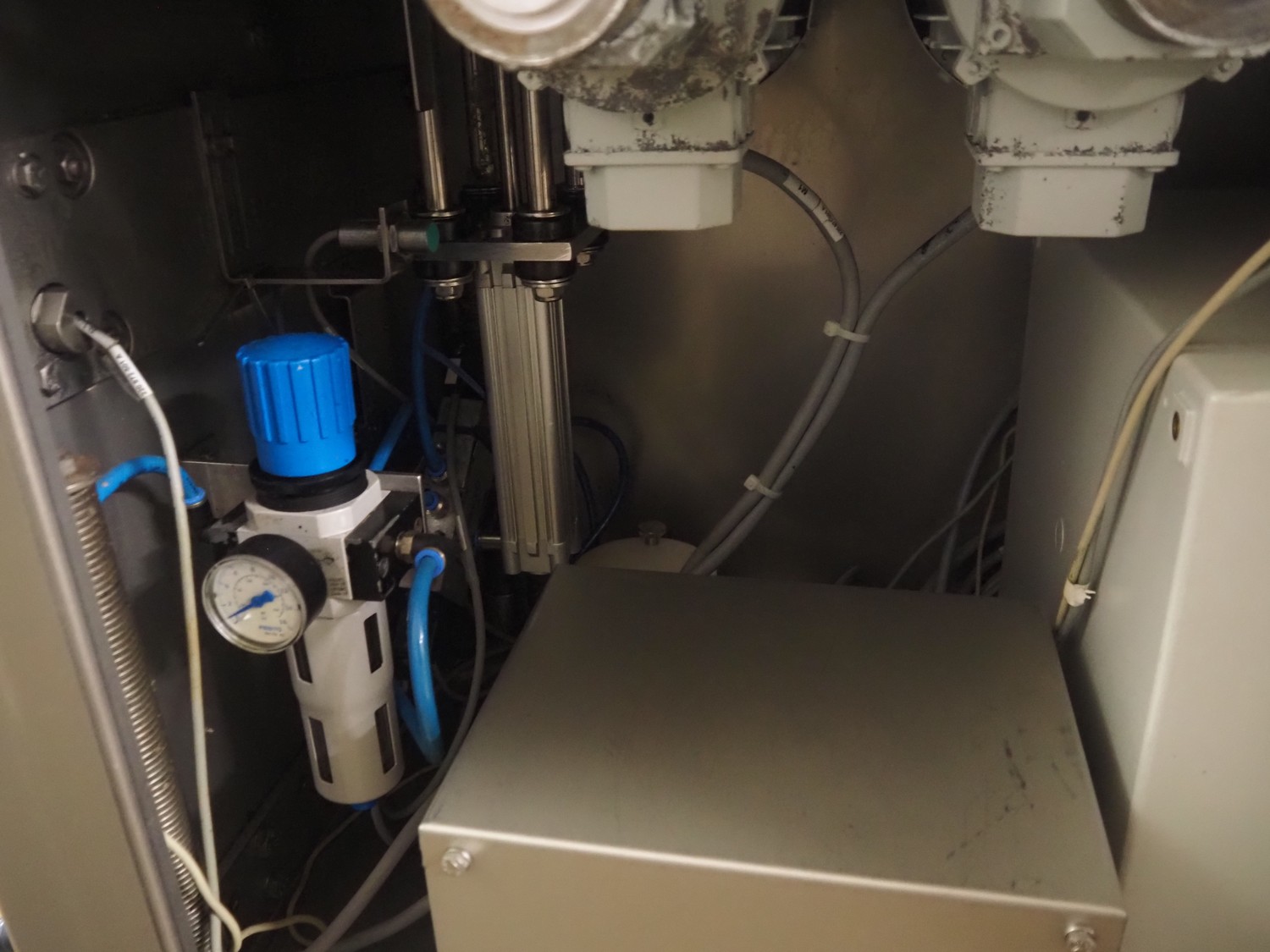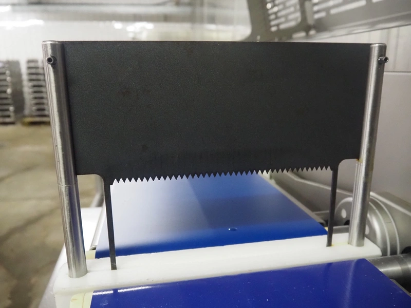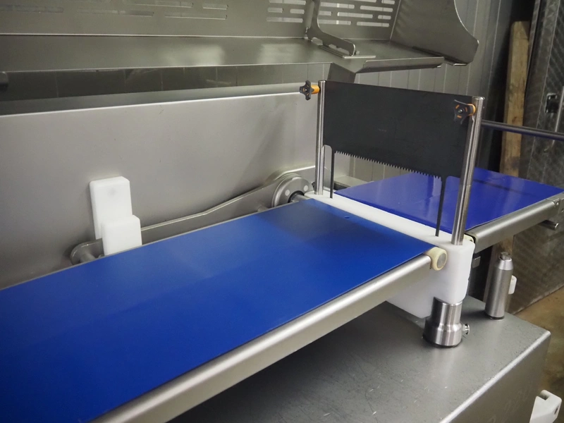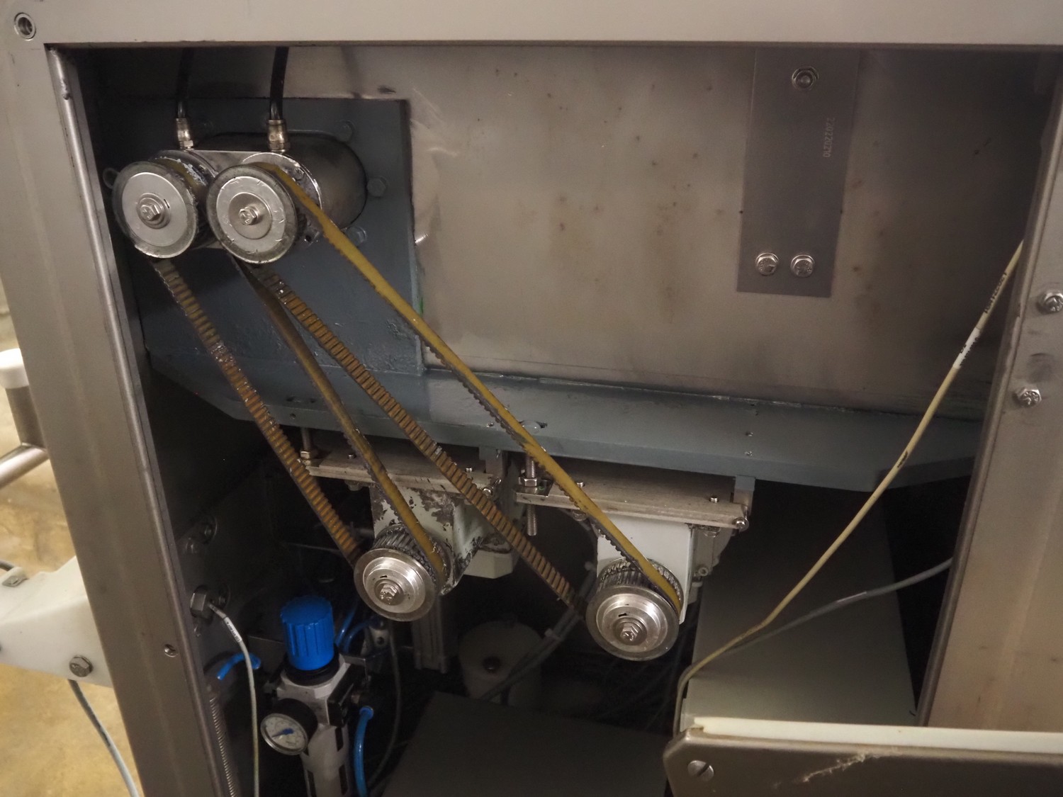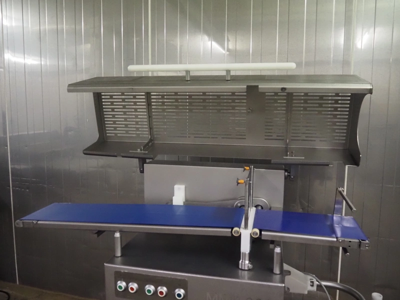 Vemag mobile portioning machine, model: MMP 220, number: 2200474, year of construction: 2013, 400/460 V, 3 Ph, 60/60 Hz, 3.5 A, 1.5 kW, weight: 335 kg, plastic belt, belt width: 250 mm, working width: 210 mm, total dimensions: 1600 mm x 600 mm x 1270 mm.