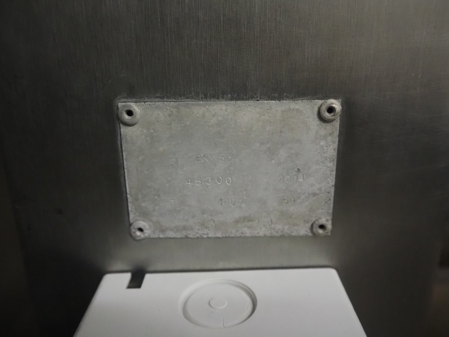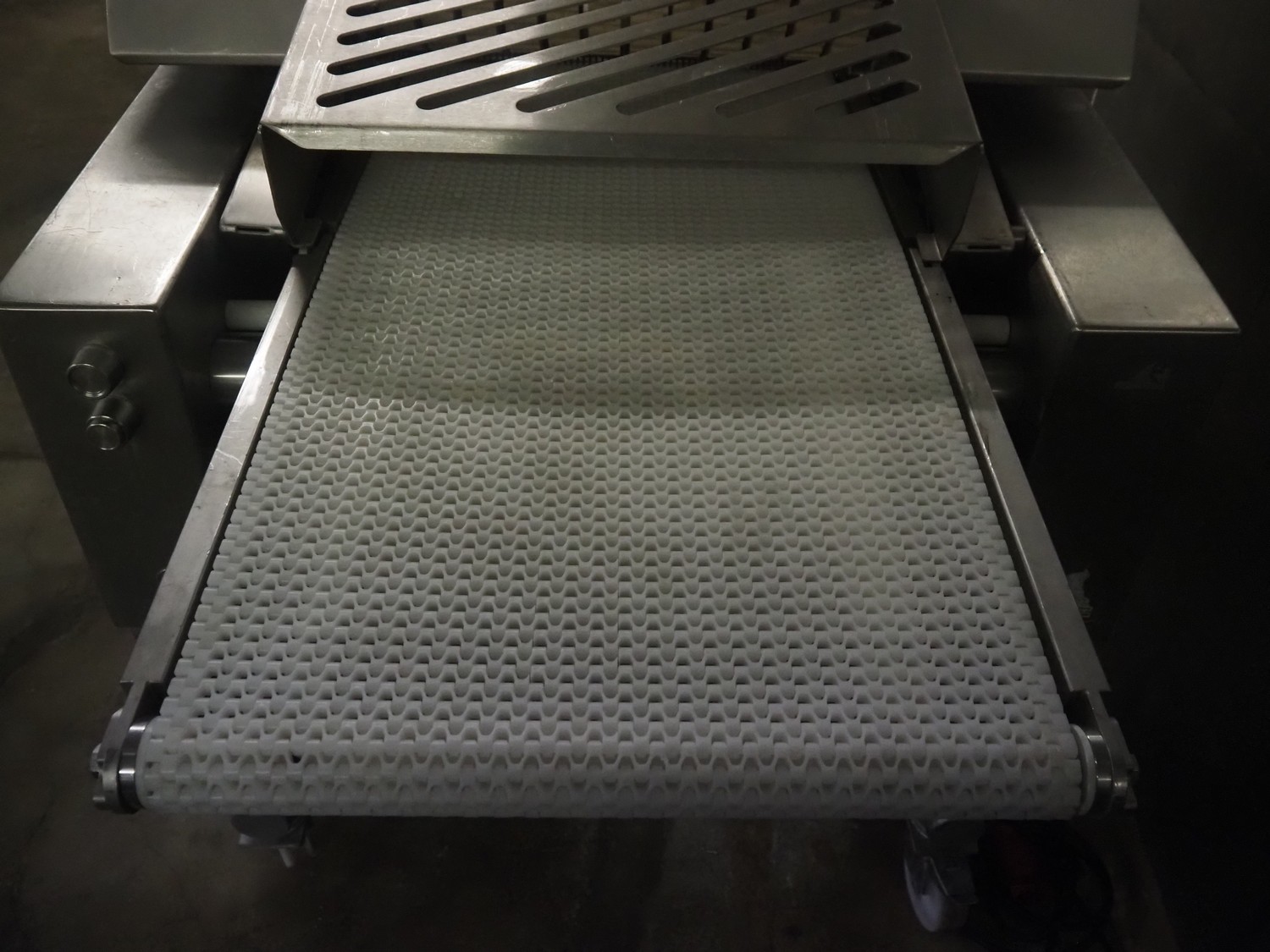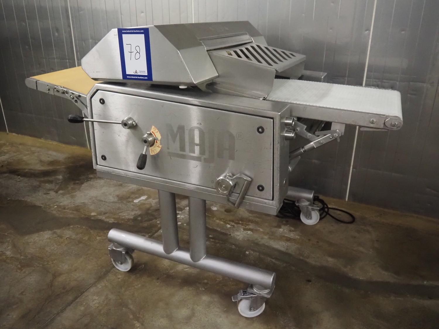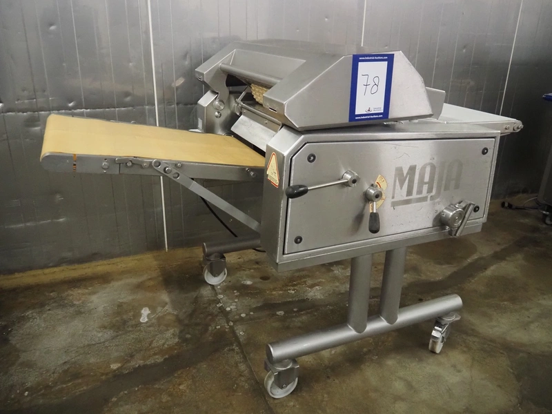 Maja-Maschinenfabrik mobile skinning and derinding machine, type: BXM 554, number: 45300, year of construction: 2004, 400 V, 3 Ph, 50 Hz, 2.8 A, 1.1 kW, plastic mesh belt, belt width: 500 mm, working width: 535 mm, plastic belt, belt width: 505 mm, total dimensions: 1900 mm x 1150 mm x 1250 mm.