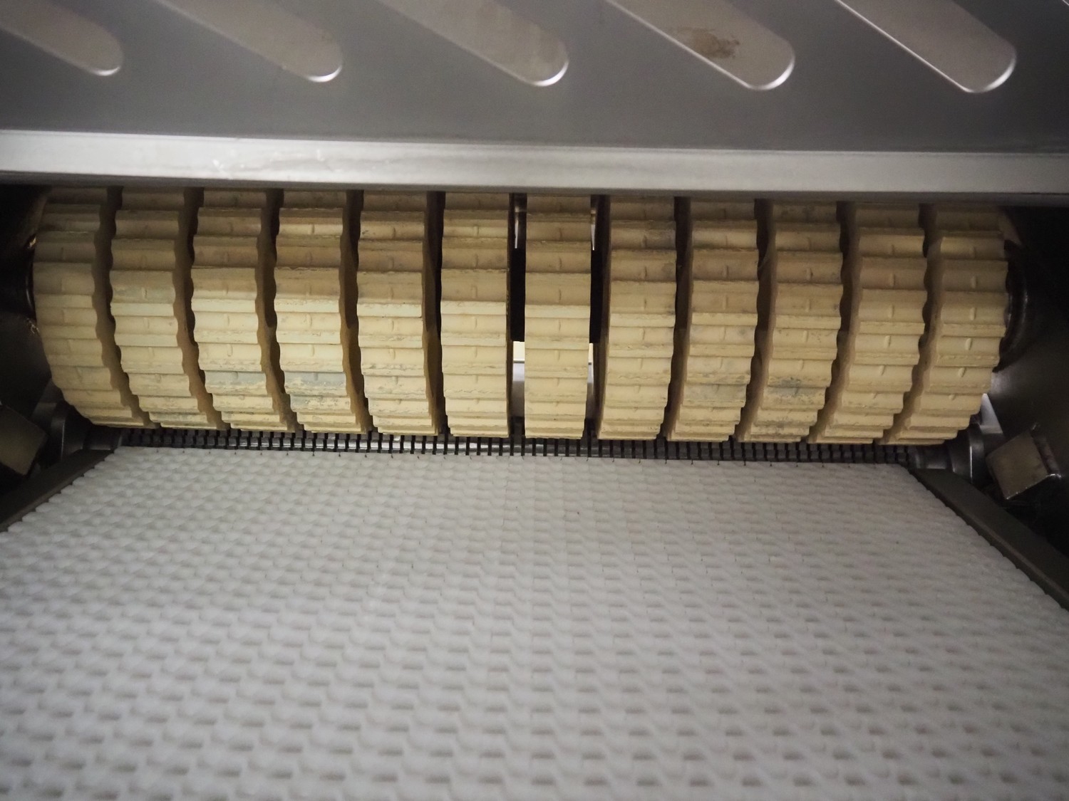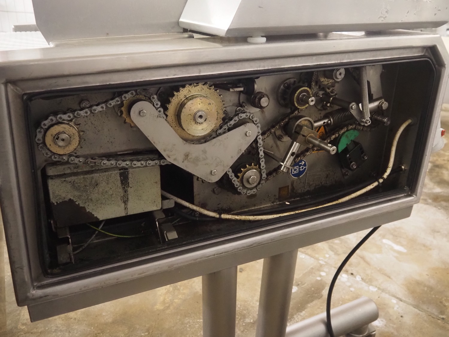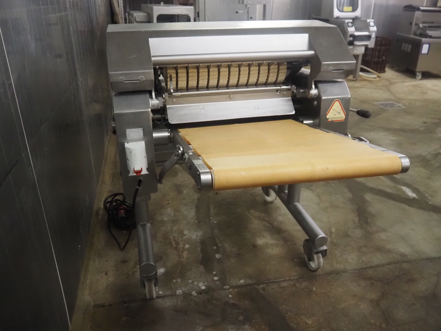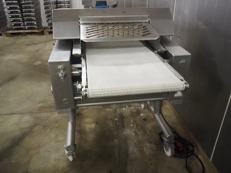 Maja-Maschinenfabrik mobile skinning and derinding machine, type: BXM 554, number: 45300, year of construction: 2004, 400 V, 3 Ph, 50 Hz, 2.8 A, 1.1 kW, plastic mesh belt, belt width: 500 mm, working width: 535 mm, plastic belt, belt width: 505 mm, total dimensions: 1900 mm x 1150 mm x 1250 mm.