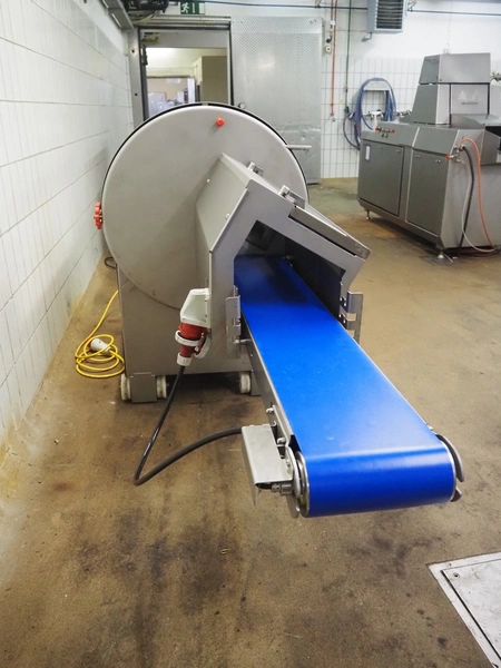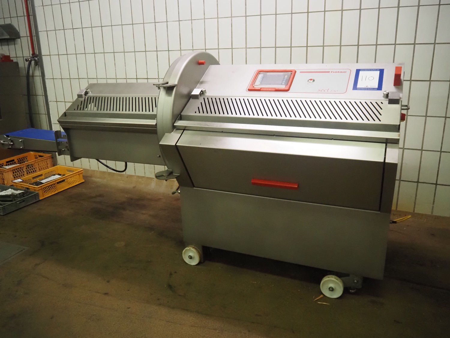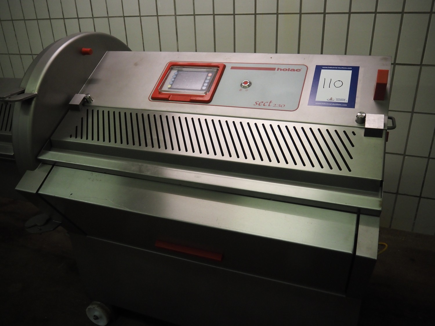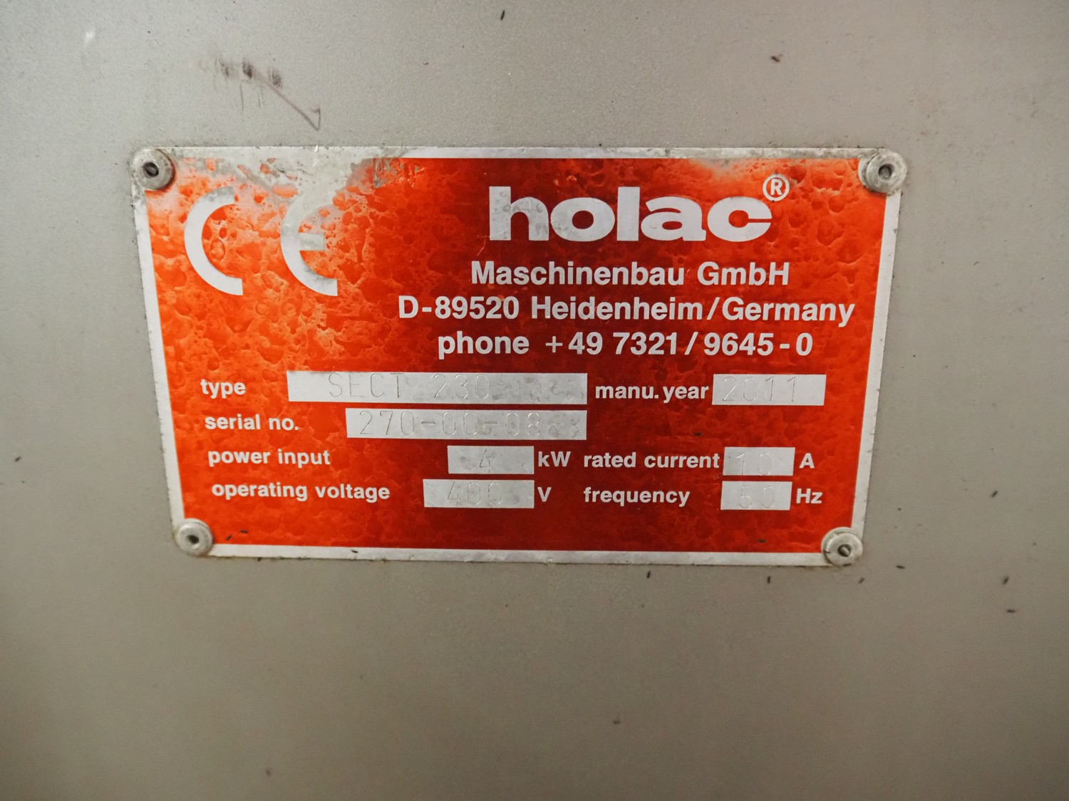 Holac Maschinenbau GmbH mobile slicer, type: SECT 230, serial number: 270-00-08, year of construction: 2011, 400 V, 50 Hz, 10 A, 4 kW, plastic belt, belt width: 250 mm, dimensions chamber: 230 mm x 180 mm, total dimensions: 2850 mm x 920 mm x 1320 mm.