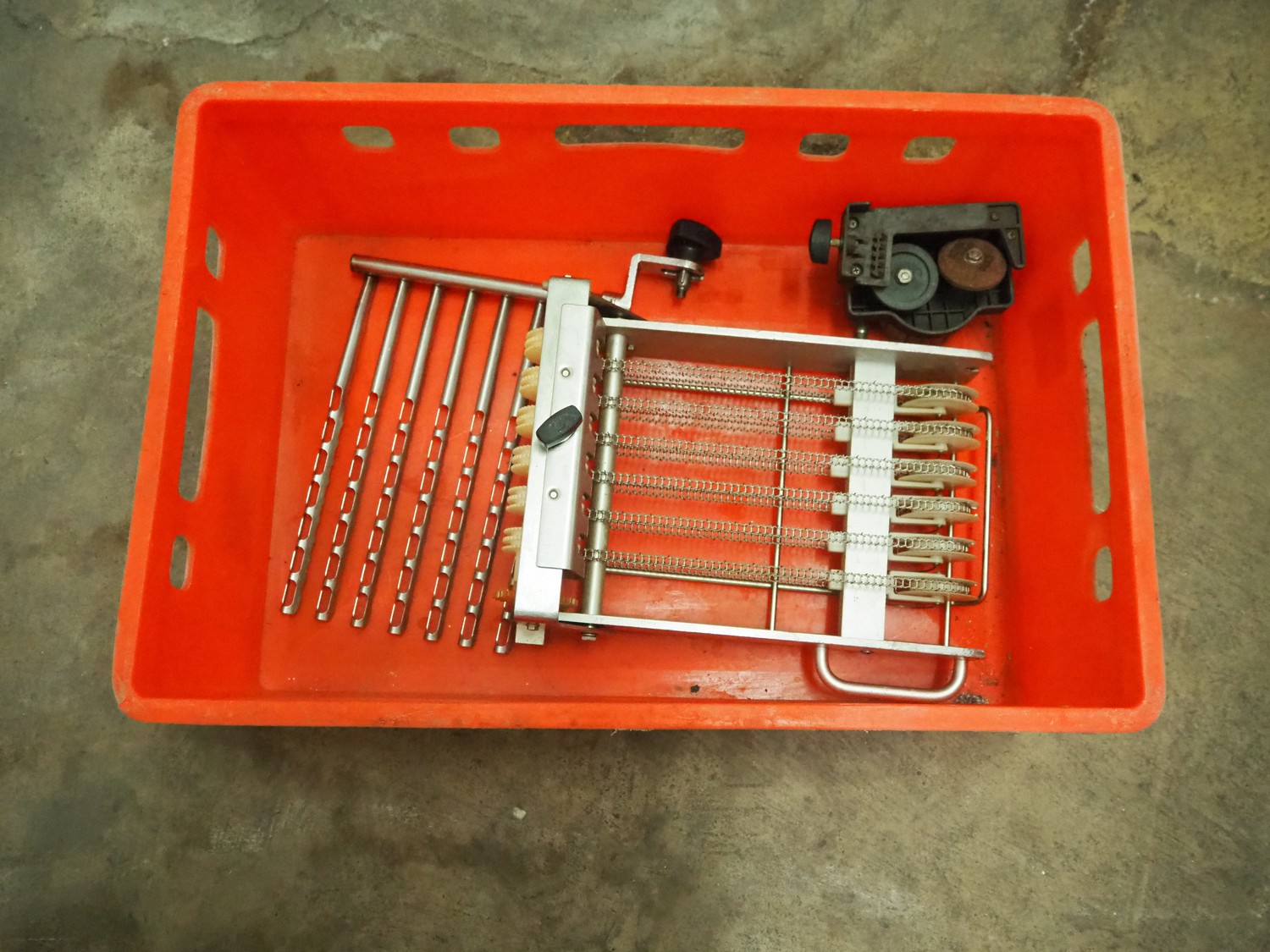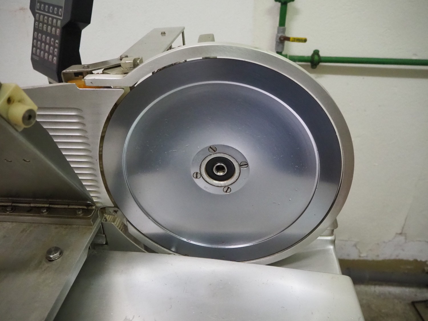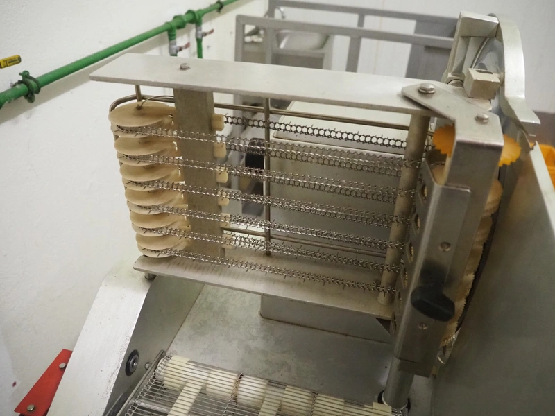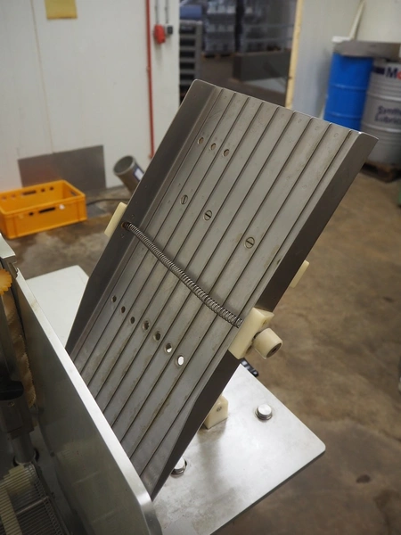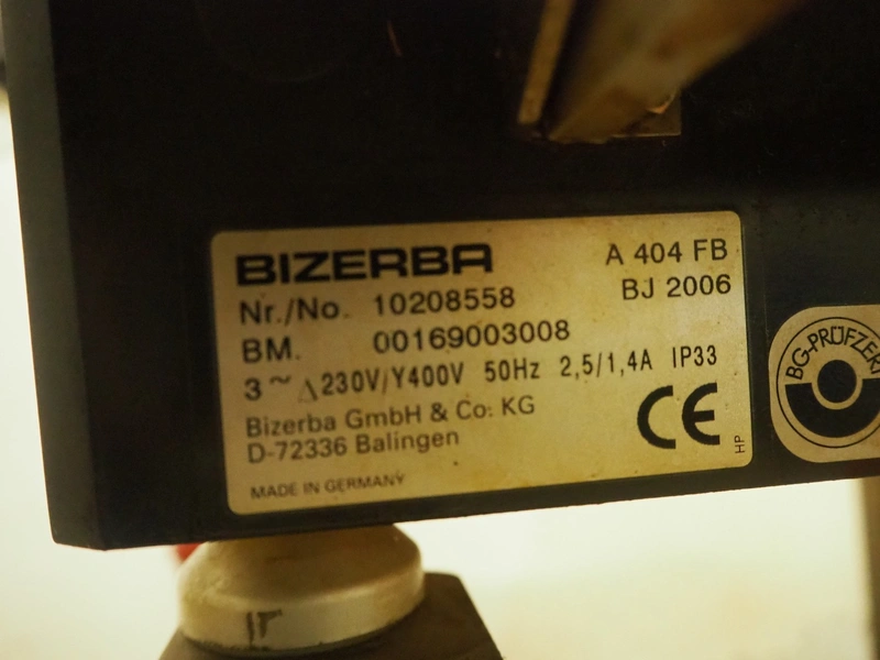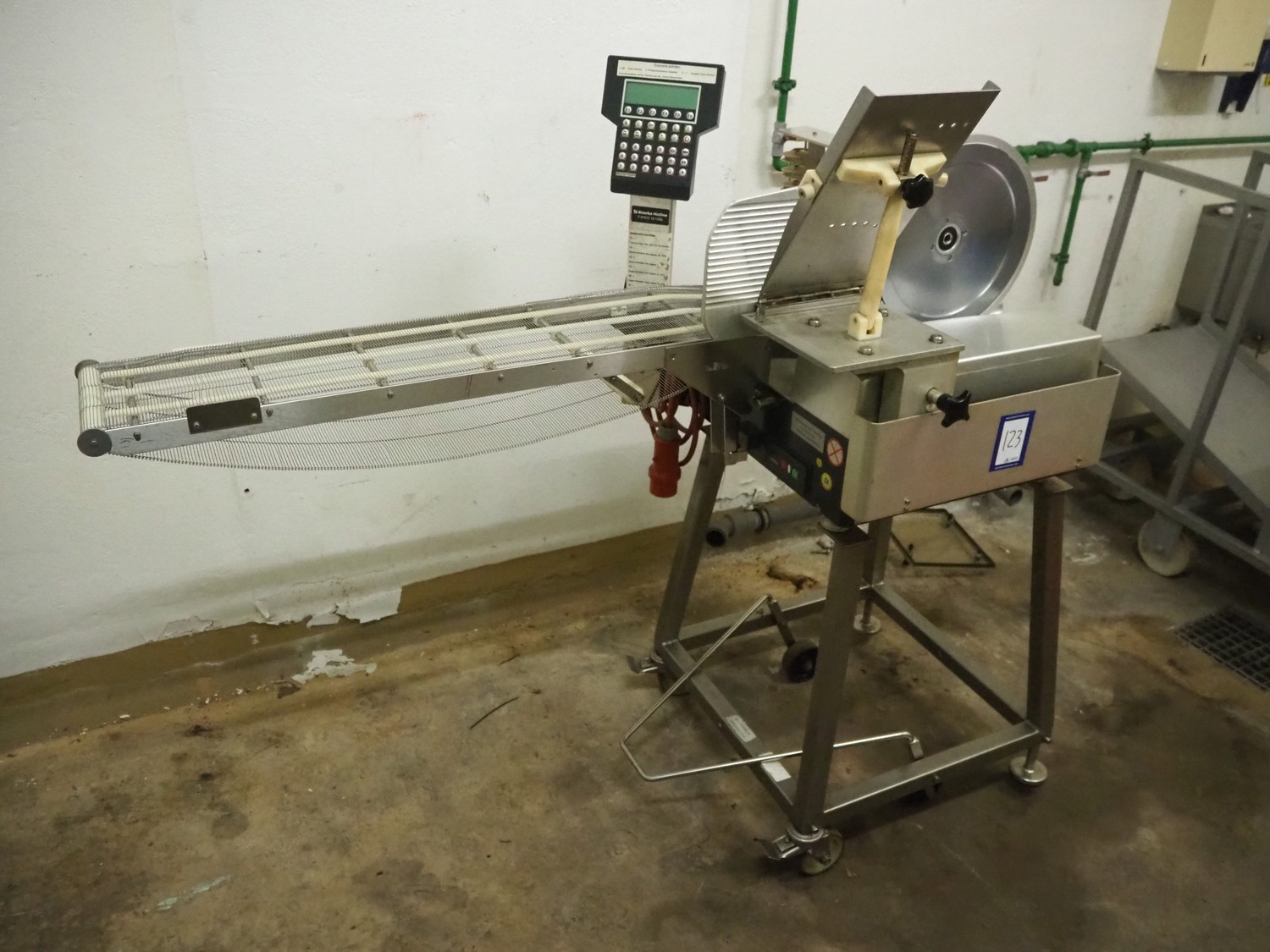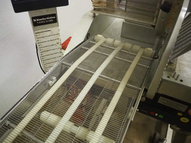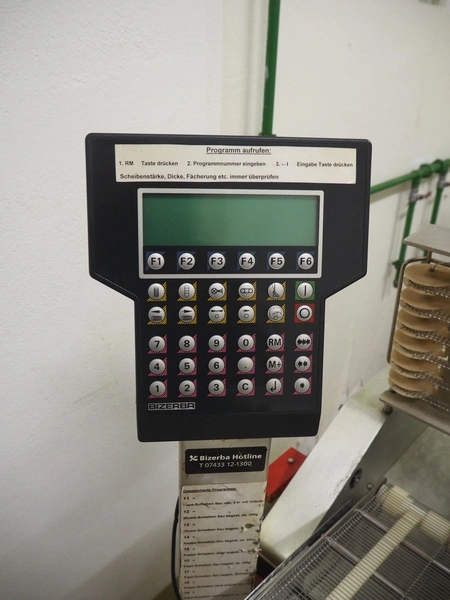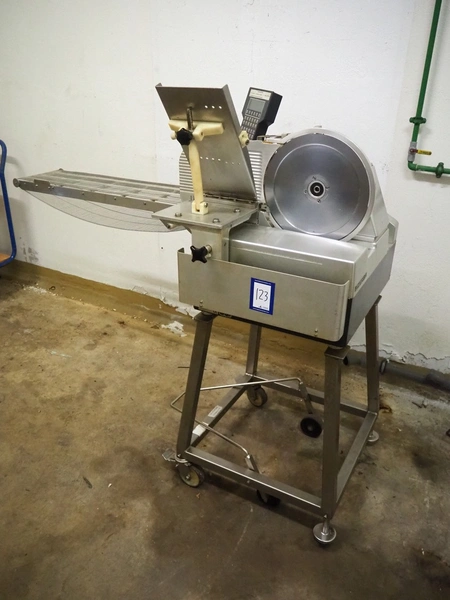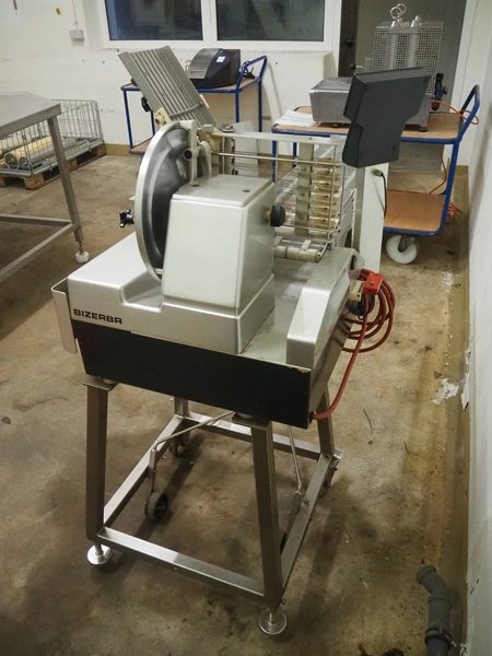 Bizerba mobile slicer, type: A 404 FB, number: 10208558, year of construction: 2006, 230/400 V, 3 Ph, 50 Hz, 2.5/1.4 A, s/s mesh belt, belt width: 250 mm, total dimensions: 1600 mm x 750 mm x 1400 mm. Including crate with parts.