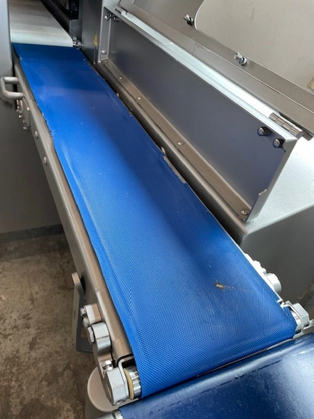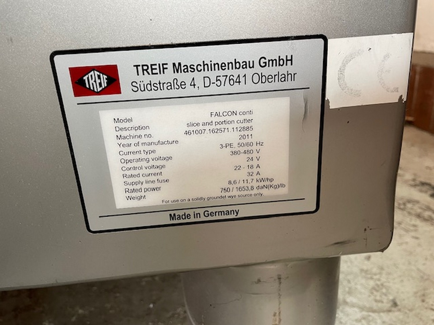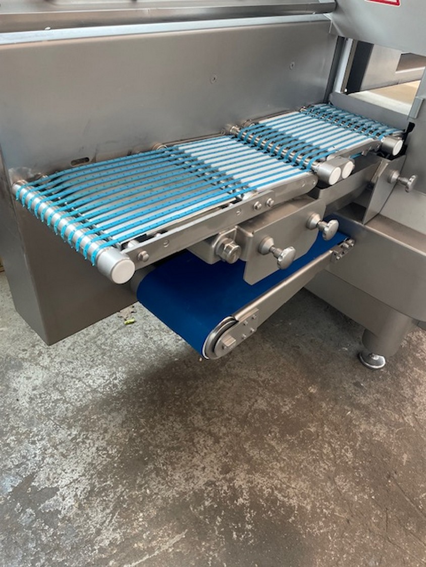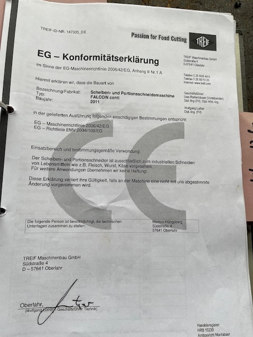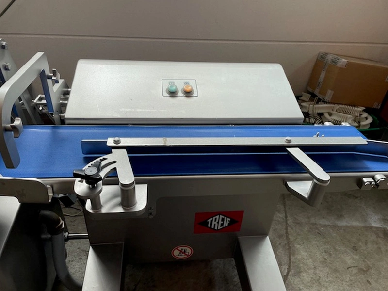 Treif Maschinenbau GmbH slicer and portion cutter, model: FALCON conti, machine number: 461007.162571.112885, year of construction: 2011, 380/480 V, 3 Ph, 50/60 Hz, 32 A, 8.6 kW, machine weight: 750 kg, plastic belt, total dimensions: 6000 mm x 1100 mm x 1900 mm. Including large amount of spare parts. Lot located in Bad Oldesloe (DE), viewing and pick up in consultation with Industrial Auctions BV.