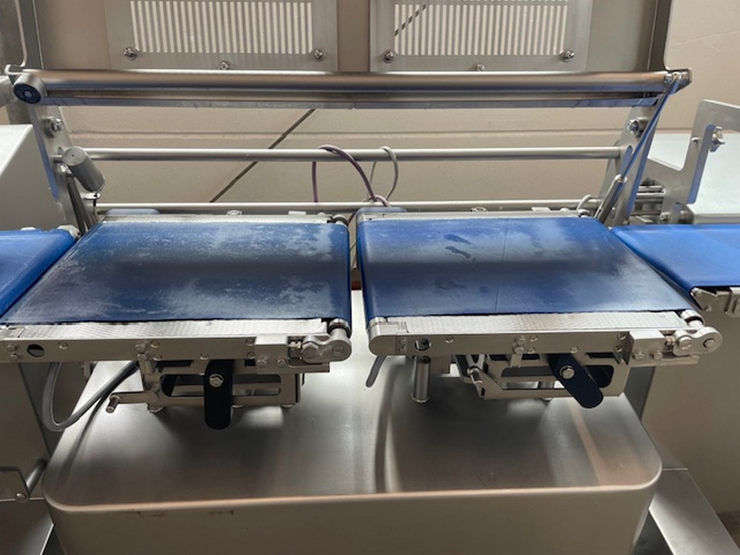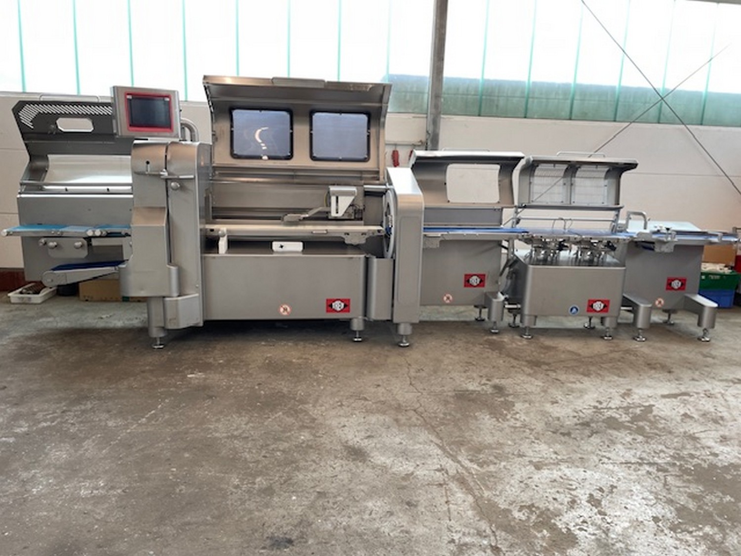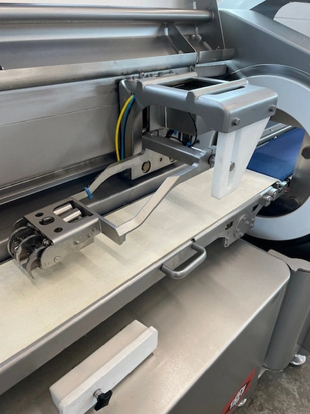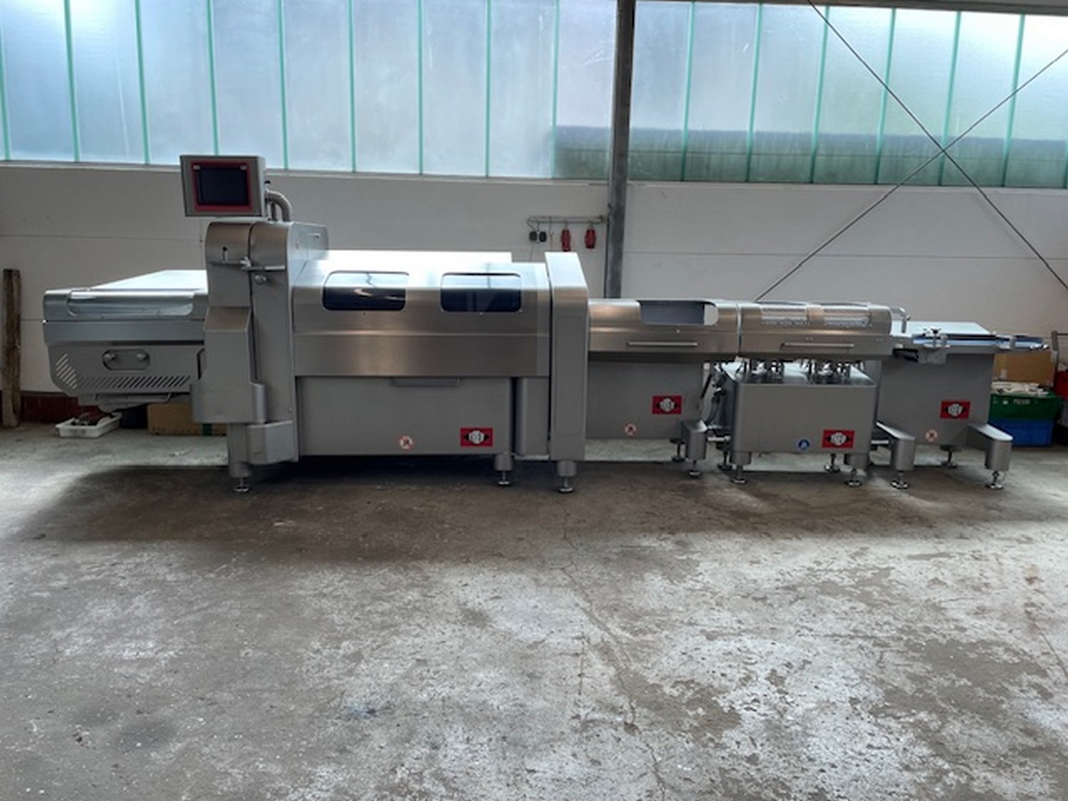Treif Maschinenbau GmbH slicer and portion cutter, model: FALCON conti, machine number: 461007.162571.112885, year of construction: 2011, 380/480 V, 3 Ph, 50/60 Hz, 32 A, 8.6 kW, machine weight: 750 kg, plastic belt, total dimensions: 6000 mm x 1100 mm x 1900 mm. Including large amount of spare parts. Lot located in Bad Oldesloe (DE), viewing and pick up in consultation with Industrial Auctions BV.