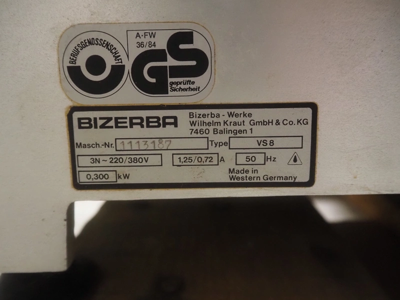 Bizerba slicer, type: VS 8, machine number: 1113187, 220/380 V, 3 Ph, 50 Hz, 1.25/0.72 A, 0.3 kW, dimensions: 640 mm x 500 mm x 400 mm. Lot located in Winsen (DE), viewing and pick up in consultation with Industrial Auctions B.V.