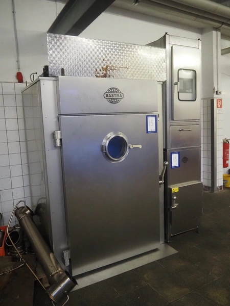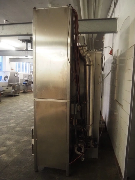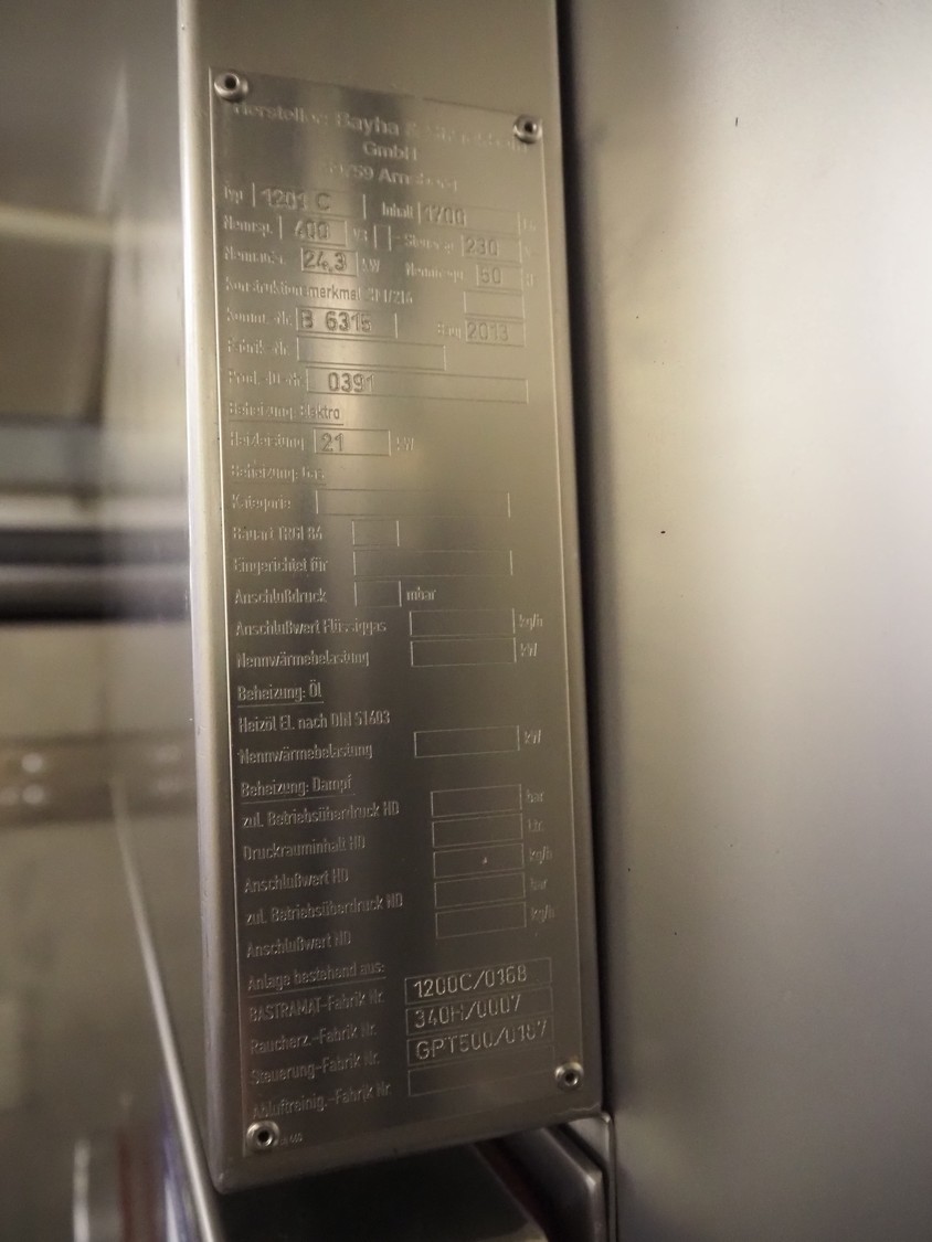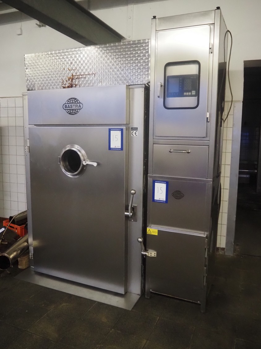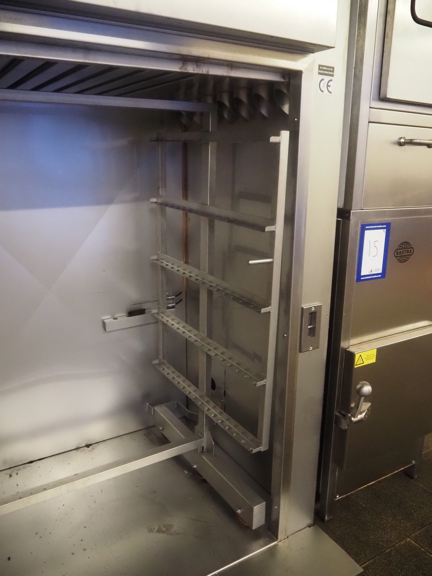 Bastra smoke chamber, type: 1201 C, year of construction: 2013, 230/400 V, 3 Ph, 50 Hz, 24.3 kW, dimensions:1400 mm x 1100 mm x 2350 mm. Including Bastra wood chip generator, dimensions: 1150 mm x 560 mm x 2530 mm, s/s smoke trolley, 5 floors, dimensions trolley: 970 mm x 800 mm x 1500 mm, and pallet with parts.