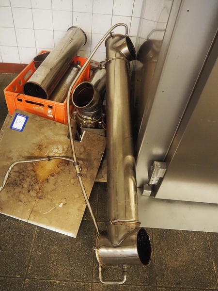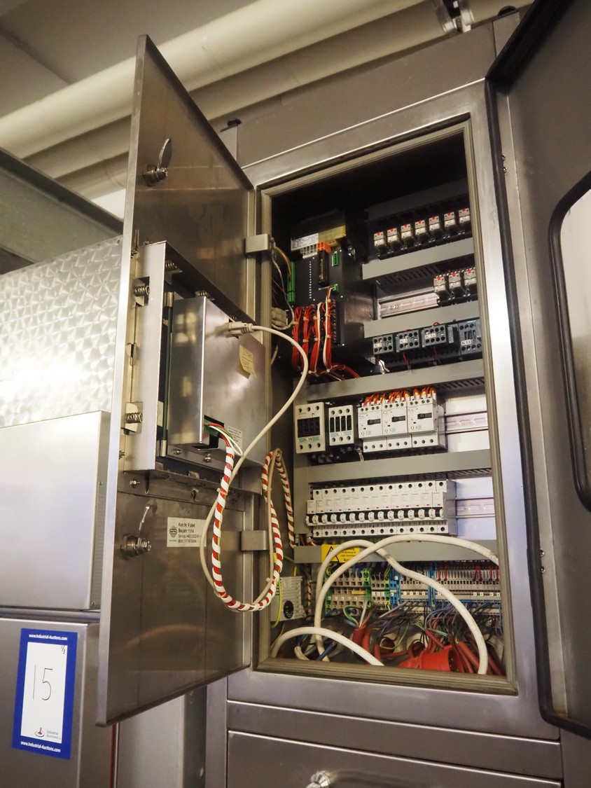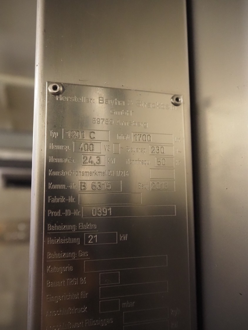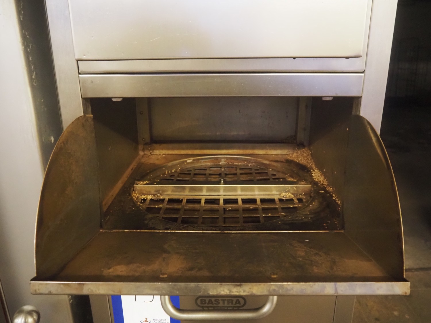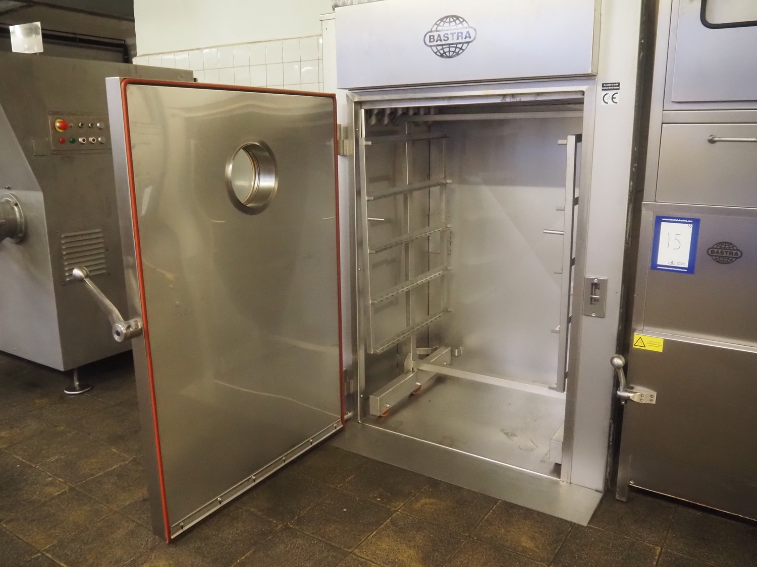 Bastra smoke chamber, type: 1201 C, year of construction: 2013, 230/400 V, 3 Ph, 50 Hz, 24.3 kW, dimensions:1400 mm x 1100 mm x 2350 mm. Including Bastra wood chip generator, dimensions: 1150 mm x 560 mm x 2530 mm, s/s smoke trolley, 5 floors, dimensions trolley: 970 mm x 800 mm x 1500 mm, and pallet with parts.