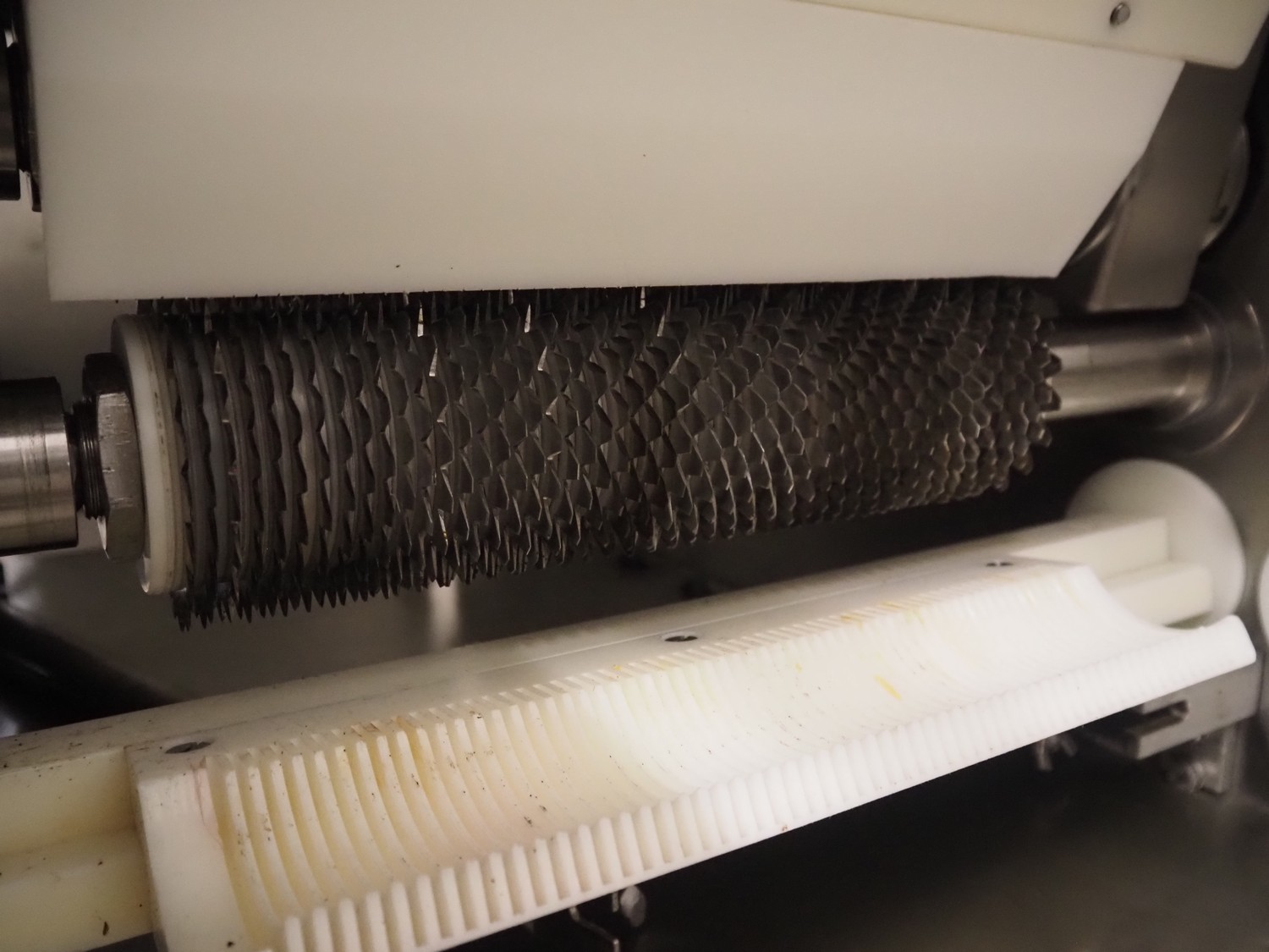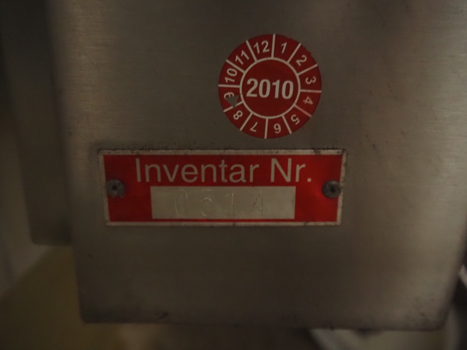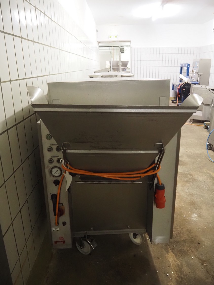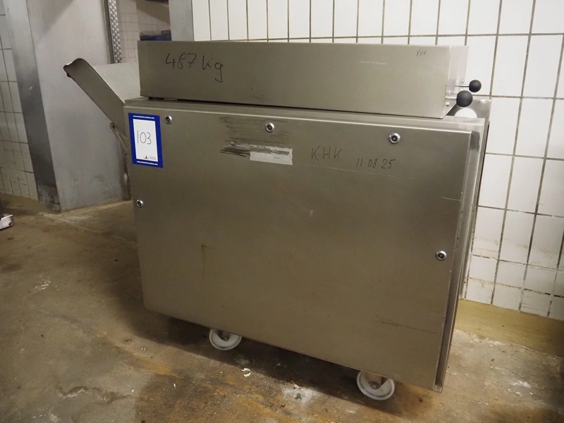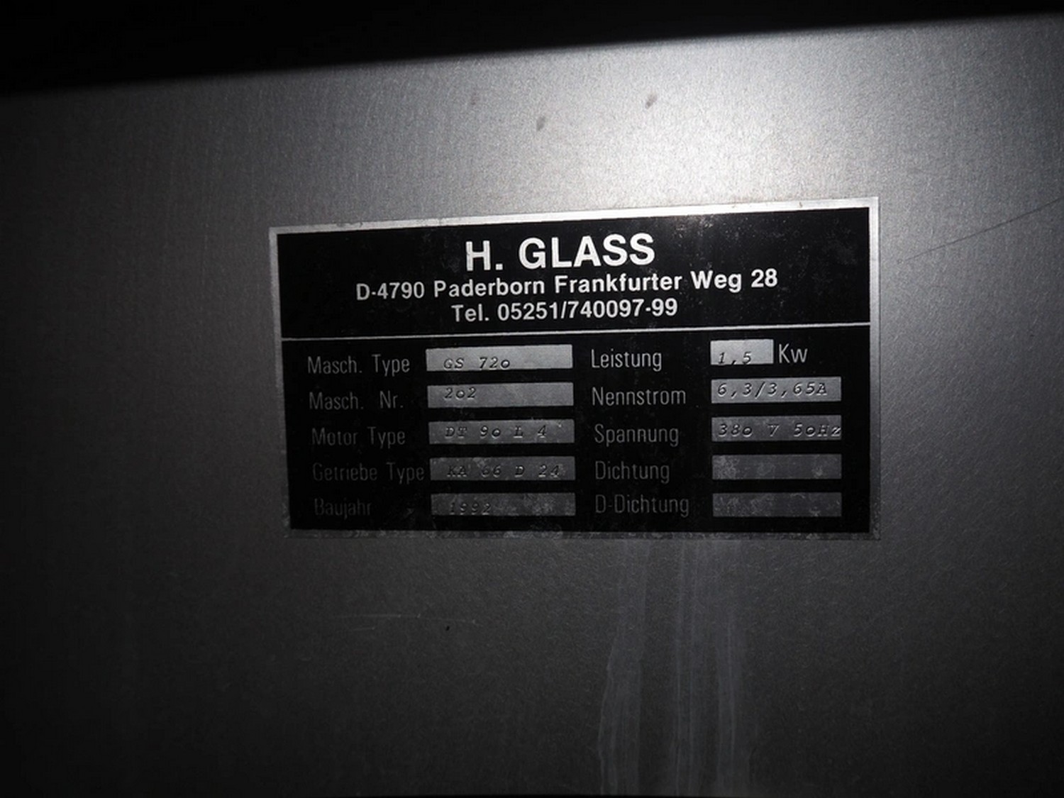 H.Glass mobile tenderizer, type: GS 720, number: 202, year of construction: 1992, 380 V, 50 Hz, 6.3/3.65 A, 1.5 kW, working width: 290 mm, distance between knives: 5 mm, total dimensions: 1520 mm x 850 mm x 1350 mm. Missing belt.