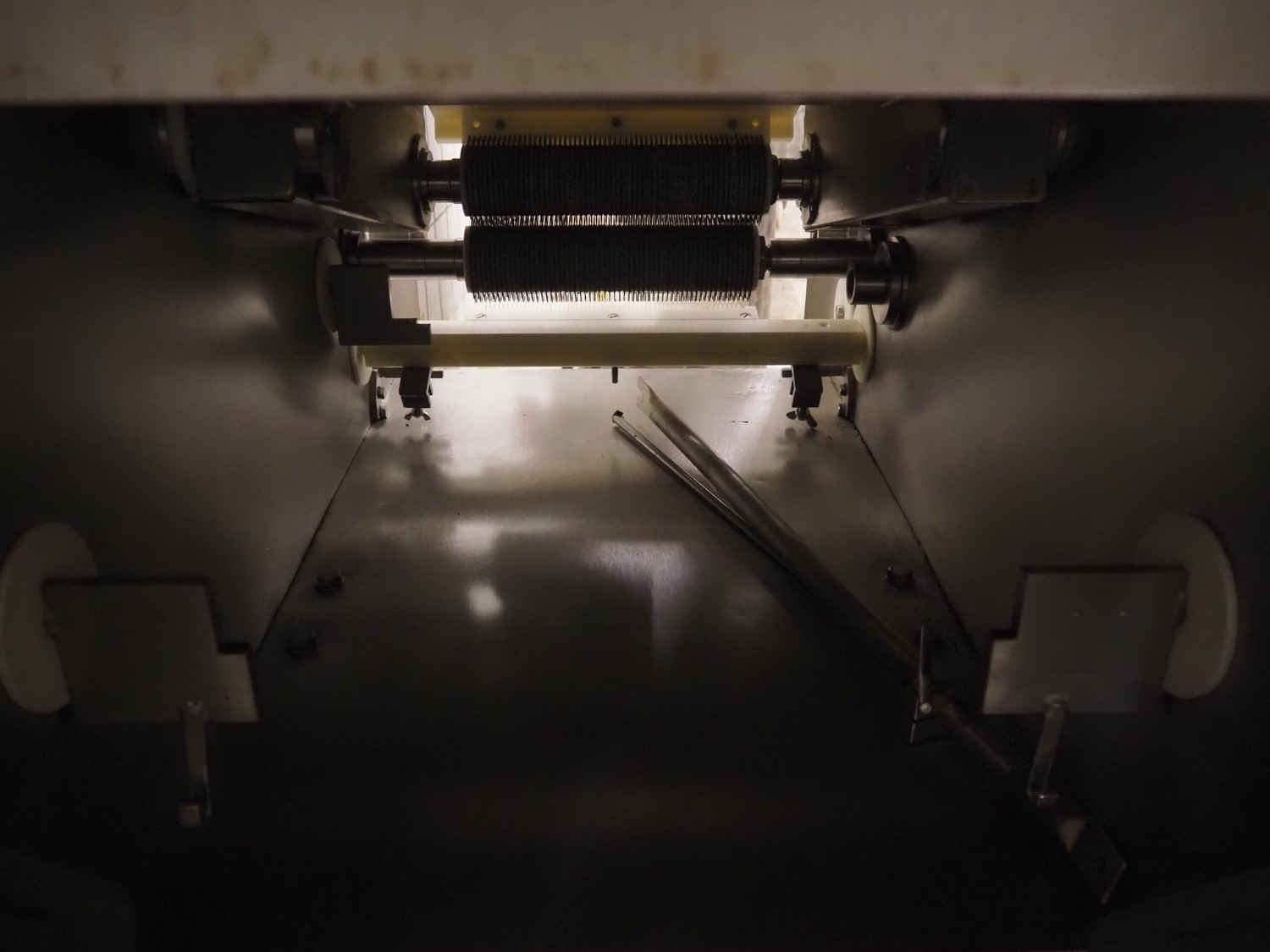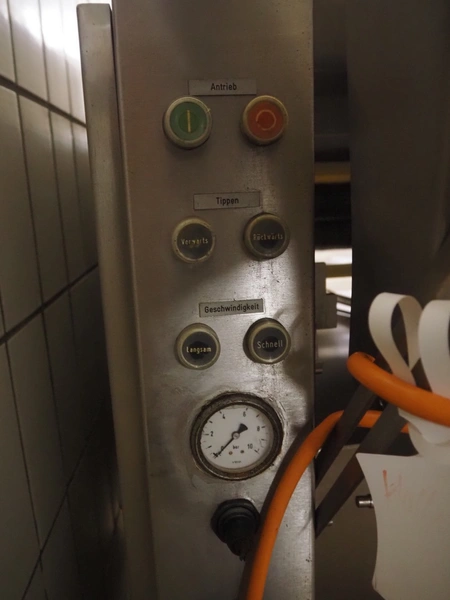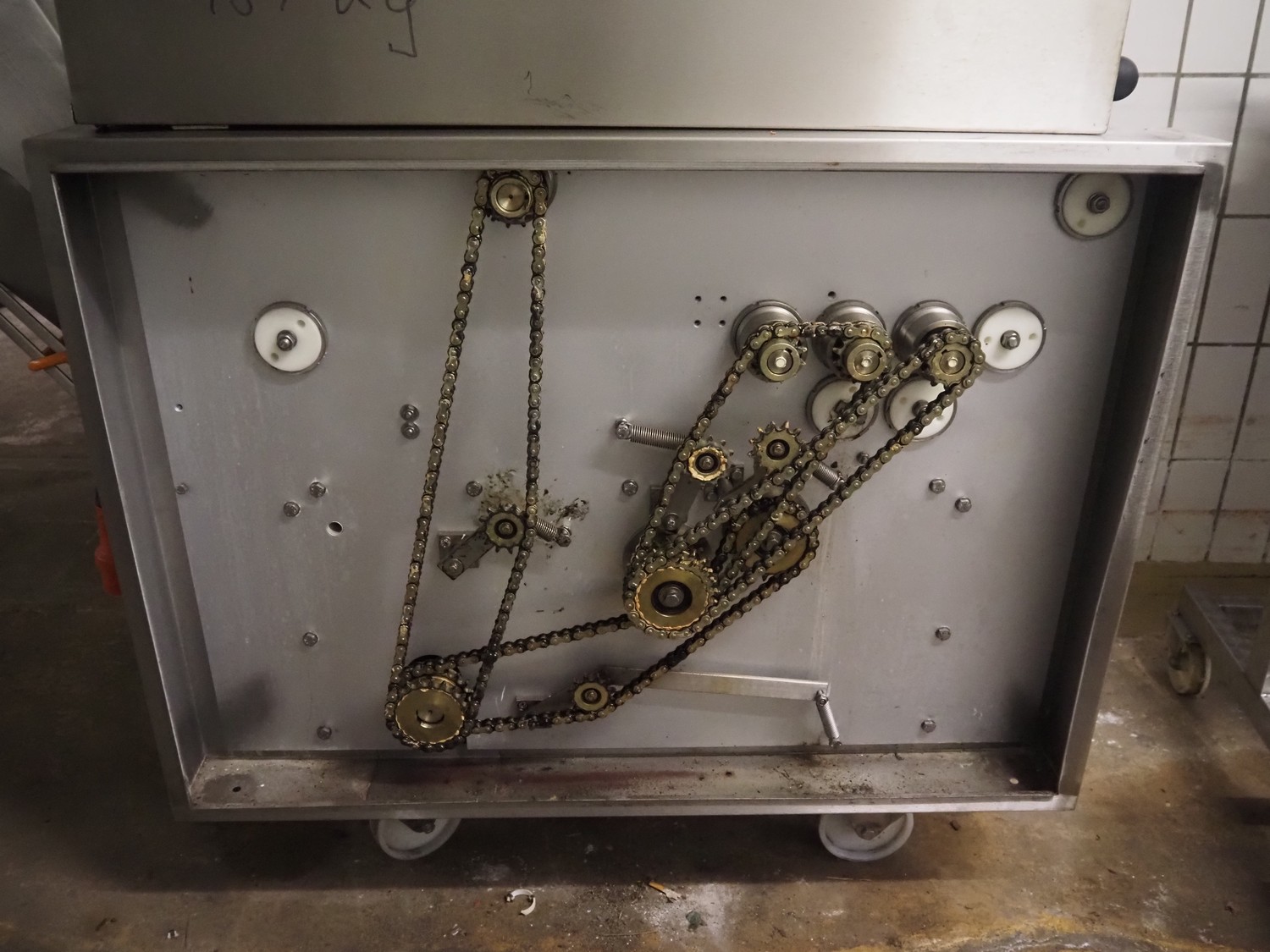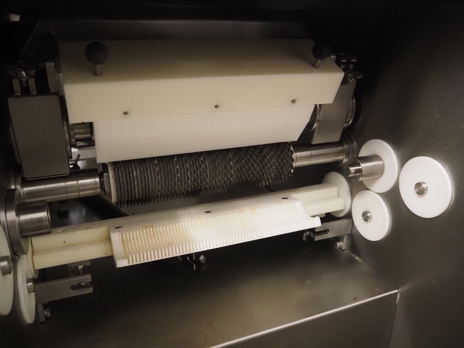 H.Glass mobile tenderizer, type: GS 720, number: 202, year of construction: 1992, 380 V, 50 Hz, 6.3/3.65 A, 1.5 kW, working width: 290 mm, distance between knives: 5 mm, total dimensions: 1520 mm x 850 mm x 1350 mm. Missing belt.