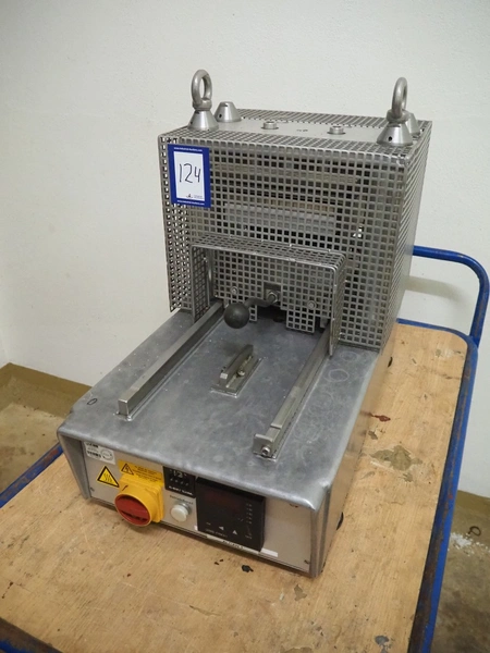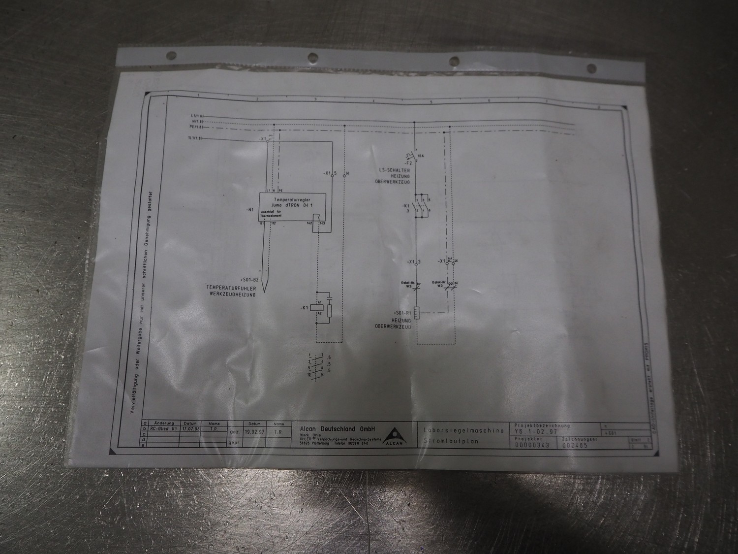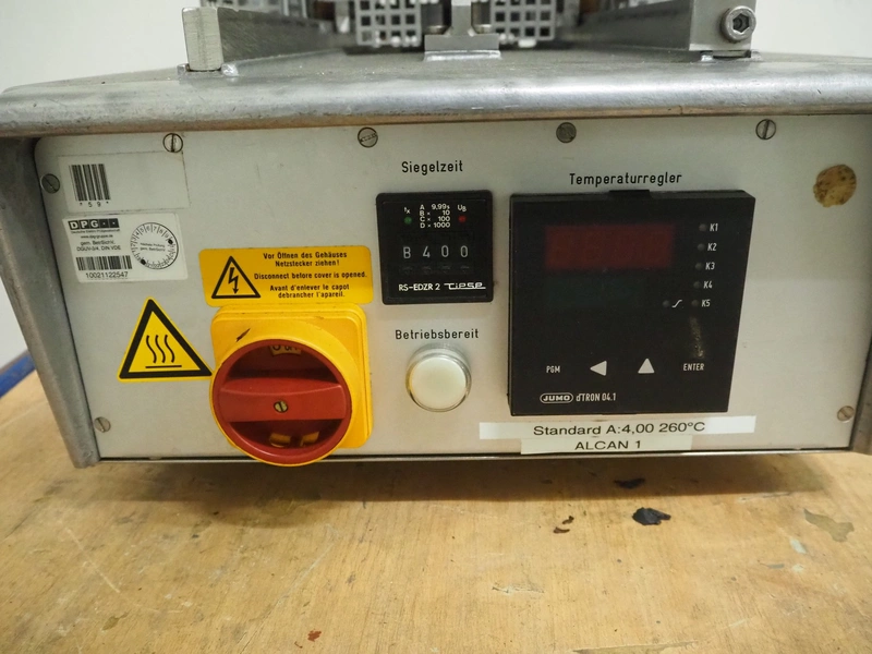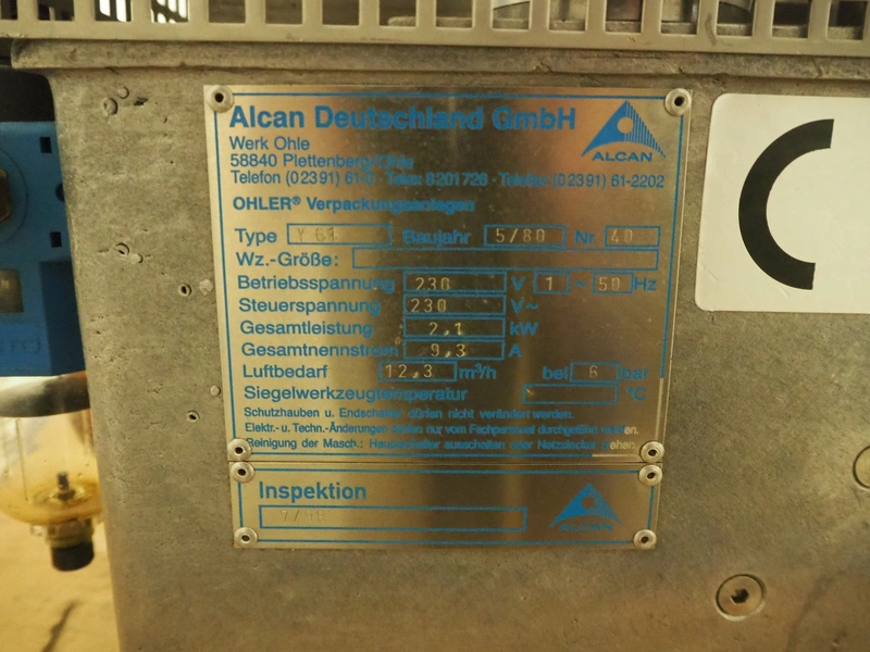 Alcan traysealer, type: Y61, number: 40, year of construction: 5/80, 230 V, 1 Ph, 50 Hz, 9.3 kW, 2.1 kW, dye: 148 mm x 100 mm, total dimensions: 410 mm x 700 mm x 640 mm.