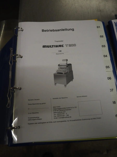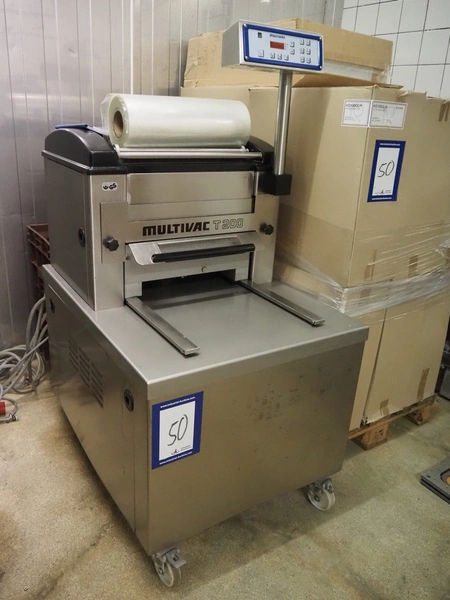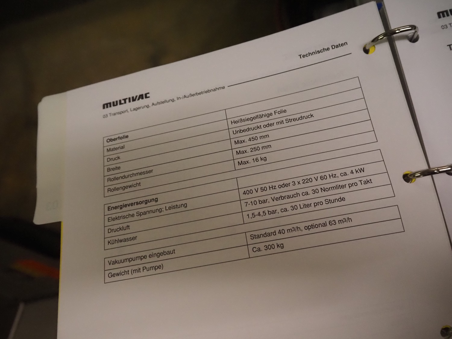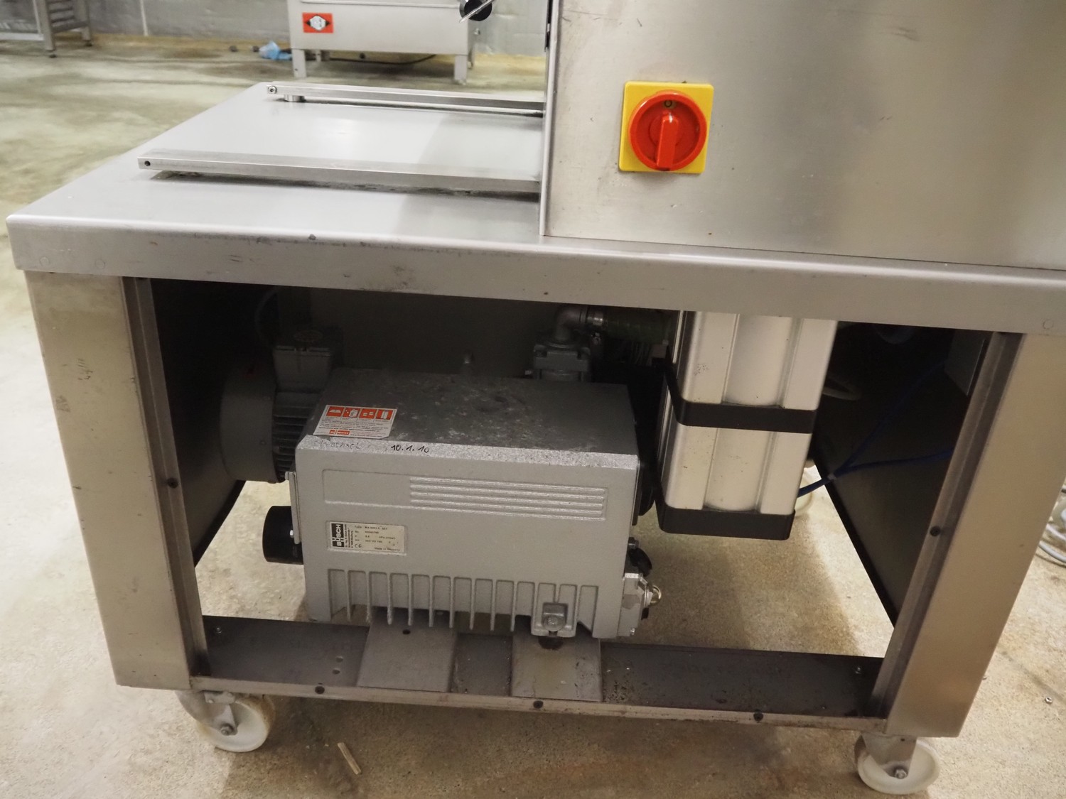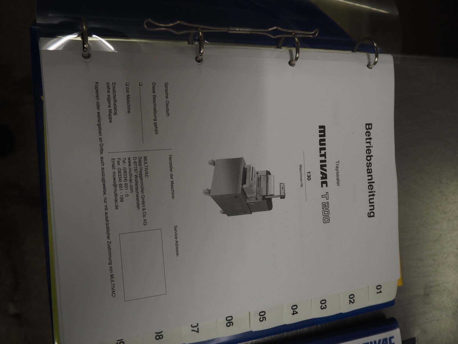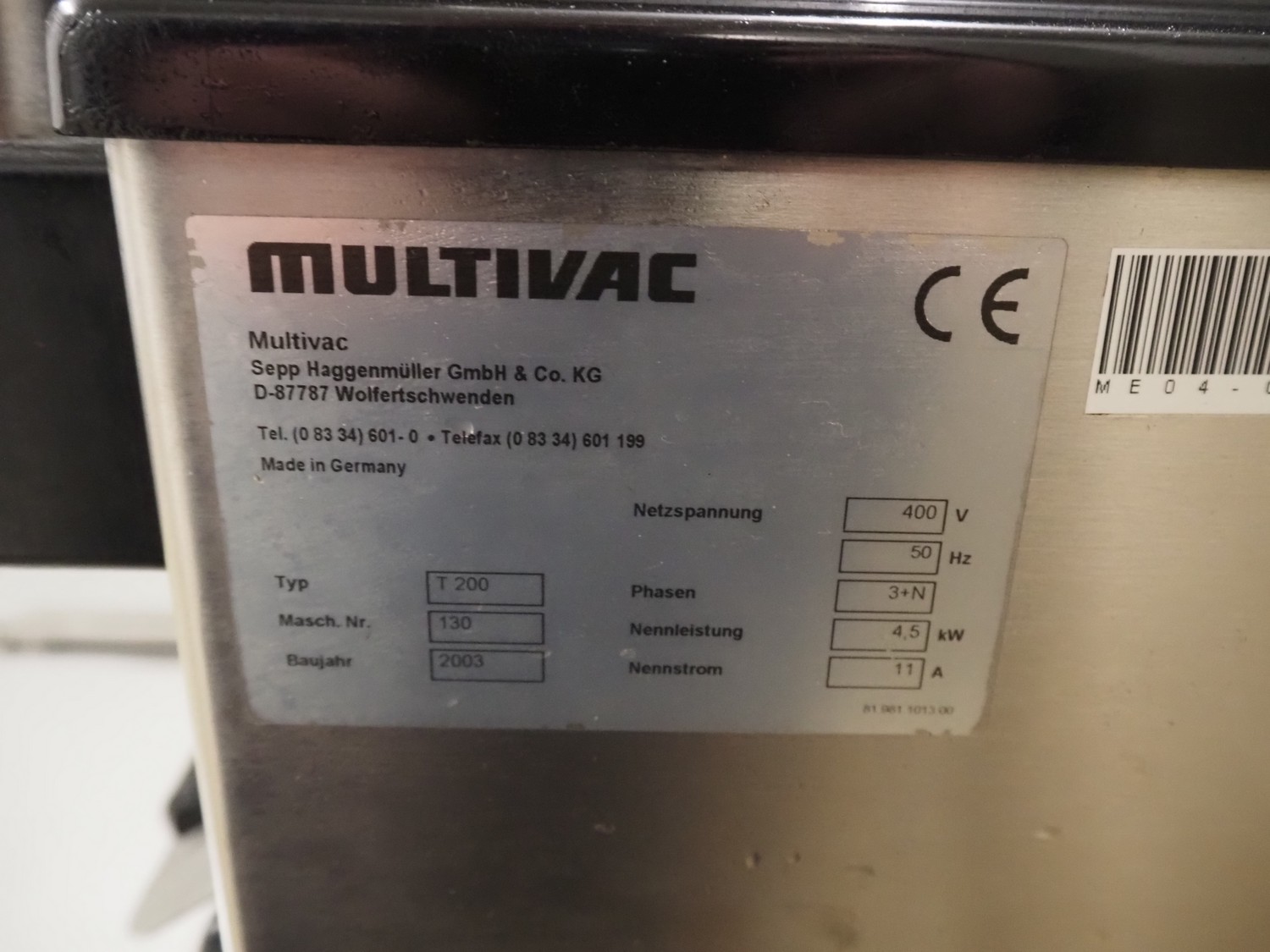 Multivac traysealer, type: T 200, machine number: 130, year of construction: 2003, 400 V, 3 Ph, 50 Hz, 11 A, 4.5 kW, dye: 290 mm x 225 mm, film width: 450 mm, with Busch vacuum pump, type: RA 0063 E 5Z1, number: 03043785, capacity: 63 m³ per hour. total dimensions: 1000 mm x 760 mm x 1570 mm. Including pallet with plastic trays, total dimensions: 1200 mm x 800 mm x 1600 mm and box with dyes.