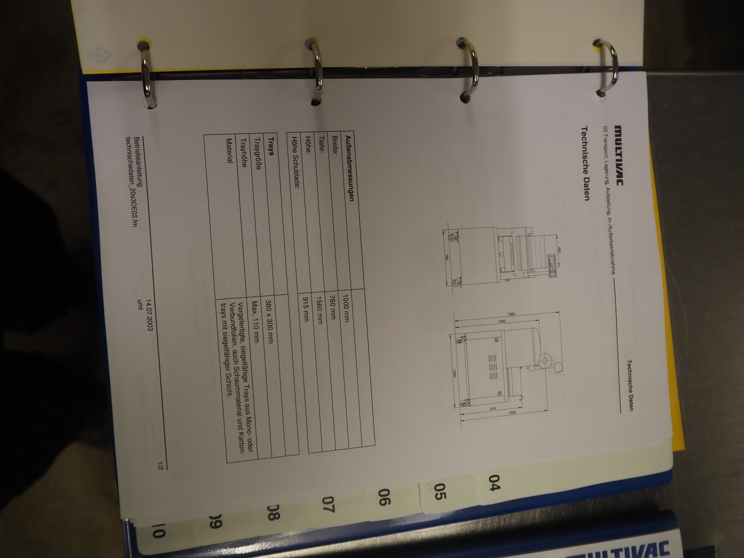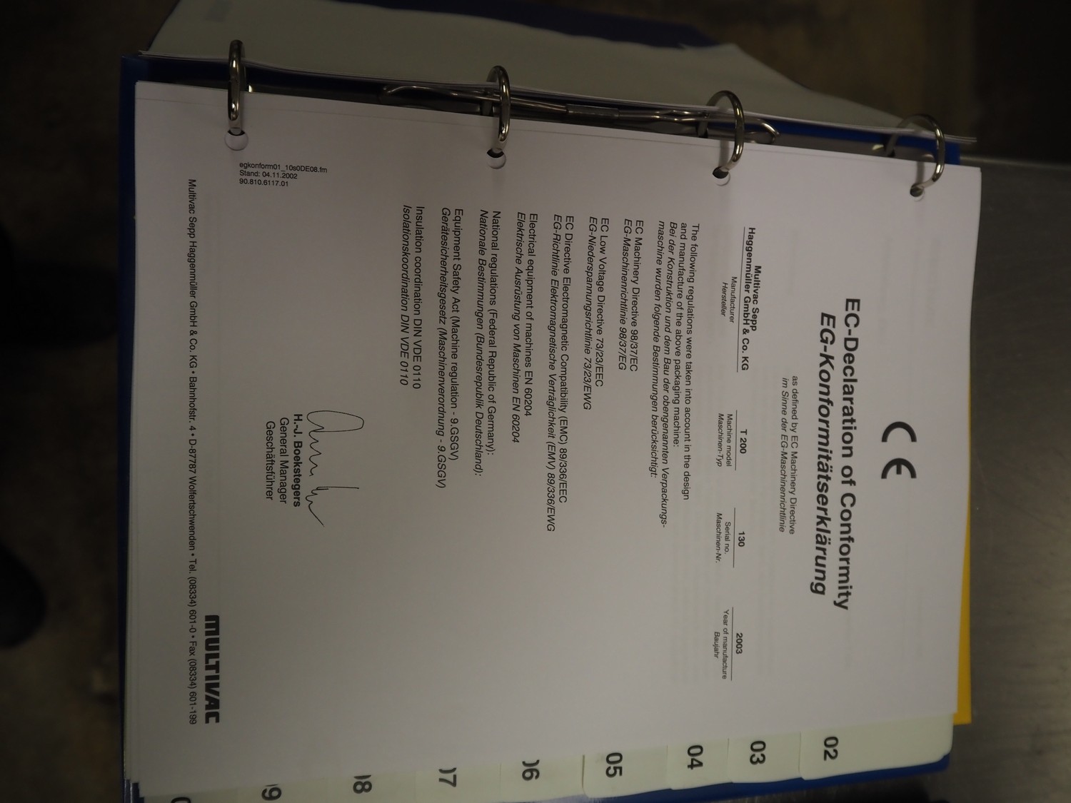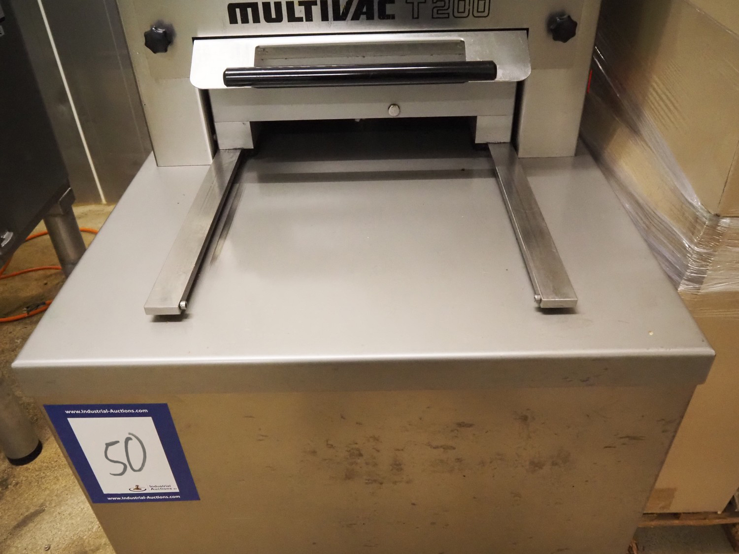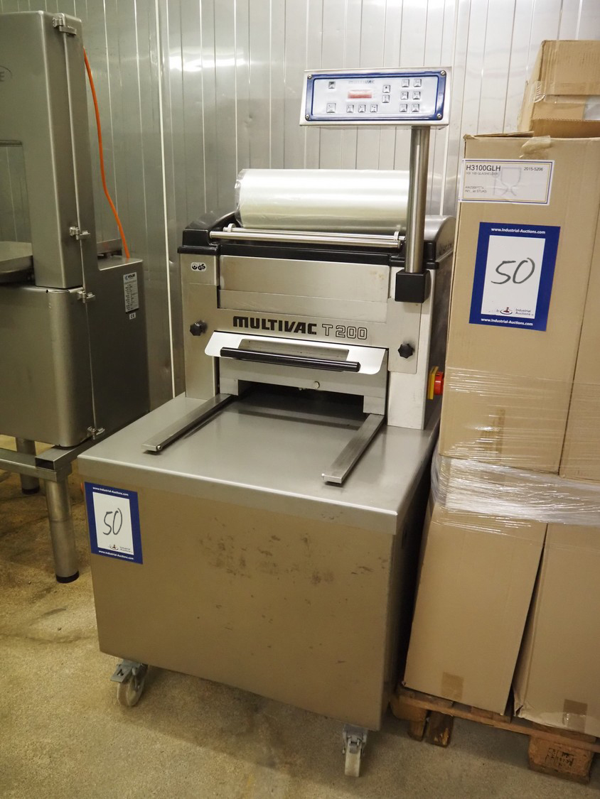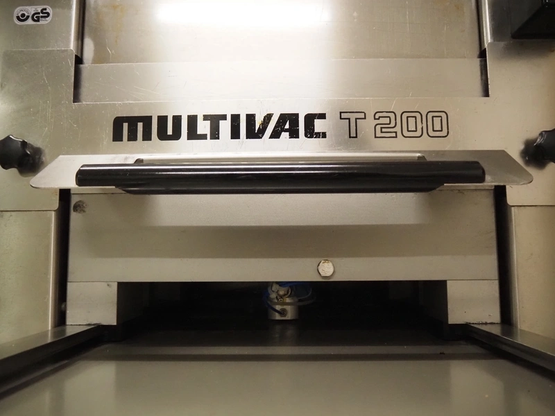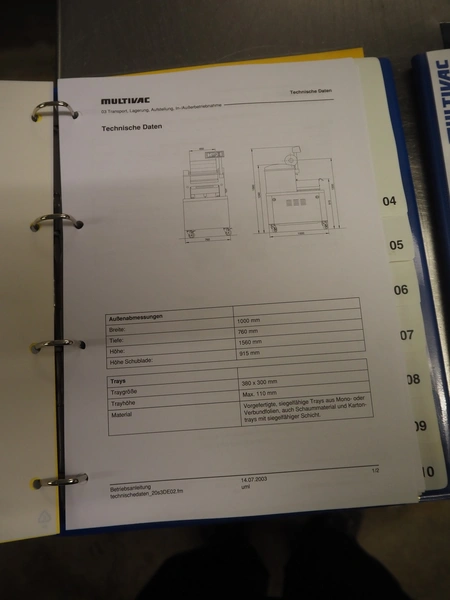 Multivac traysealer, type: T 200, machine number: 130, year of construction: 2003, 400 V, 3 Ph, 50 Hz, 11 A, 4.5 kW, dye: 290 mm x 225 mm, film width: 450 mm, with Busch vacuum pump, type: RA 0063 E 5Z1, number: 03043785, capacity: 63 m³ per hour. total dimensions: 1000 mm x 760 mm x 1570 mm. Including pallet with plastic trays, total dimensions: 1200 mm x 800 mm x 1600 mm and box with dyes.