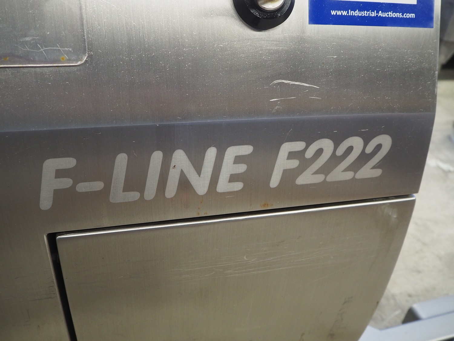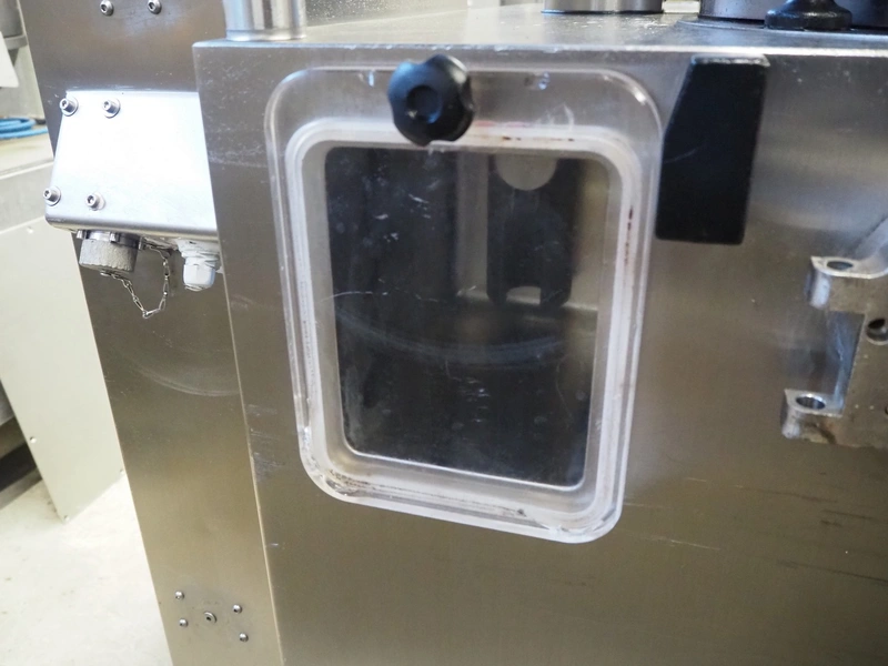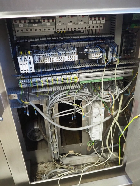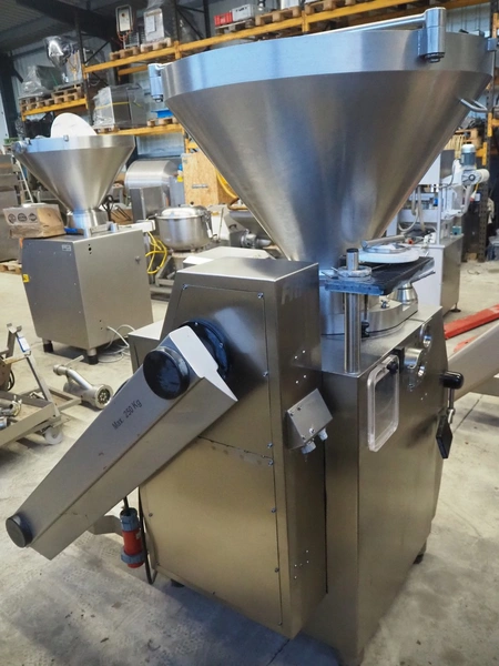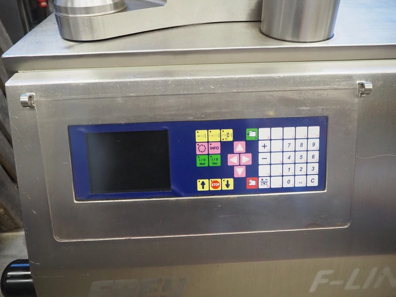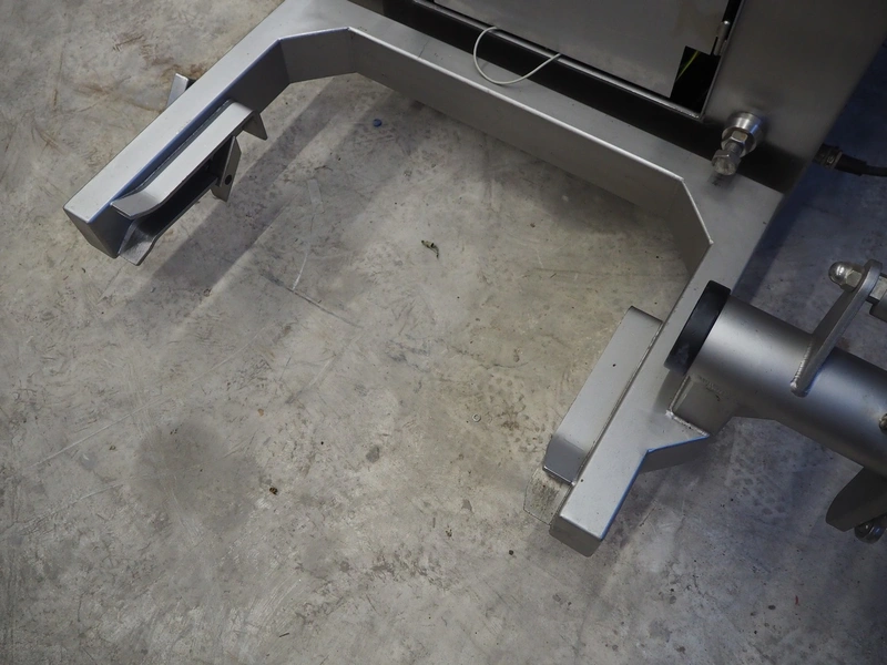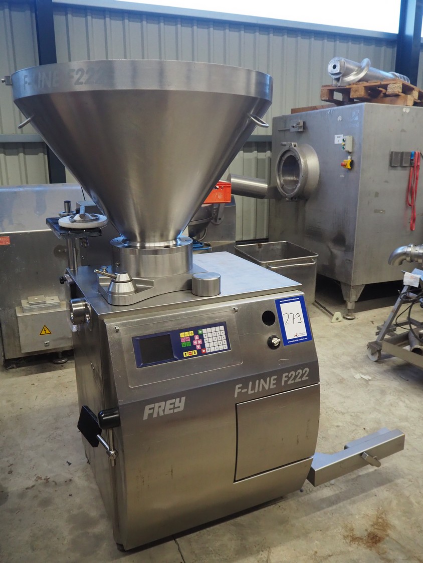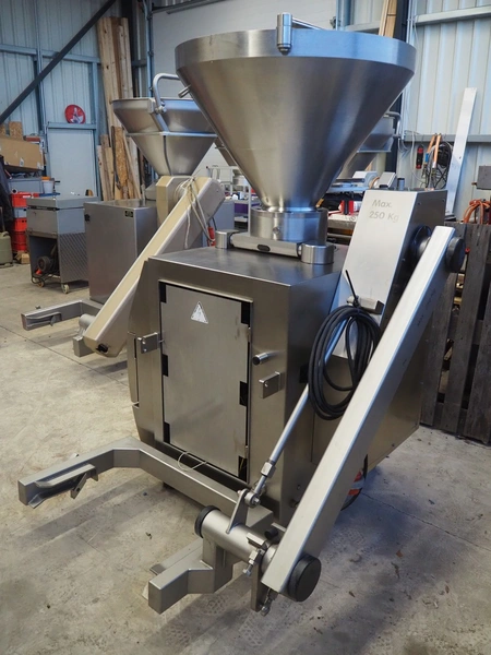 Frey vacuum filling machine with lifter for 200 liter meat bins, type: F-line F222, Busch vacuum pump, dimensions: 1750 mm x 1350 mm x 2000 mm. Missing cover. Lot located in Winsen (DE), viewing and pick up in consultation with Industrial Auctions B.V.