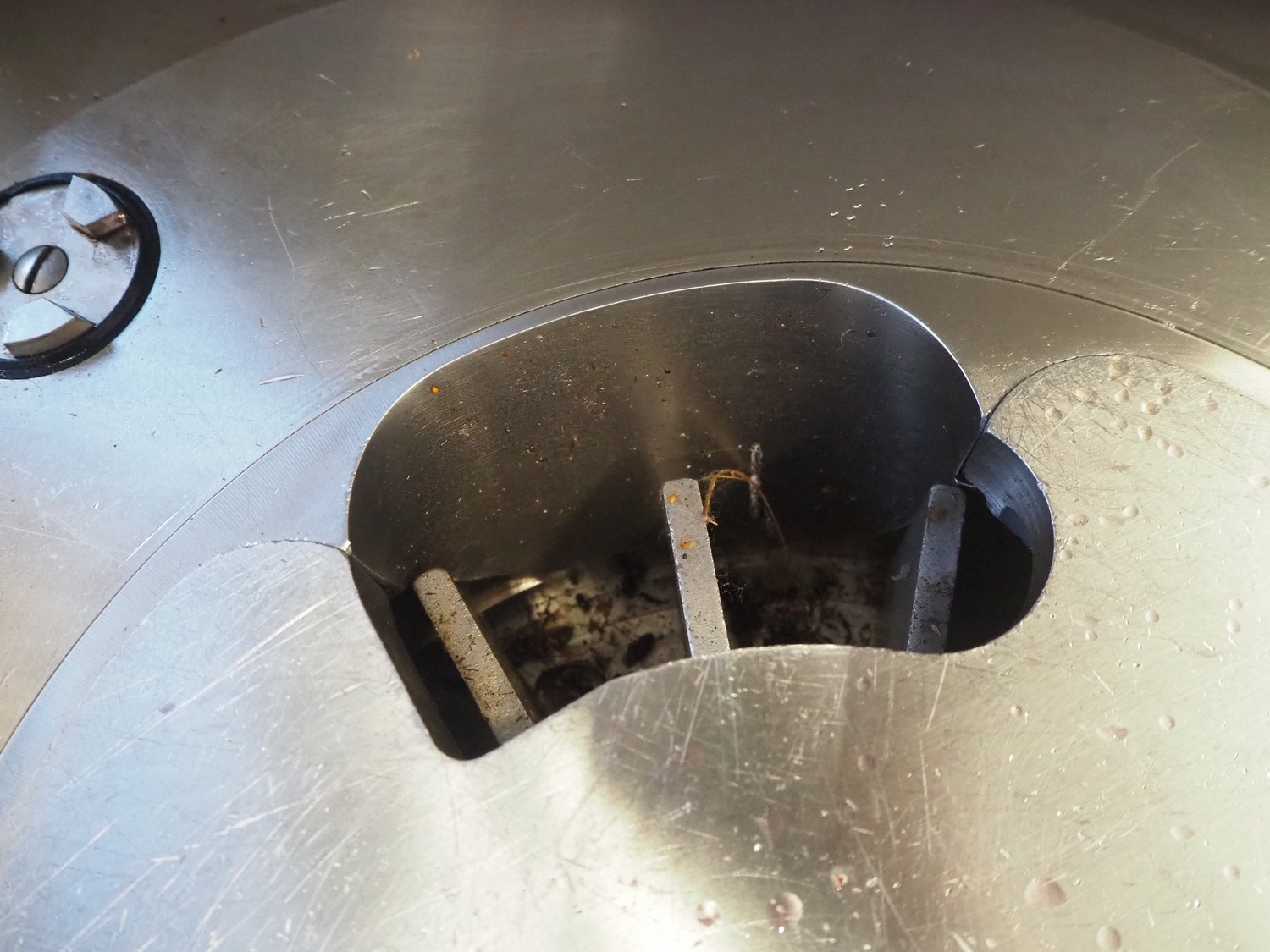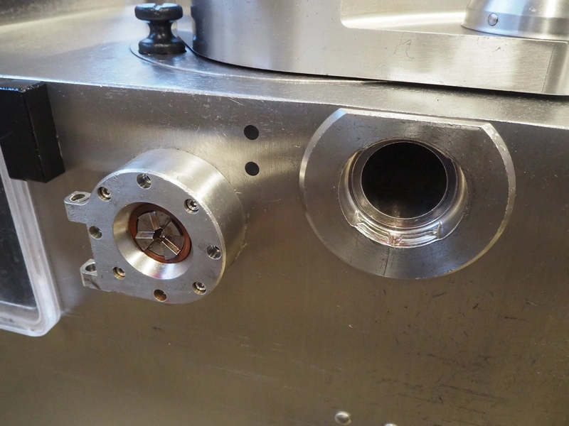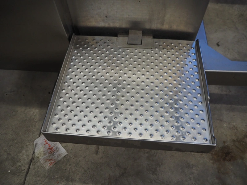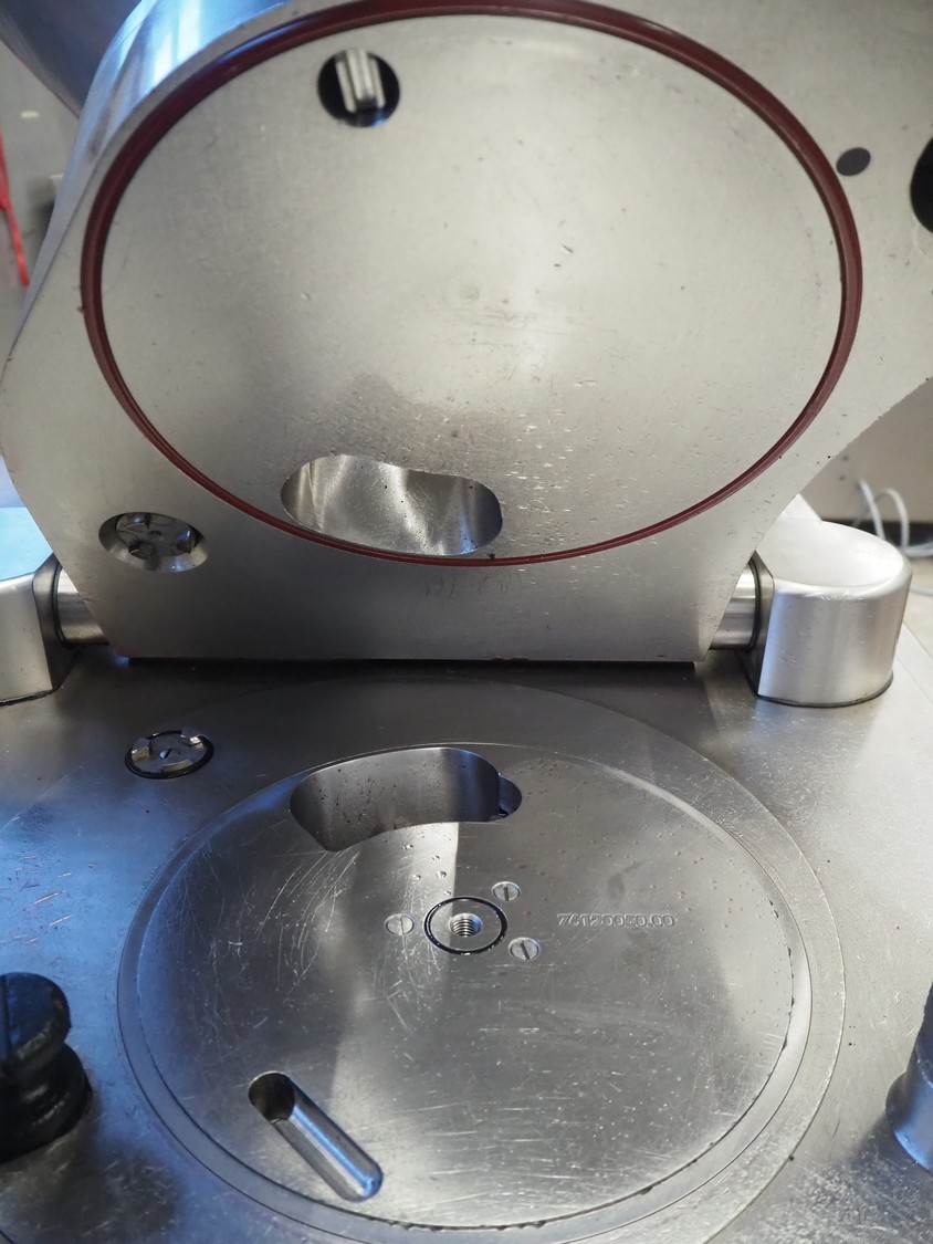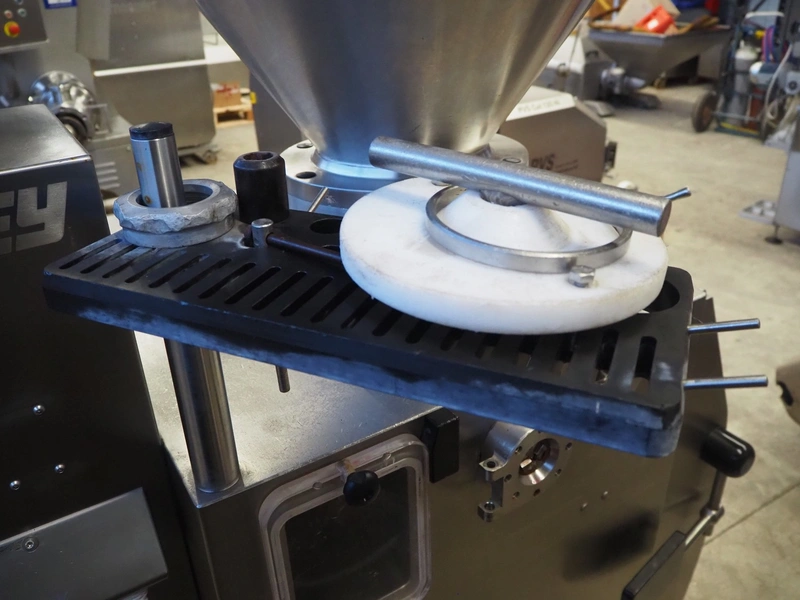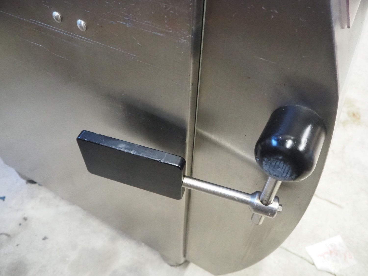 Frey vacuum filling machine with lifter for 200 liter meat bins, type: F-line F222, Busch vacuum pump, dimensions: 1750 mm x 1350 mm x 2000 mm. Missing cover. Lot located in Winsen (DE), viewing and pick up in consultation with Industrial Auctions B.V.