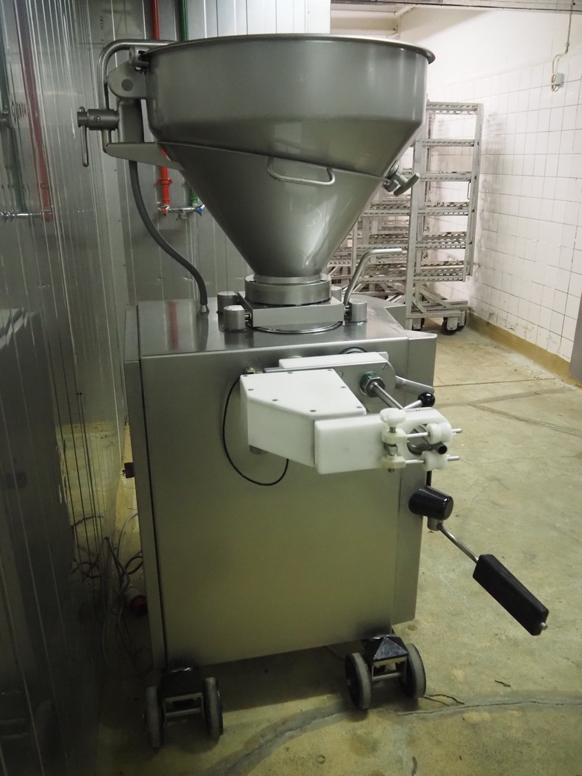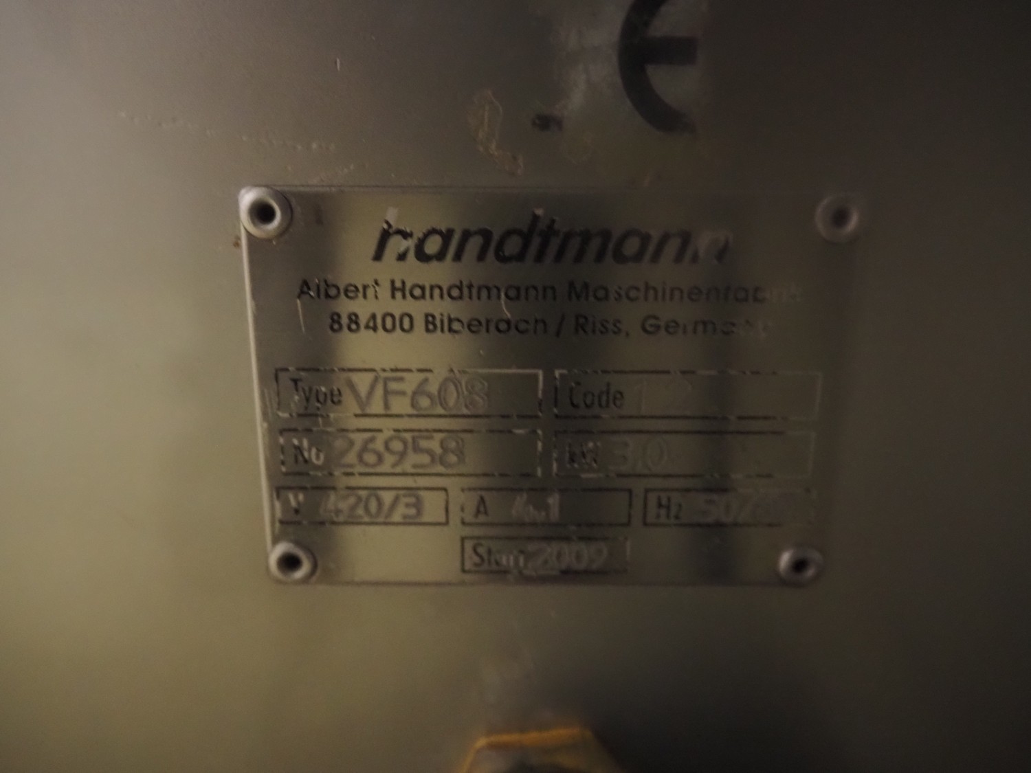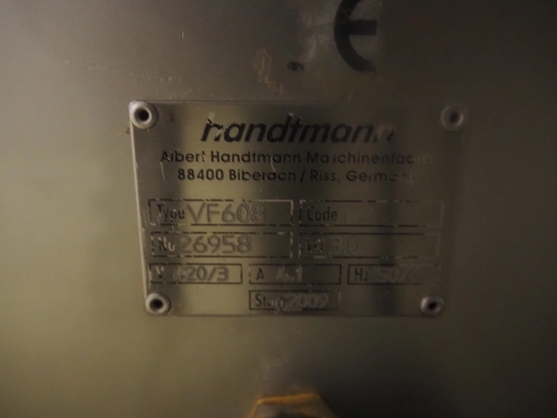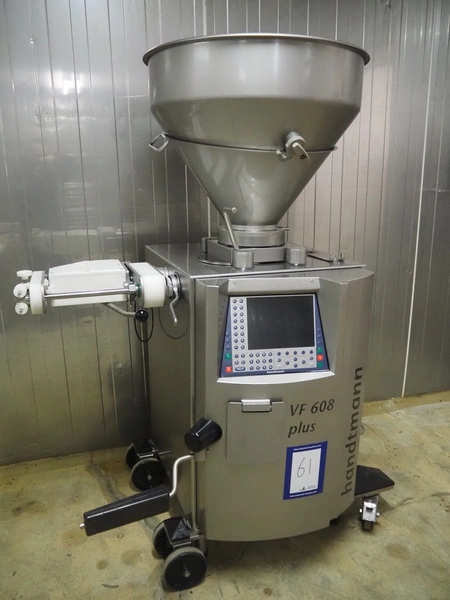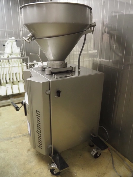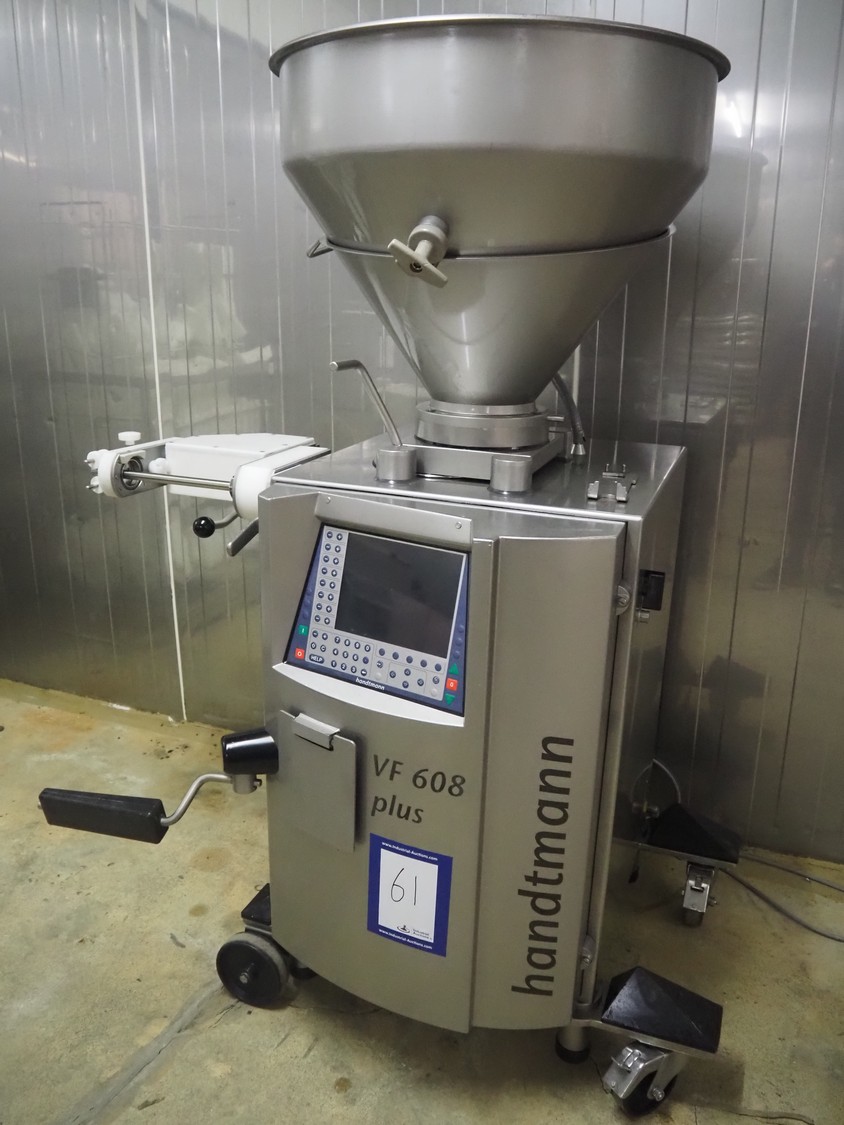 Handtmann mobile vacuum filling machine, type: VF608, number: 26958, year of construction: 2009, 420 V, 3 Ph, 50/60 Hz, 4.1 A, Busch vacuum pump, type: KC 0016 E, serial number: V19220655, capacity: 19 m³ per hour, total dimensions: 1350 mm x 900 mm x 1700 mm. Including linking gearbox and case holding device.