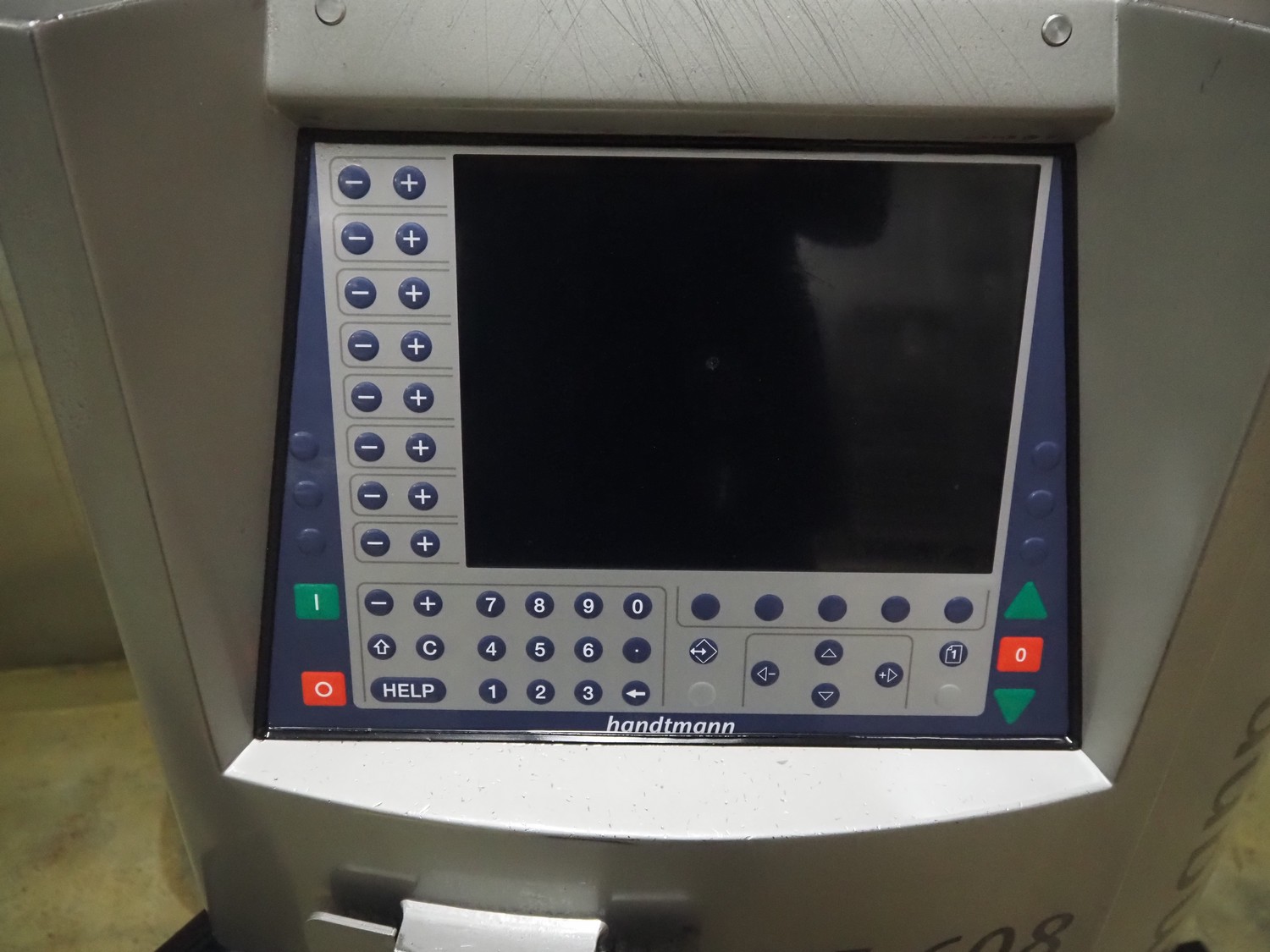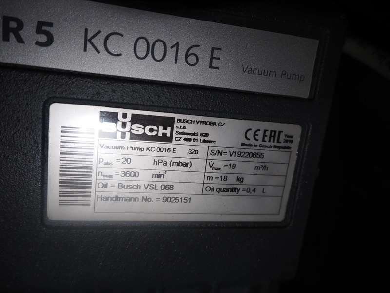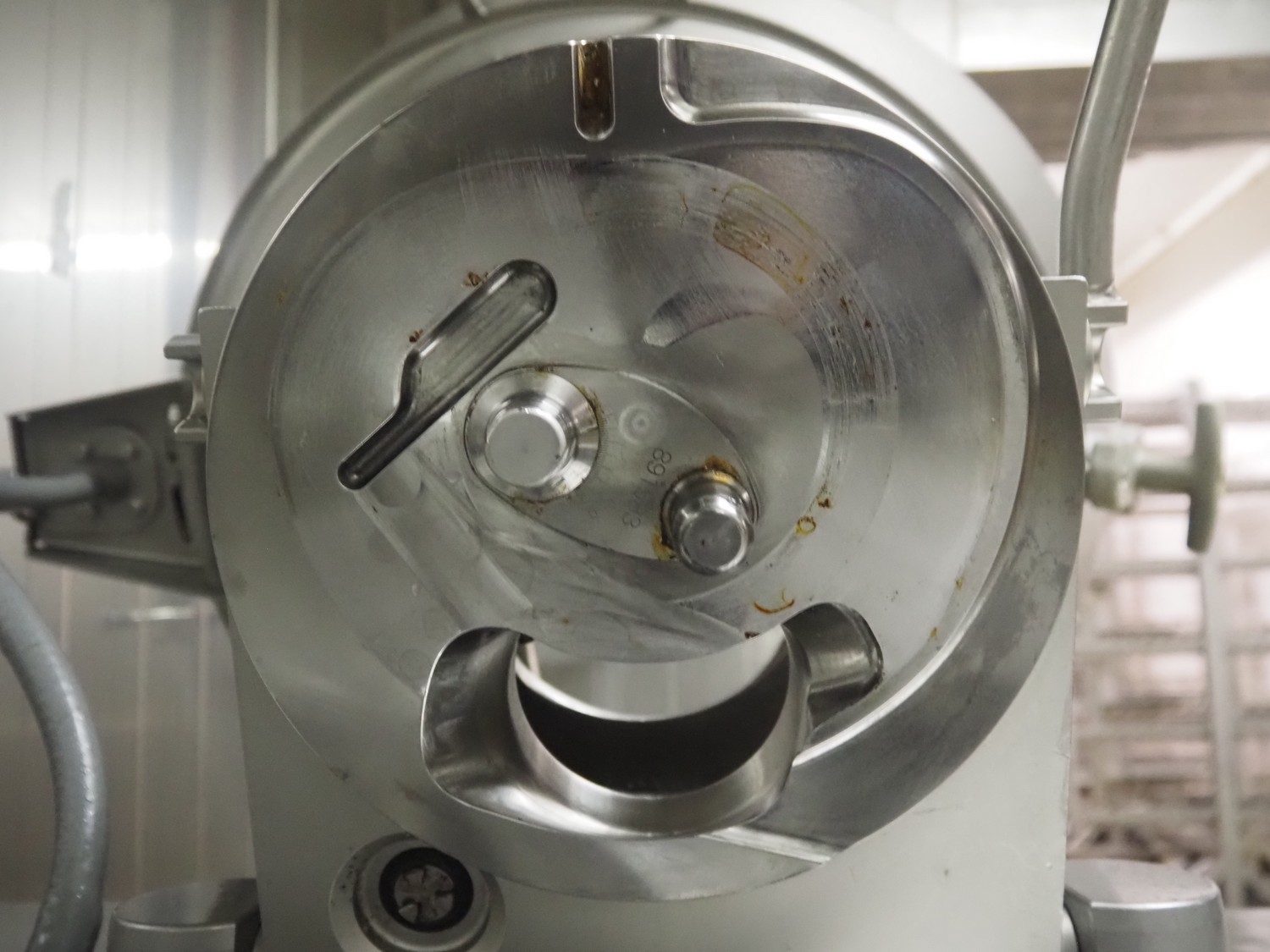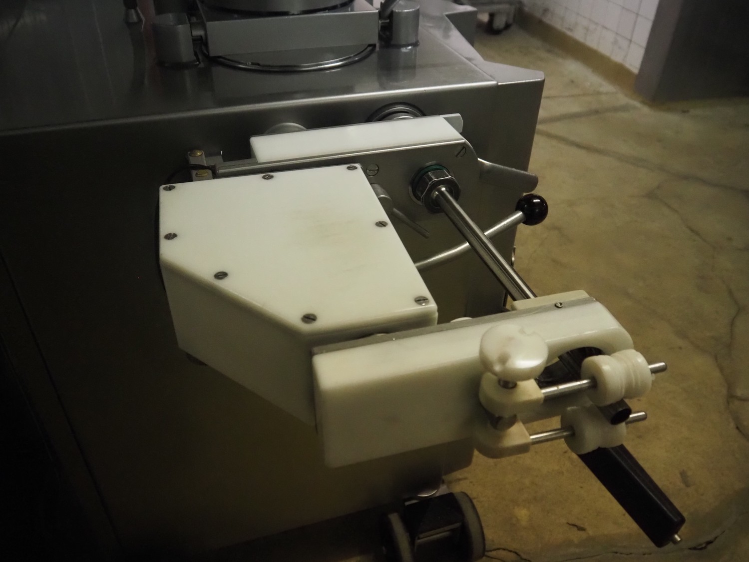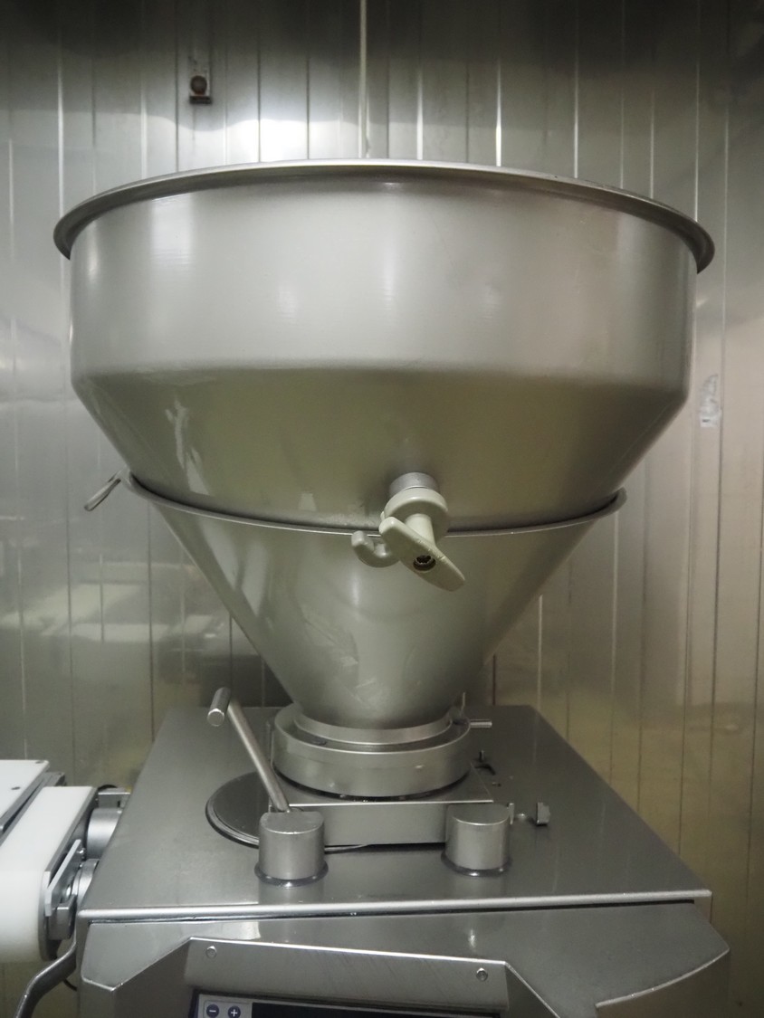 Handtmann mobile vacuum filling machine, type: VF608, number: 26958, year of construction: 2009, 420 V, 3 Ph, 50/60 Hz, 4.1 A, Busch vacuum pump, type: KC 0016 E, serial number: V19220655, capacity: 19 m³ per hour, total dimensions: 1350 mm x 900 mm x 1700 mm. Including linking gearbox and case holding device.