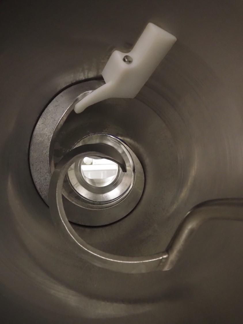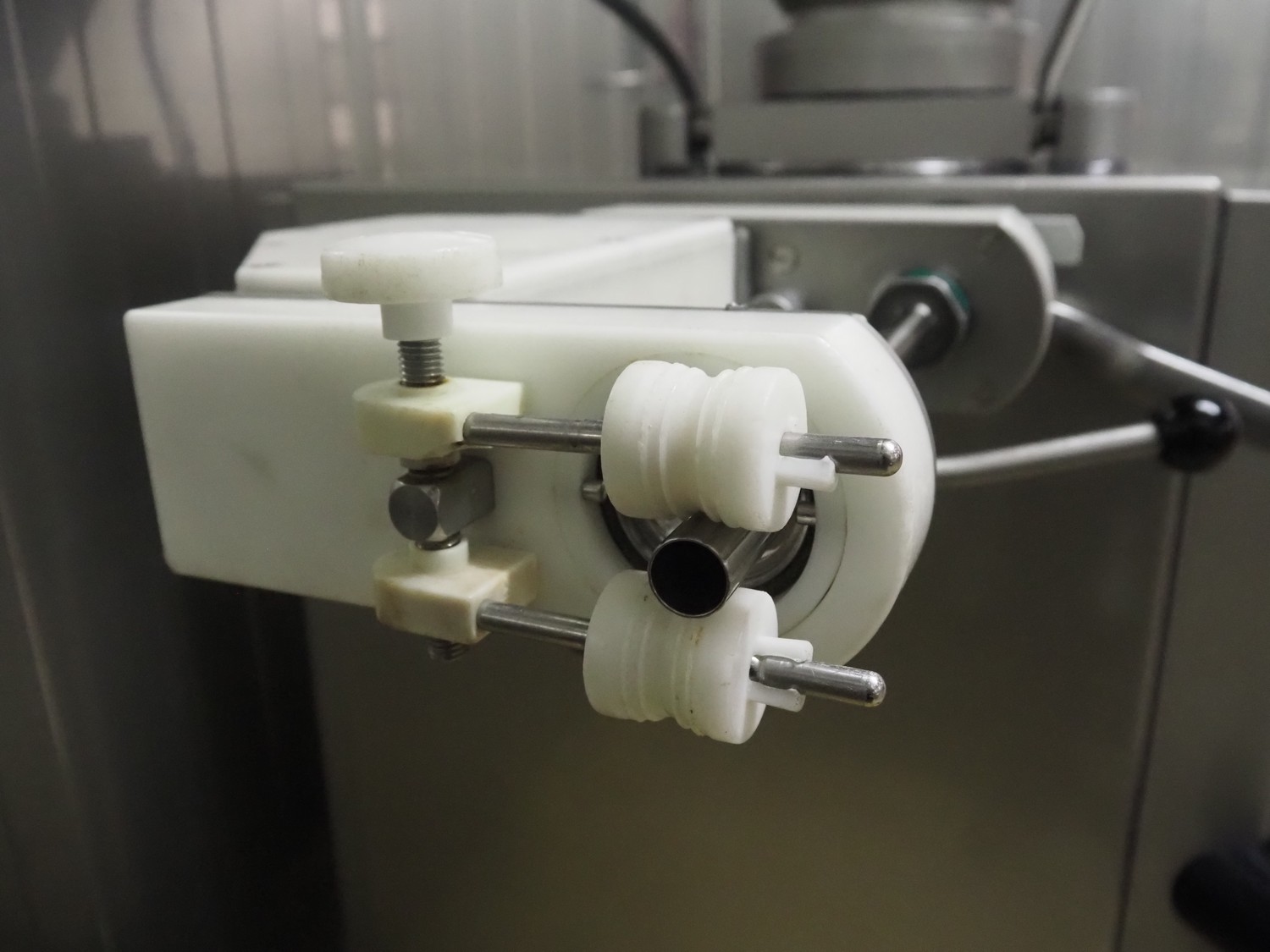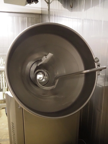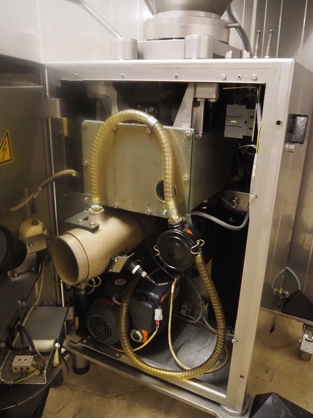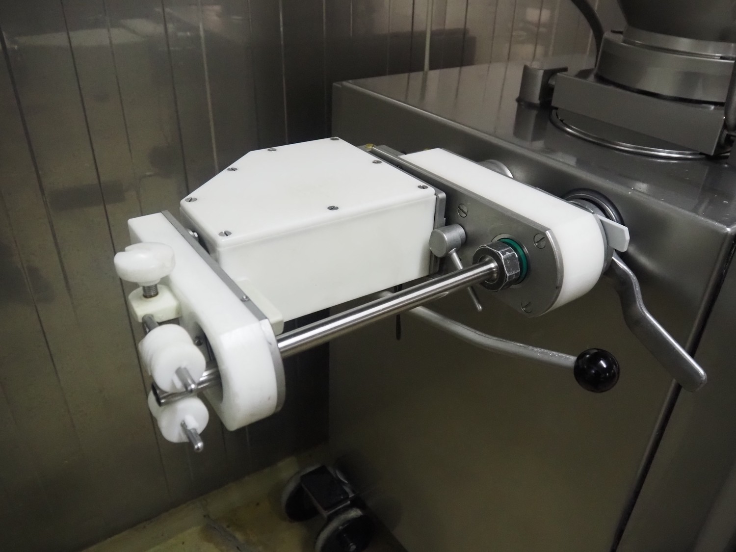 Handtmann mobile vacuum filling machine, type: VF608, number: 26958, year of construction: 2009, 420 V, 3 Ph, 50/60 Hz, 4.1 A, Busch vacuum pump, type: KC 0016 E, serial number: V19220655, capacity: 19 m³ per hour, total dimensions: 1350 mm x 900 mm x 1700 mm. Including linking gearbox and case holding device.
