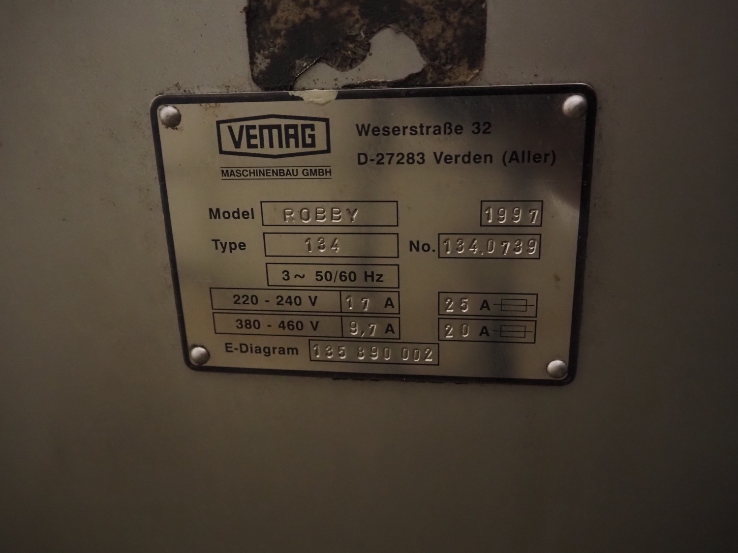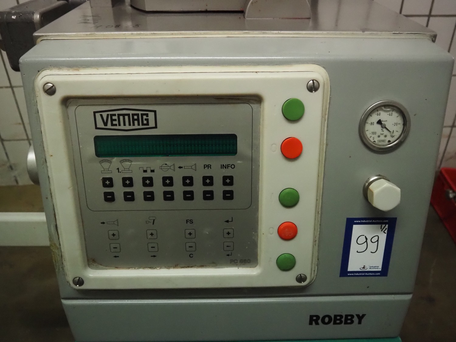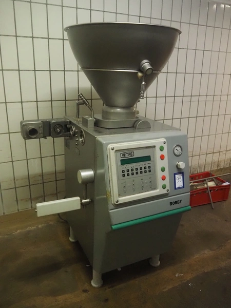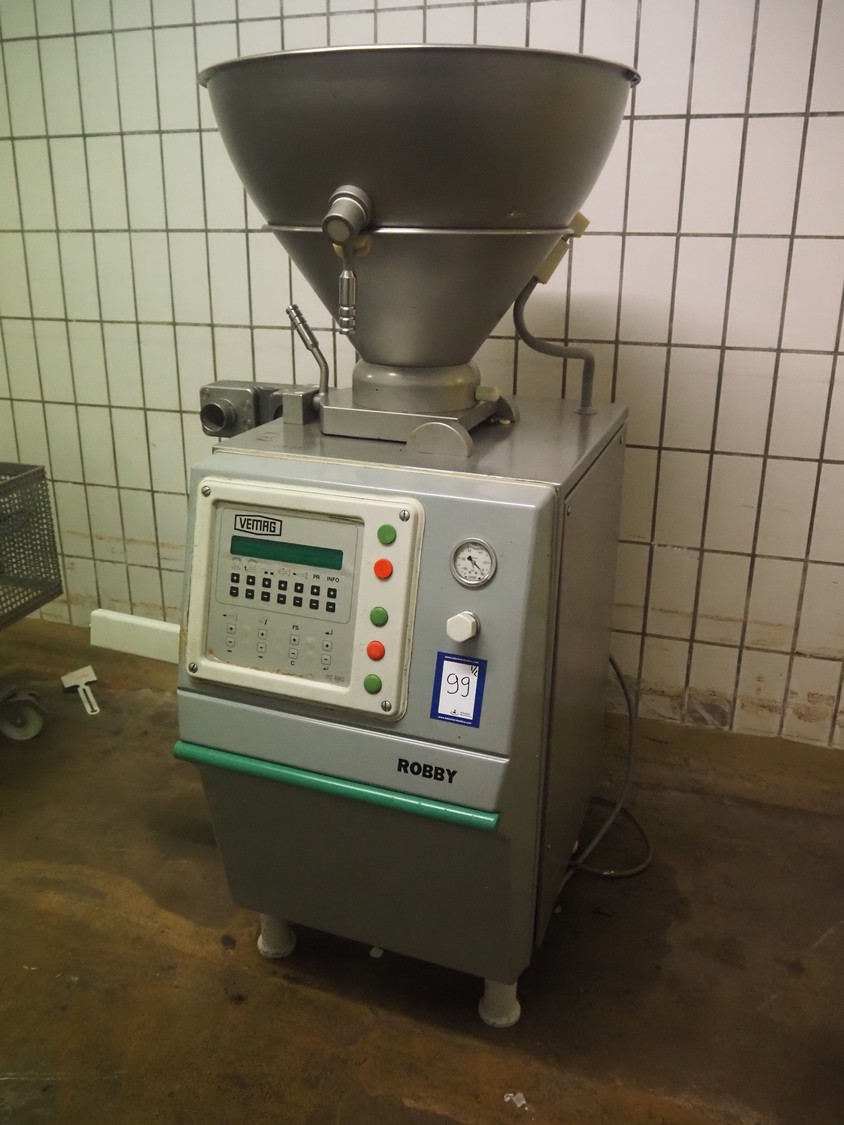 Vemag vacuum filling machine, model: Robby, type: 194, number: 1340739, year of construction: 1997, 220-460 V, 3 Ph, 50/60 Hz, 9.7-25 A, with Rietschle vacuum pump, type: VGA-20 and linking attachment, number: 8283899, total dimensions: 900 mm x 850 mm x 1650 mm. Including crate with parts, number linking attachment: 9370451.