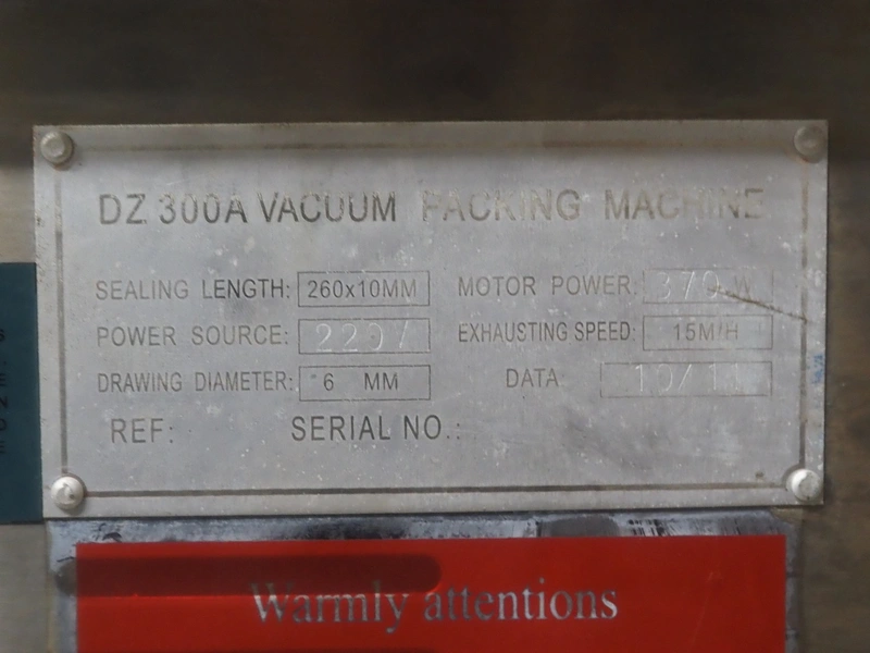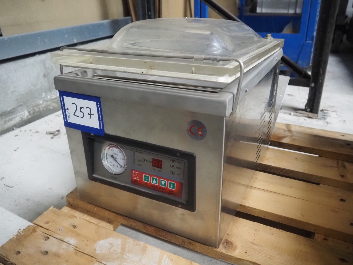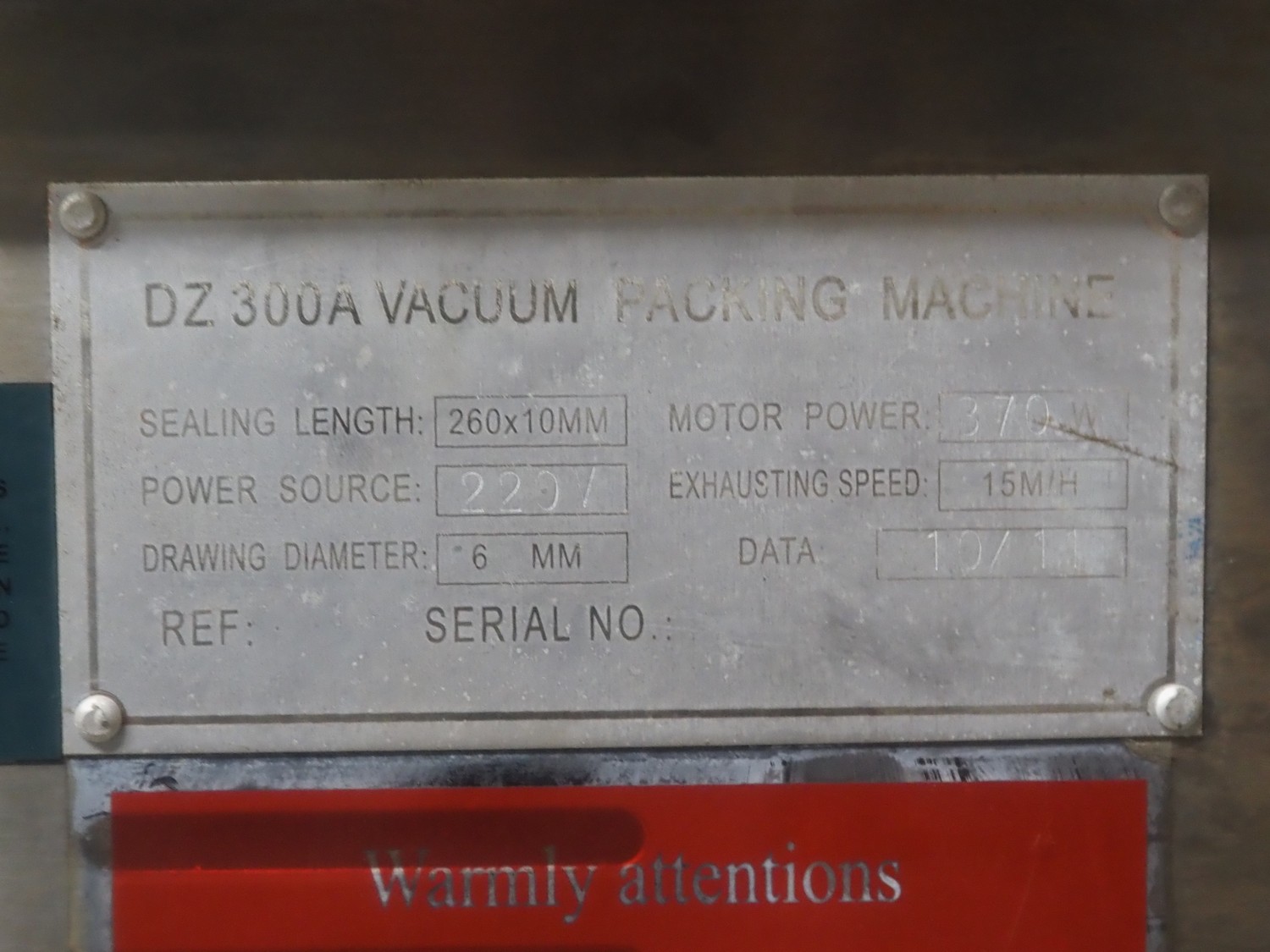 Vacuum machine, model: DZ 300A, 220 V, 370 W, seal length: 260 mm, dimensions chamber: 385 mm x 280 mm, total dimensions: 480 mm x 350 mm x 350 mm. Lot located in Winsen (DE), viewing and pick up in consultation with Industrial Auctions B.V.