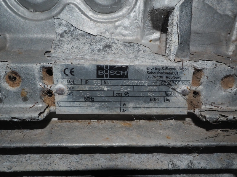 Busch vacuum pump, number: 0407072, 230/400 V, 50/60 Hz, 5.5 kW, dimensions: 1100 mm x 500 mm x 600 mm.