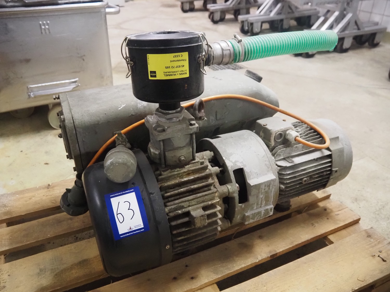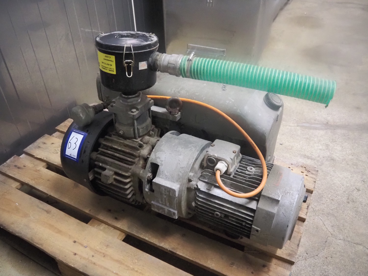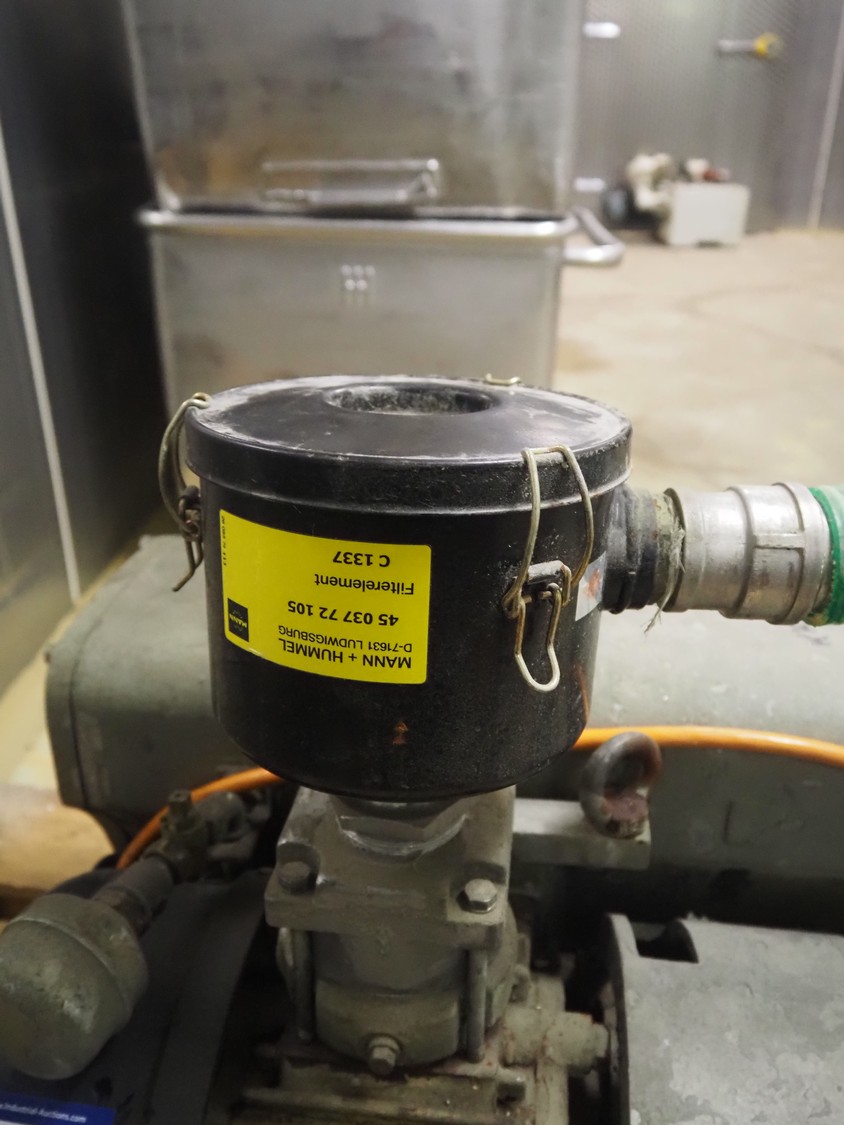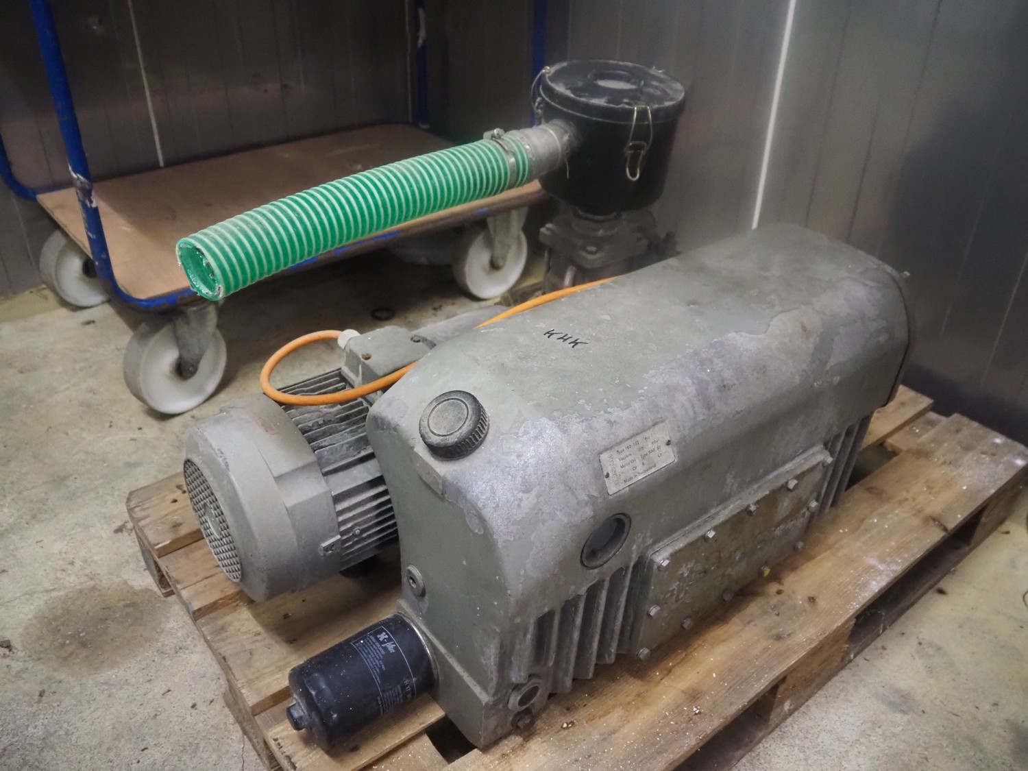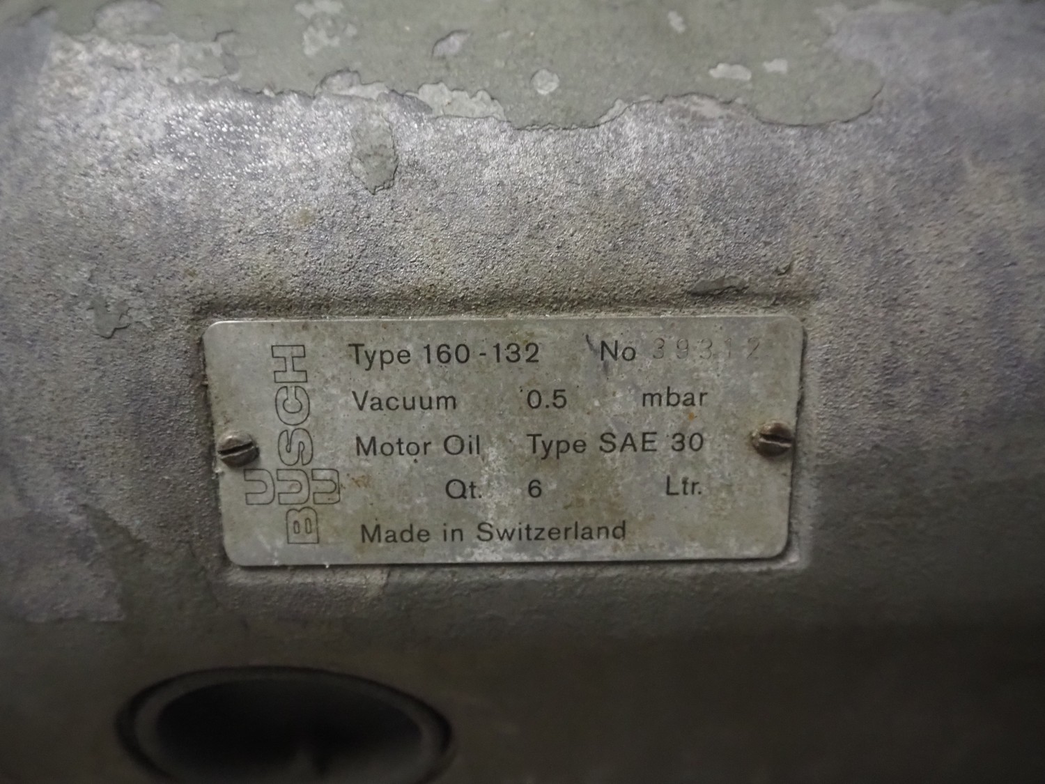 Busch vacuum pump, type: 160-132, number: 39312, capacity: 160 m³ per hour, dimensions: 800 mm x 500 mm x 620 mm.