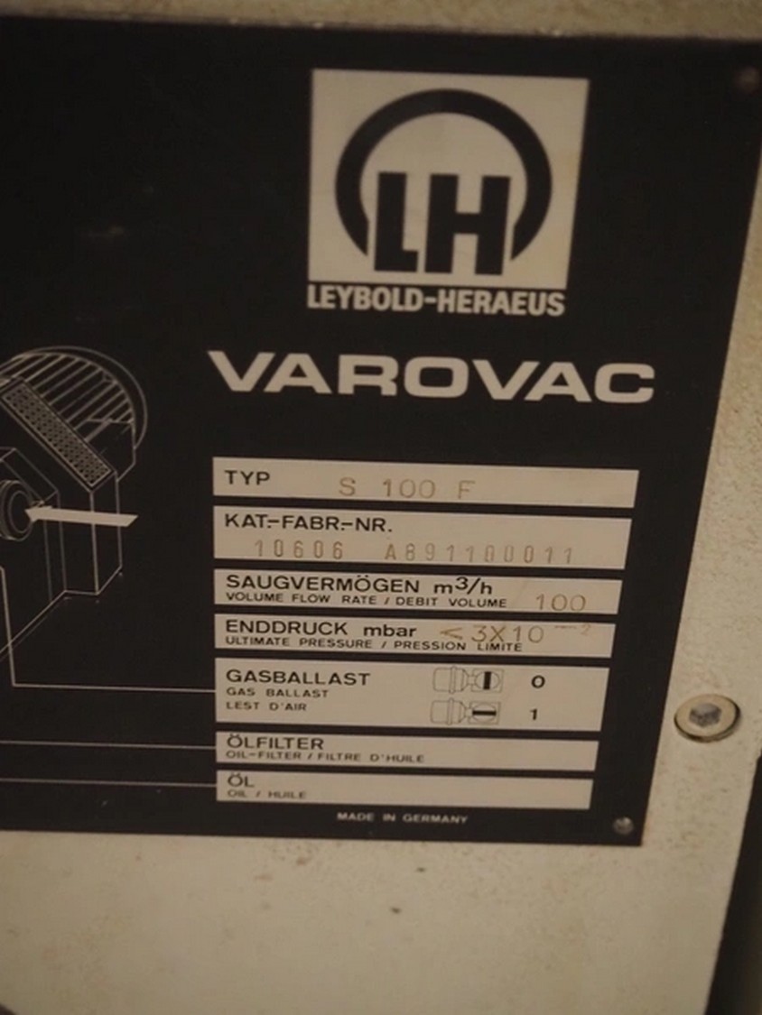 Leybold-Heraeus Varovac vacuum pump, type: S 100 F, fabrication number: 10606 A891100011, volume flow rate: 100 m³ per hour, dimensions: 700 mm x 500 mm x 400 mm.