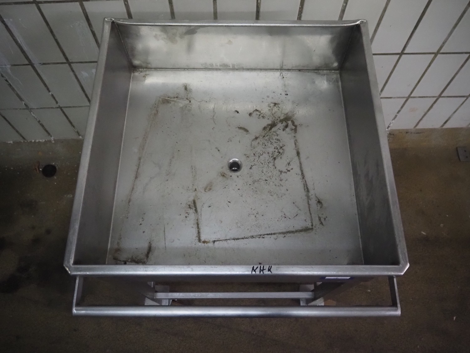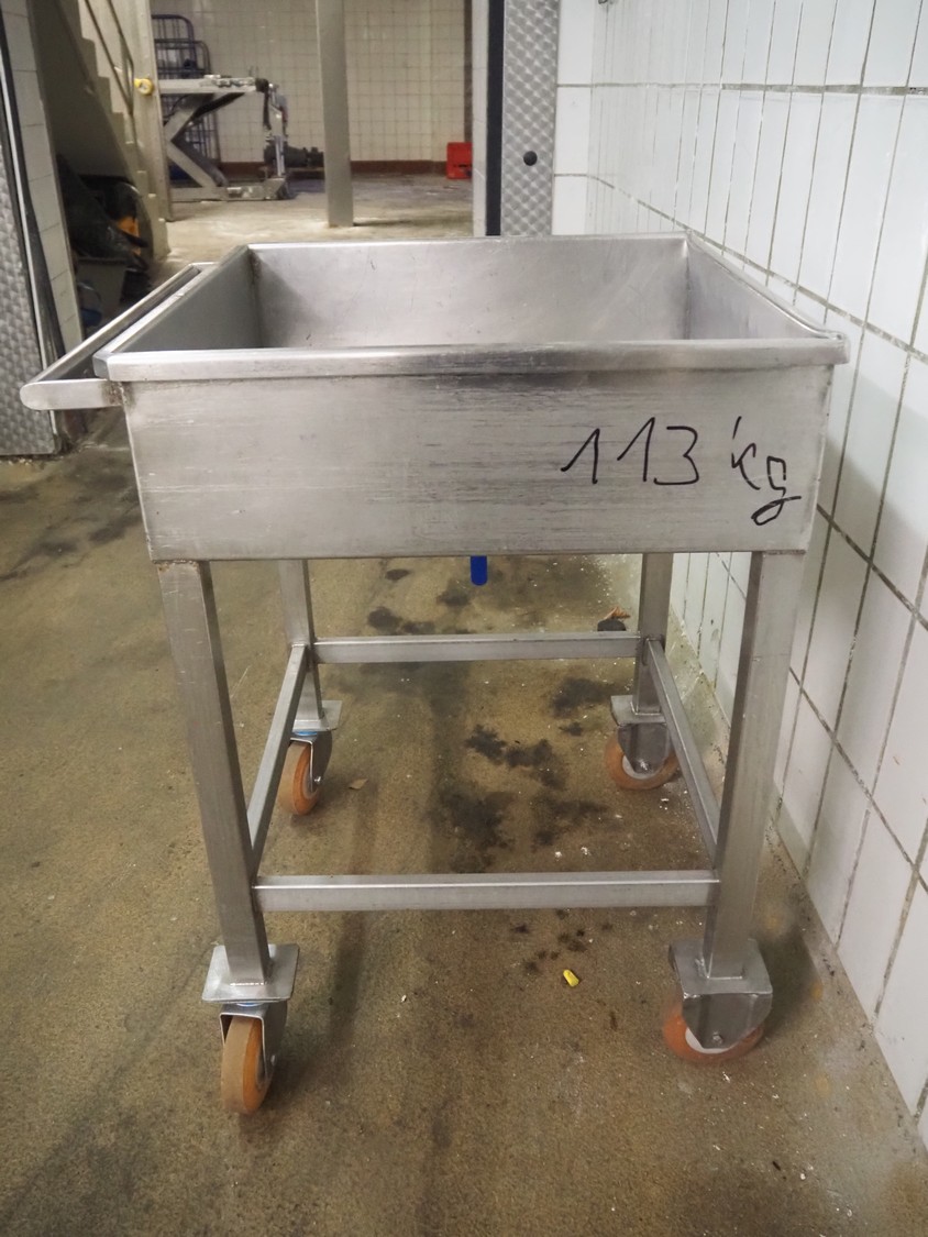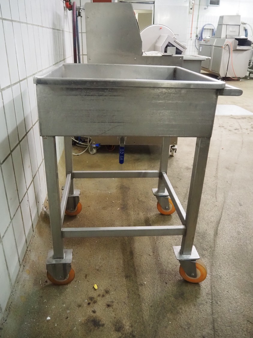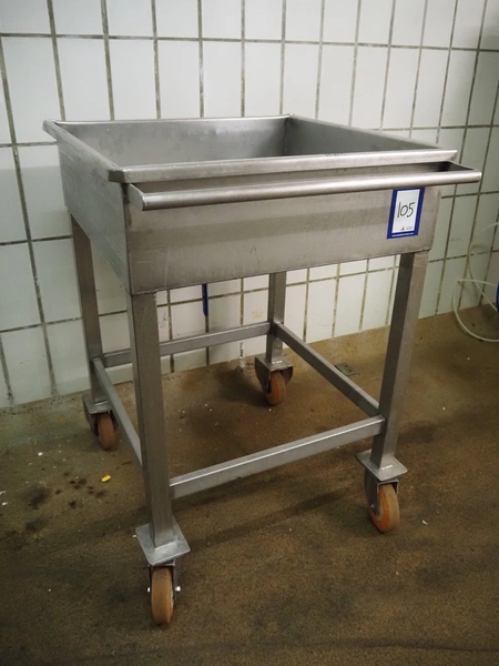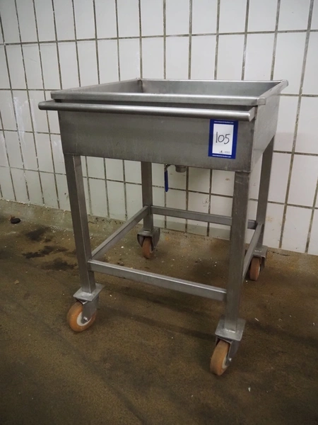 Mobile s/s tub with drain, inside dimensions: 600 mm x 580 mm, total dimensions: 700 mm x 650 mm x 900 mm.