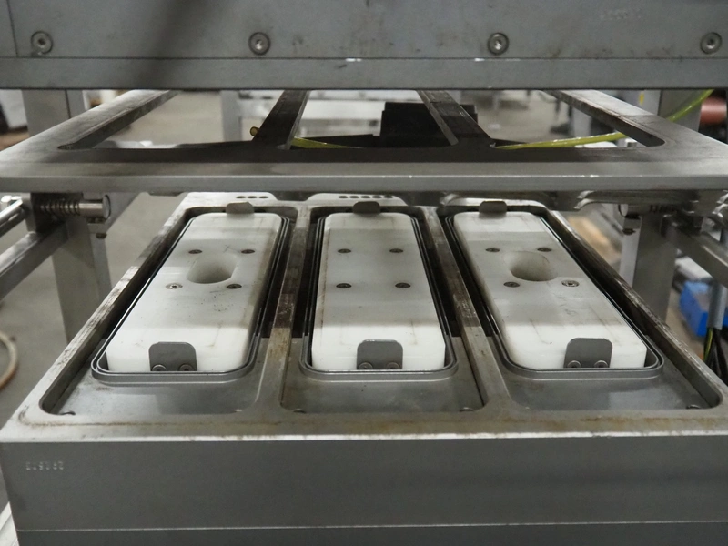 S/s trolley for Sealpac dyes, dimensions dyes: (3x) 90 mm x 295 mm, total dimensions: 750 mm x 750 mm x 1230 mm.