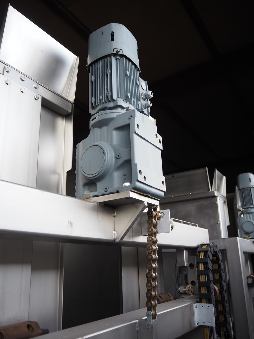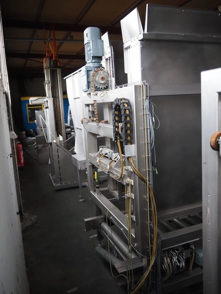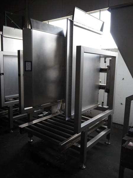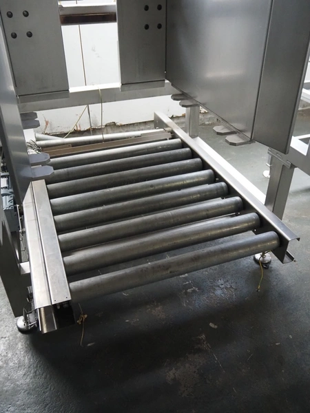 S/s pallet stacking and de-stacking machine, steel rollers, roller width: 900 mm, clearance: 1200 mm x 1020 mm, total dimensions: 1660 mm x 1430 mm x 2550 mm.