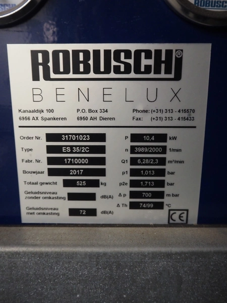 Robusch blower unit, type: ES 35/2C, factory number: 1710000, year of construction: 2017, capacity: 6.28/2.3 m³/min, weight: 525 kg, dimensions: 1200 mm x 1200 mm x 1300 mm.
