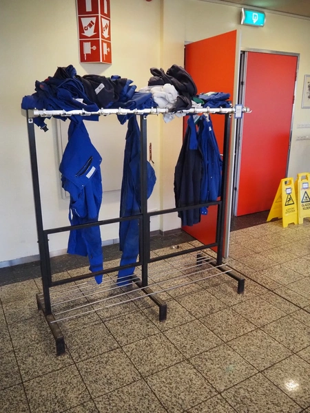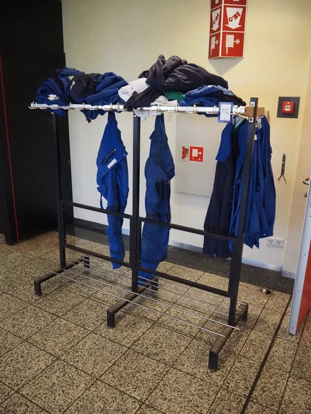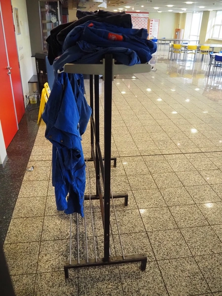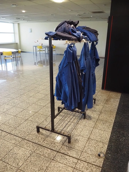 Steel coat rack, dimensions: 1500 mm x 600 mm x 1500 mm.