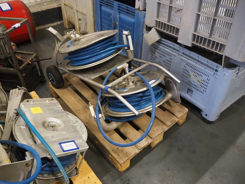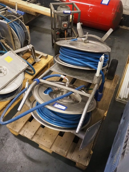 Pallet with 2 s/s hose reels with hose, dimensions pallet: 1200 mm x 800 mm x 800 mm.