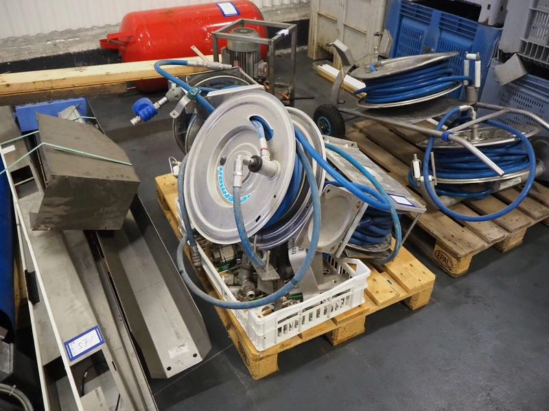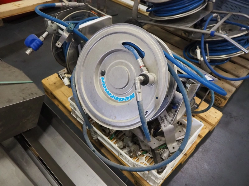 Pallet with 3 Nederman s/s hose reels with hose, dimensions pallet: 1200 mm x 800 mm x 800 mm.
