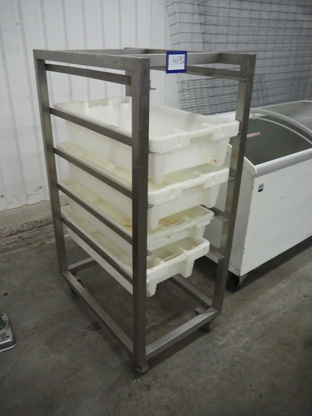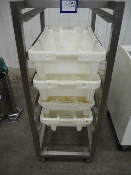 Steel trolley with 4 plastic crates, 5 floors, dimensions crate: (4x) 445 mm x 800 mm x 180 mm, total dimensions: 545 mm x 825 mm x 1390 mm.