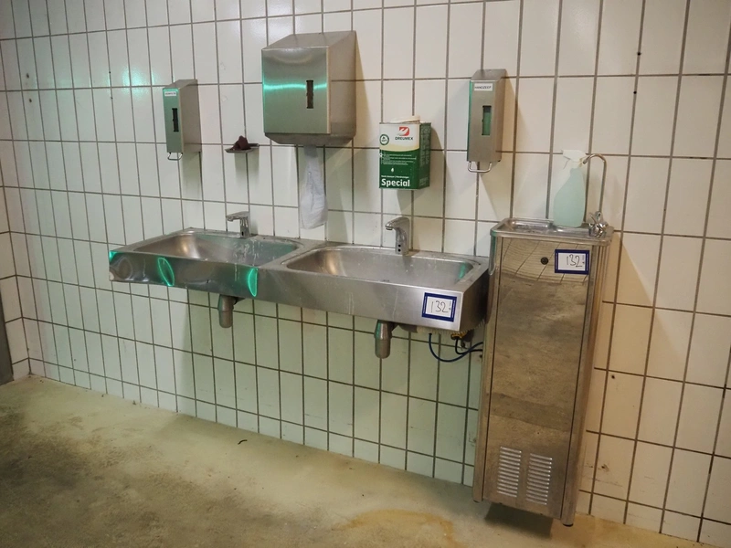 Franke s/s sink with 2 faucets, sensor control, dimensions: 1400 mm x 500 mm x 300 mm and water fountain, dimensions water fountain: 350 mm x 250 mm x 1200 mm. Including 2 s/s soap dispensers and s/s paper dispensers.