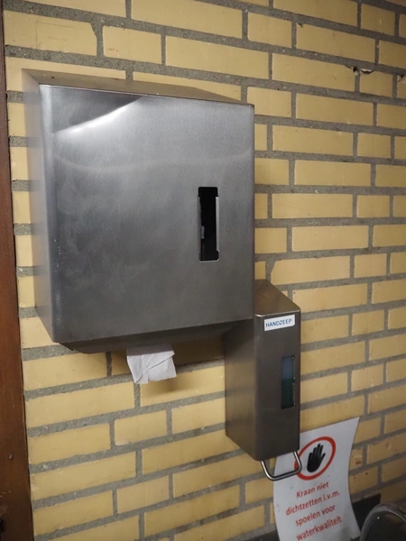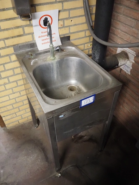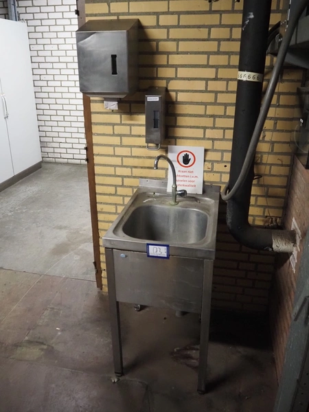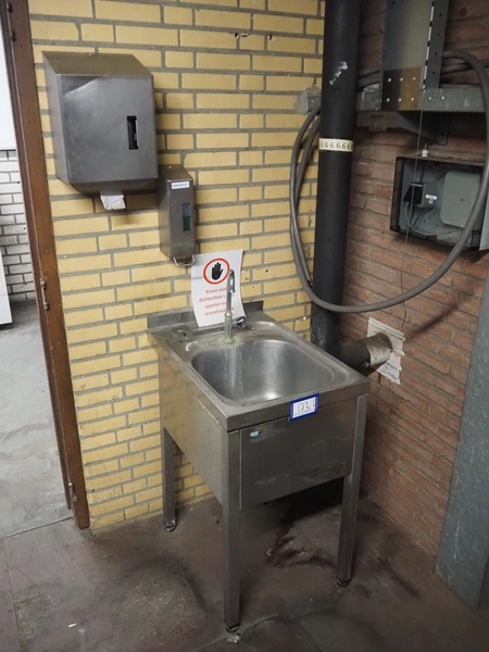 S/s sink, dimensions: 700 mm x 500 mm x 1200 mm. Including s/s soap dispenser and s/s paper dispenser.