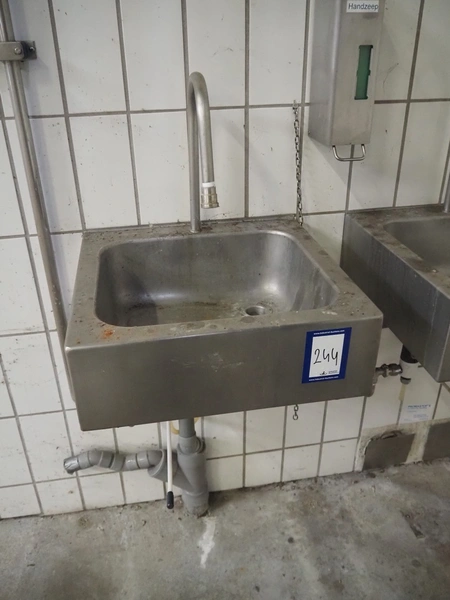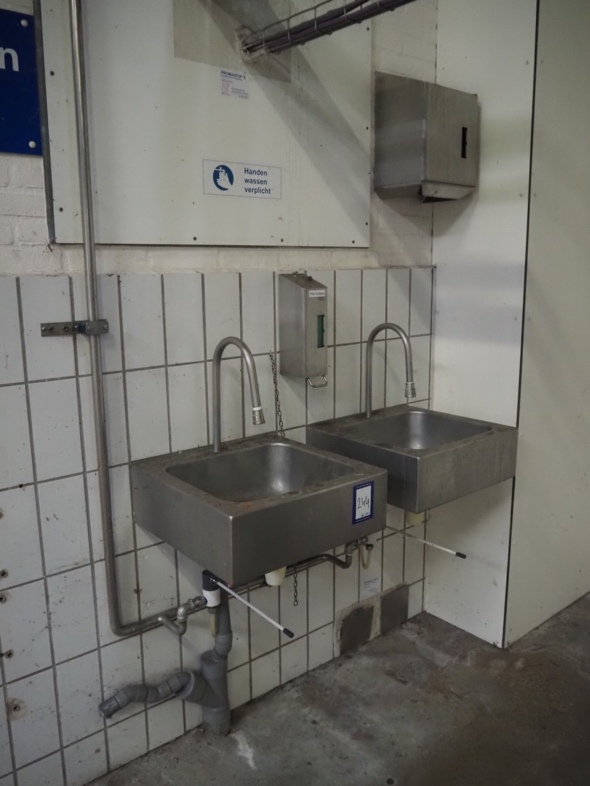 2 s/s sinks, knee control, dimensions: (2x) 480 mm x 460 mm x 550 mm, s/s soap dispenser, s/s paper dispenser.