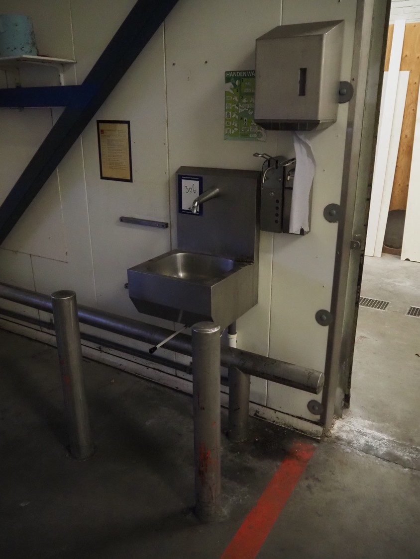 S/s sink, knee control, dimensions: 450 mm x 450 mm x 670 mm, 2 s/s soap dispensers, s/s paper dispenser.