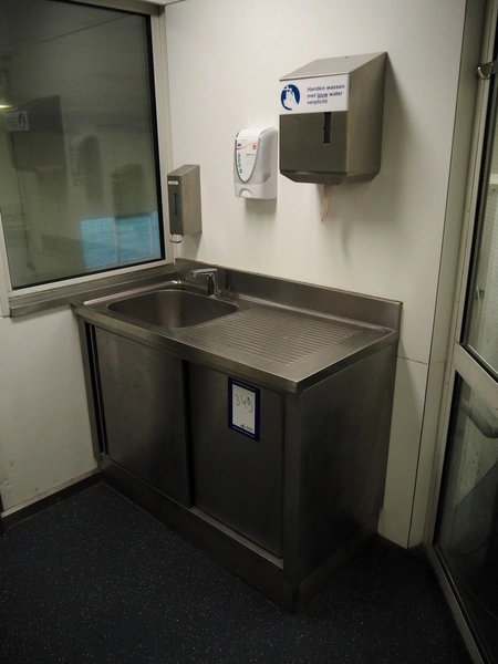 S/s sink, dimensions: 1200 mm x 600 mm x 1000 mm. Including 2 soap dispensers and s/s paper dispenser.