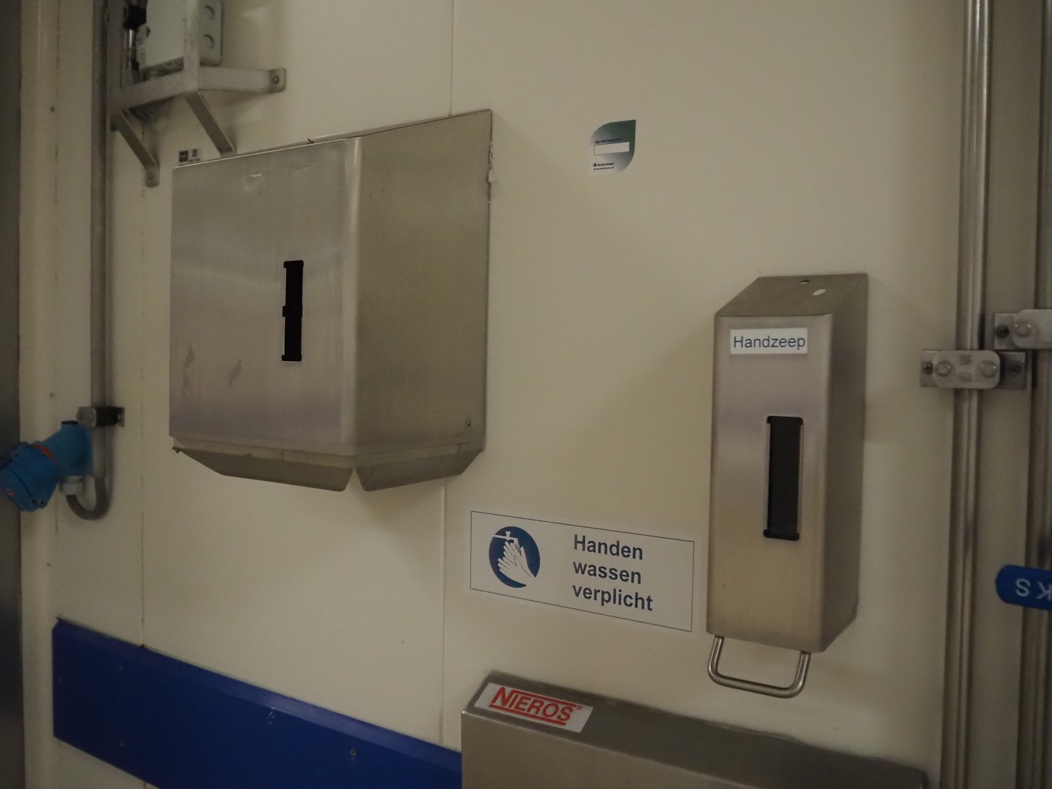 Nieros s/s sink, knee control, dimensions: 450 mm x 450 mm x 670 mm. Including s/s soap dispenser, s/s paper dispenser and Gardena control box.