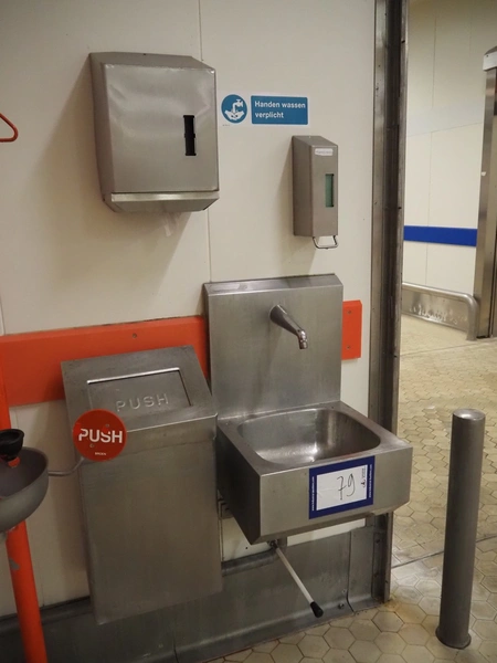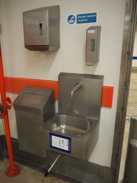 Nieros s/s sink, knee control, dimensions: 450 mm x 450 mm x 670 mm. Including s/s soap dispenser, s/s waste bag holder and s/s paper dispenser.