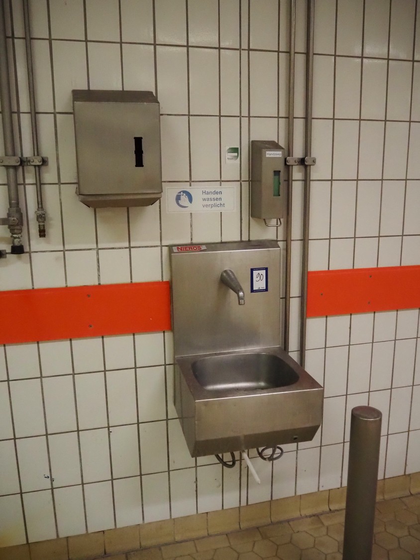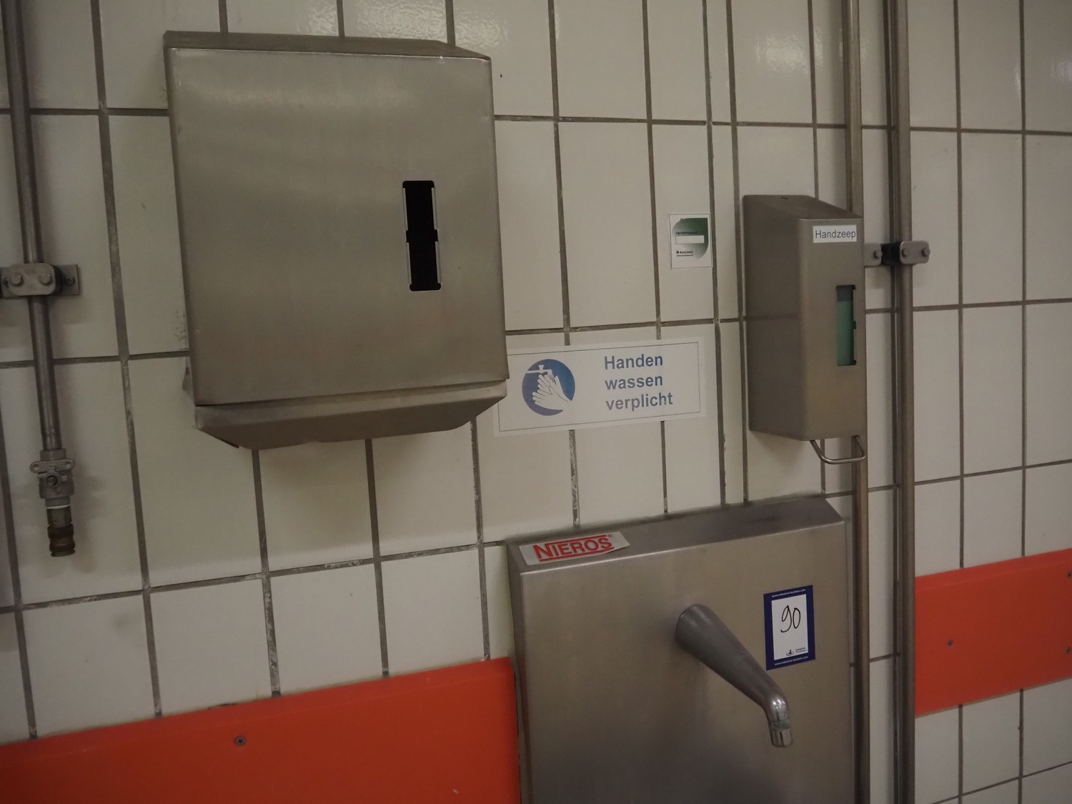 Nieros s/s sink, knee control, dimensions: 450 mm x 450 mm x 670 mm. Including s/s soap dispenser and s/s paper dispenser.