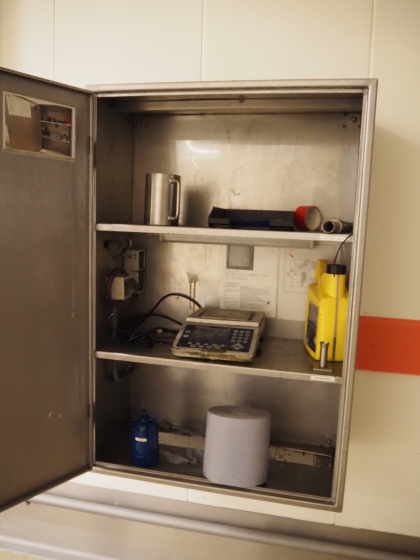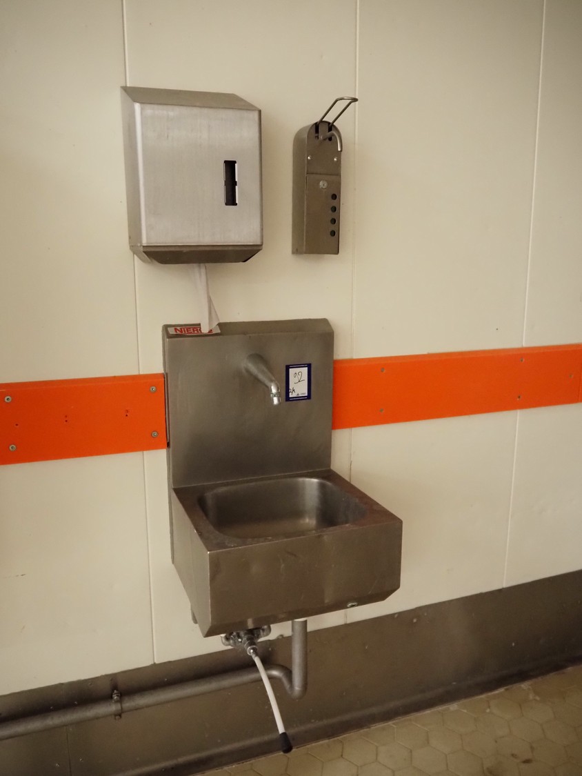 Nieros s/s sink, knee control, dimensions: 450 mm x 450 mm x 670 mm. Including s/s soap dispenser, s/s paper dispenser and s/s cabinet, dimensions: 810 mm x 450 mm x 1200 mm.